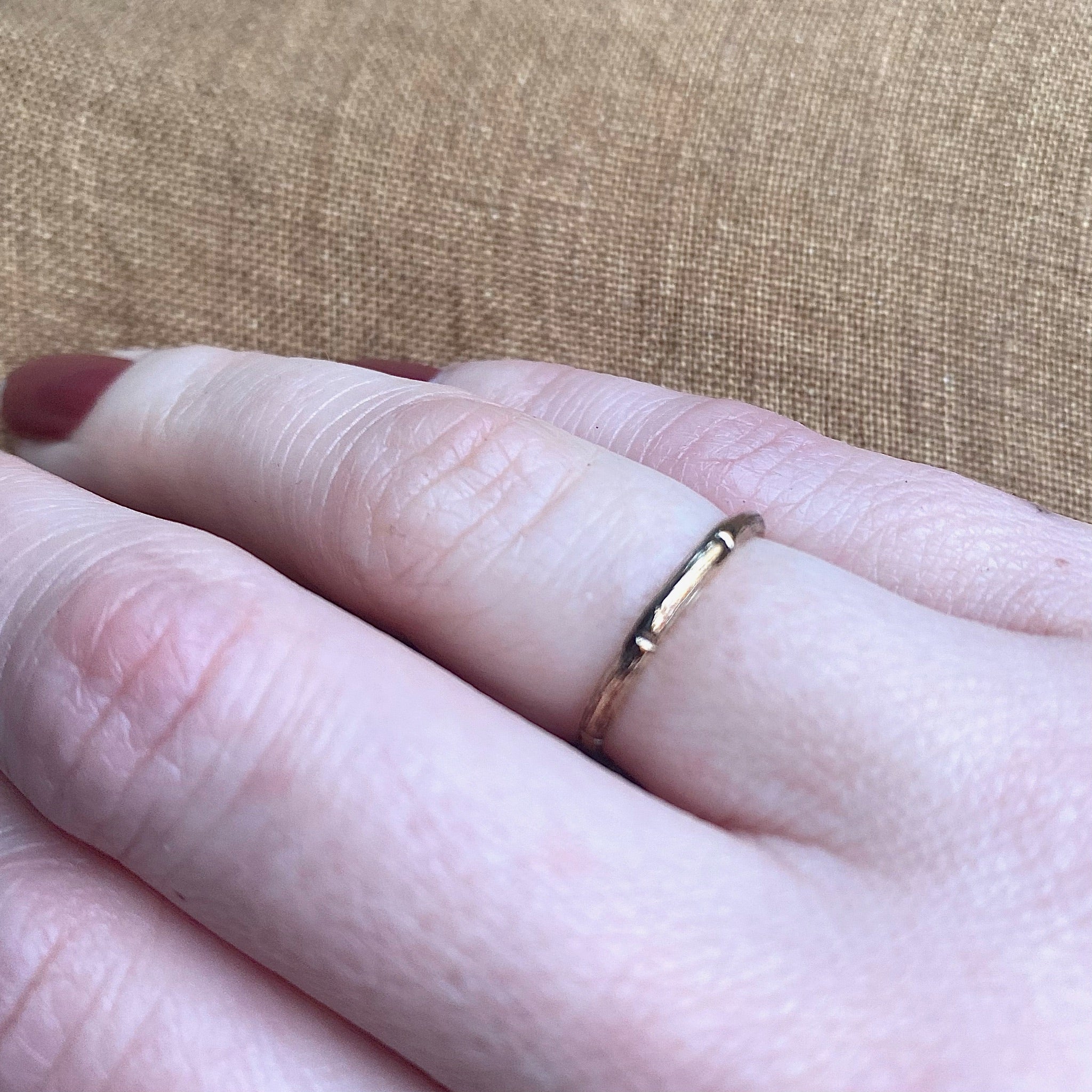 This fun and funky band is in the form of bamboo, cast in 14k yellow gold. It has a subtle bloom that adds dimension and texture to the details. This will make an unusual wedding ring or a fun addition to your stack. Circa 1960.