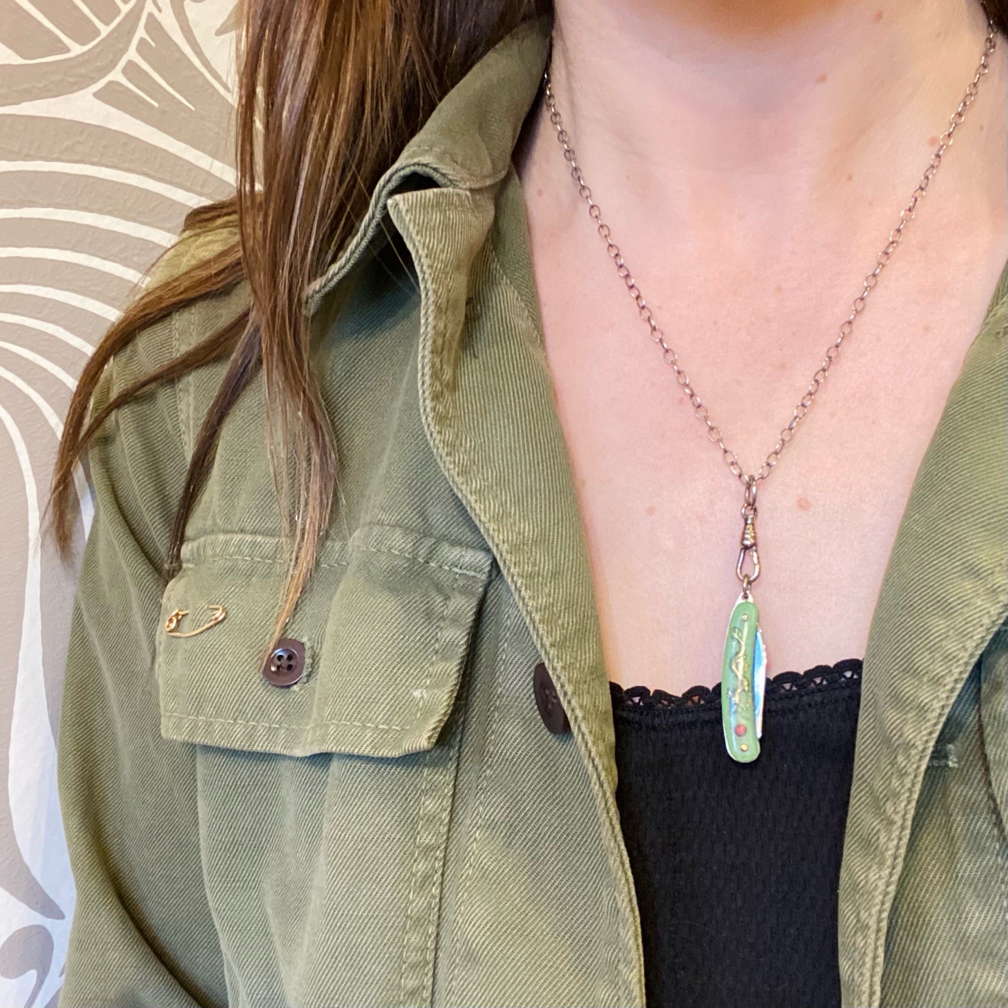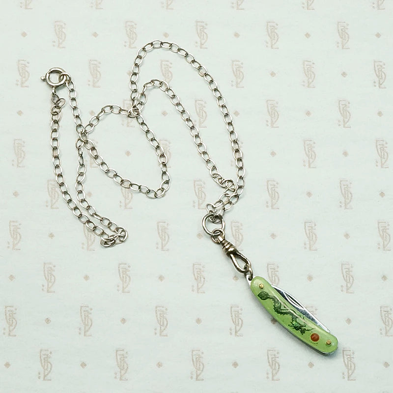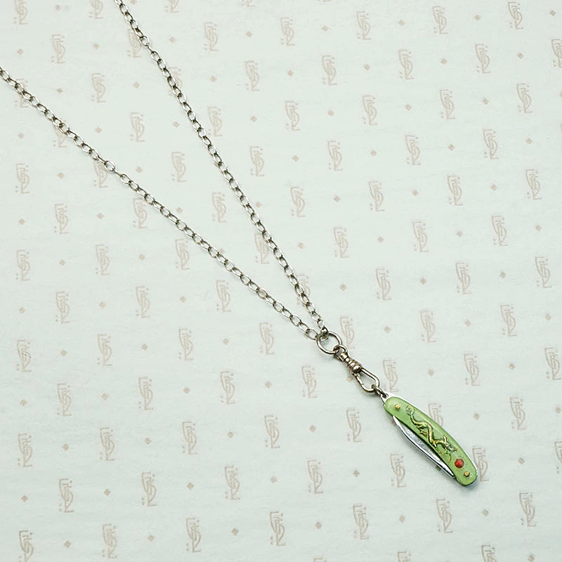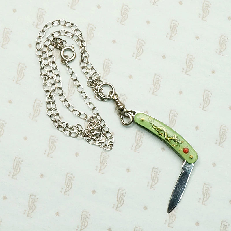 This fabulous tiny vintage folding knife necklace is a practical and stylish accessory. A sinuous dragon writhes along the green blade case. The case holds a single blade. The colorful knife hangs from a recycled sterling silver swivel watch hook necklace. You never know when you will need a useful little blade, and this one is so kitschy and fun. Circa 1950.