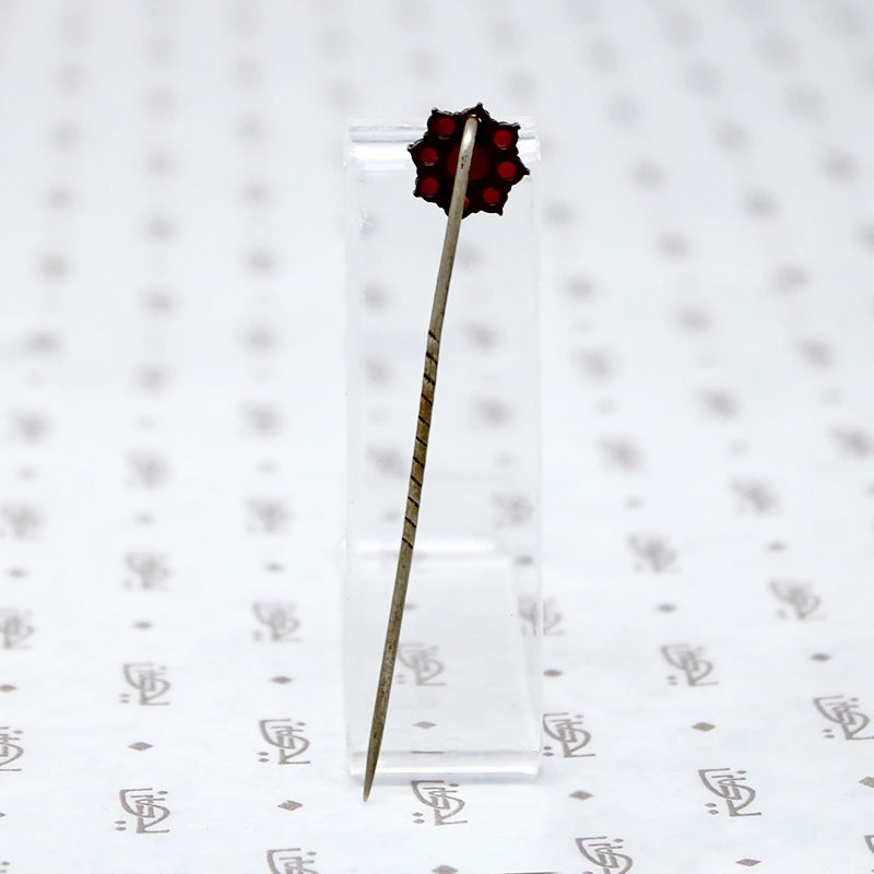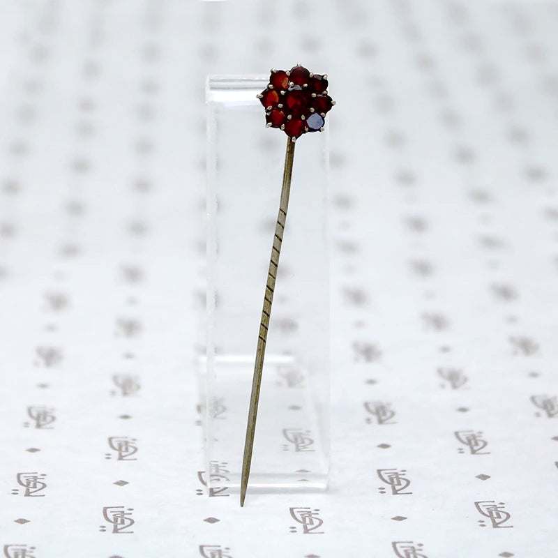 A lovely silver gilt stick pin topped with a cluster of garnets. The rich, wine-colored garnets are set to form a pretty flower. The silver pin has a twist. Stick pins are equally fabulous worn on your lapel or scarf. Circa 1920.