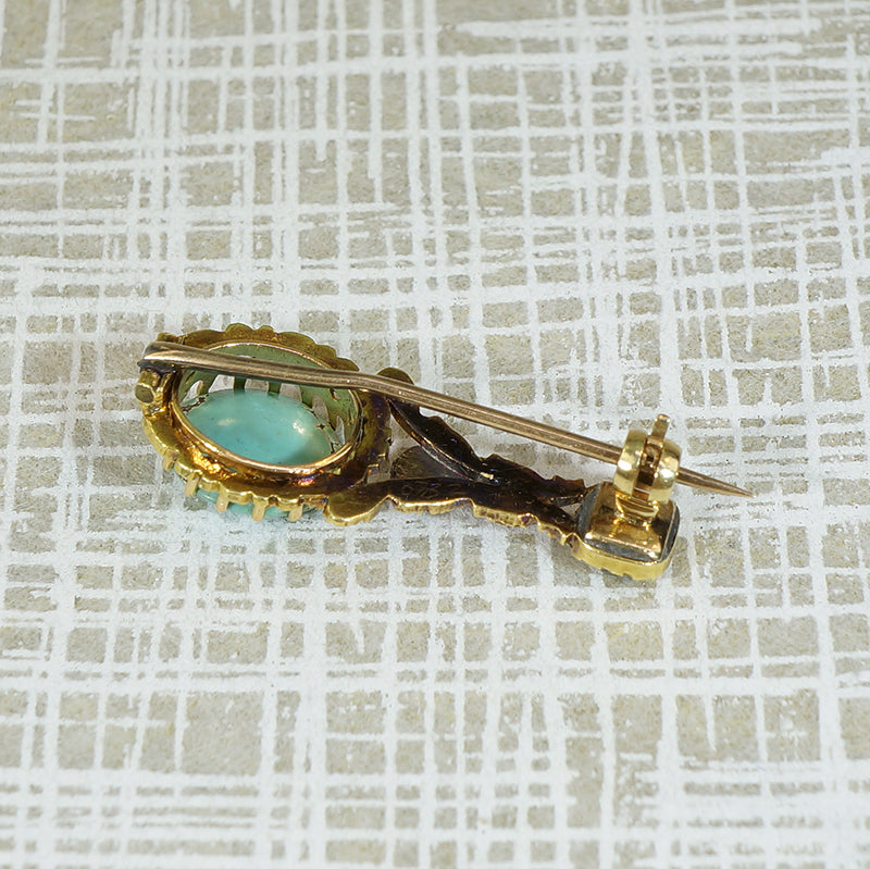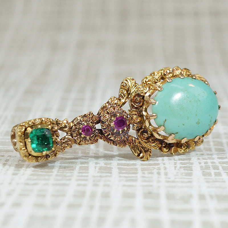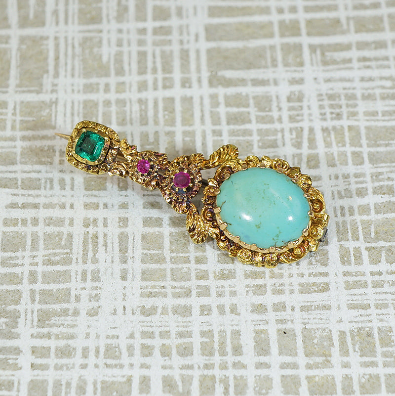 When Halley's Comet lit up the skies in 1835 people were mesmerized and the jewelers of the time so inspired that brooches in the shape of the comet were quickly seen on fashionable women of the era. This beautiful example is crafted of 18k yellow gold and set with an oval turquoise in a hand fashioned floral border, the tail of the comet features two Rubies and an Emerald in pie crust bezels. Solid 18k yellow gold, natural gemstones, circa 1835-45.