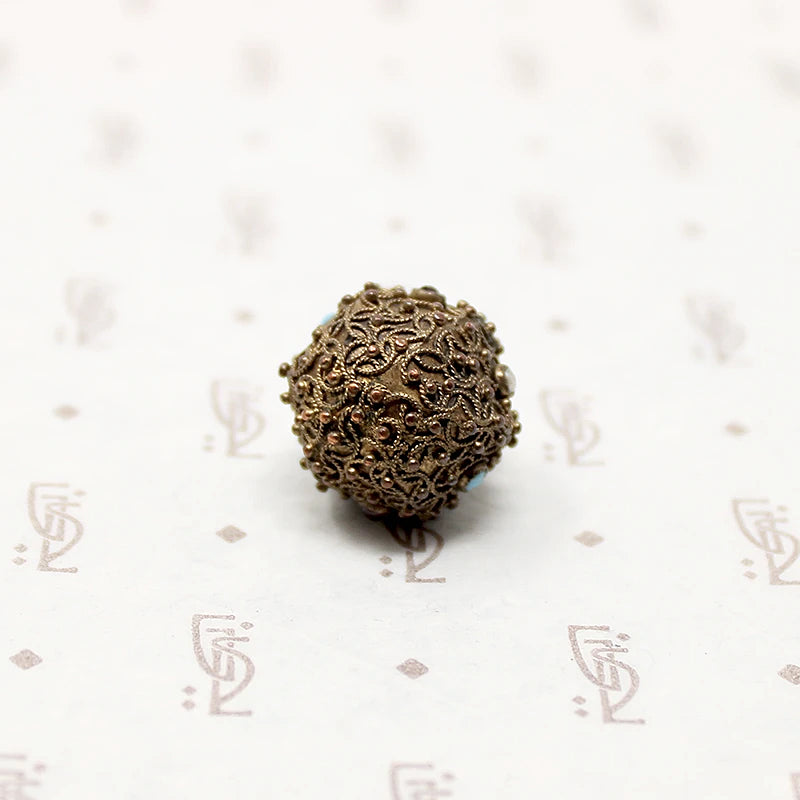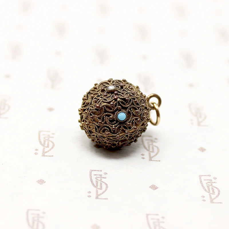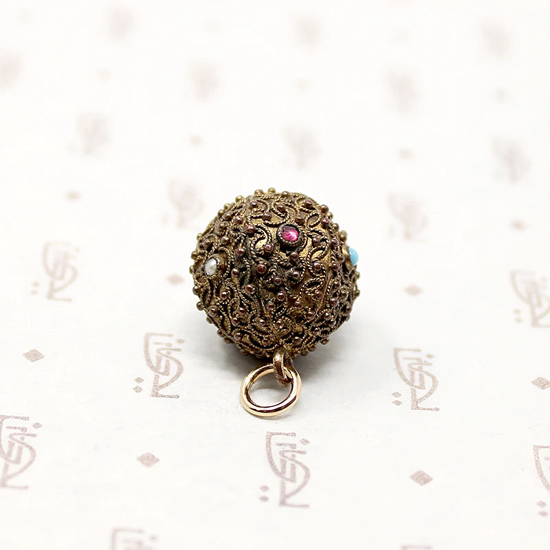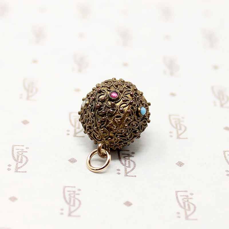This interesting Etruscan Revival fob is set with tiny gems surrounded with applied wire and bead work. The gold-filled ball is covered with Archeological-inspired filigree designs. Wee garnets, pearls, and turquoises are bezel set around the ball's circumference. A warm patina gives the fob that irresistible antique glow. A pretty Victorian fob with an integrated bale and jump ring making it easy to wear the piece any way you like. Circa 1870.