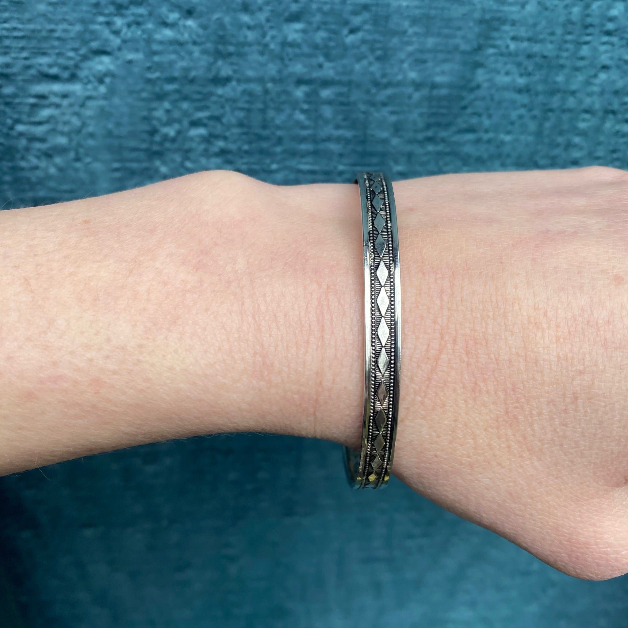 This vintage sterling silver bangle is girded by a pattern of raised diamonds and beaded, flat edges. This stylish bracelet will add some classic Deco geometry to your bangle stack. The interior of the bracelet is stamped "Sterling." Circa 1930.