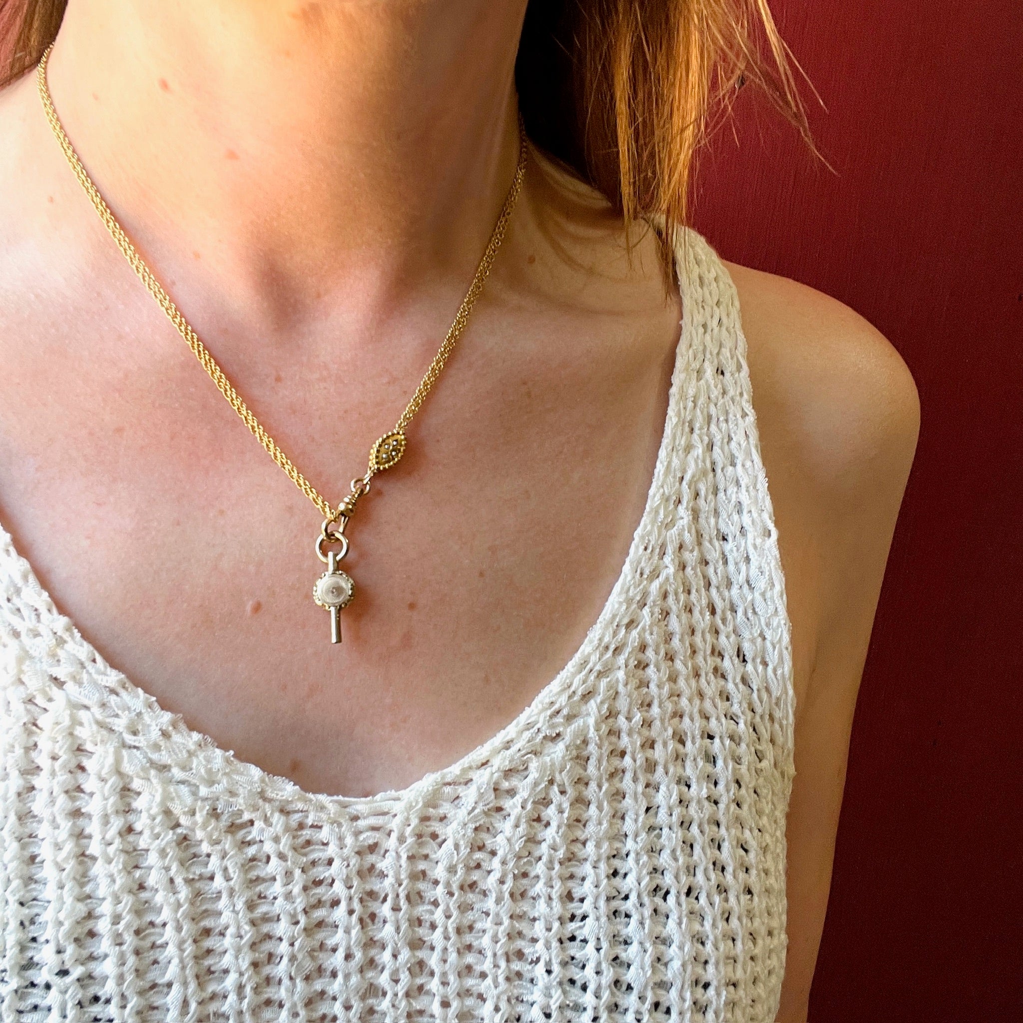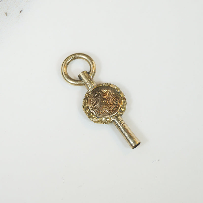 Before watches were wound by twisting the stem, a key (like this one) was fitted to a gear at the back of the watch to wind the piece. Since it was necessary to carry the key with the watch, these keys often took fanciful forms and were used as decorative fobs on the watch chains alongside the watches. Now, we wear the lovely old watch keys as pendants.