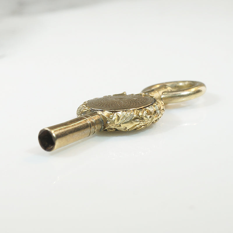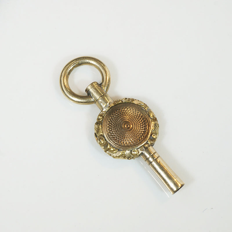 This Georgian watch key is 12k gold and gold-sheeted steel. Gold is too soft for use in a winding tool; the winders were made of steel and then covered in a sheet of gold. The decorative portion of the key features a machine-engraved disc set within a floral engraved surround. Such a lovely thing will look great worn on one of our Ancient Influences married chains. Circa 1820.