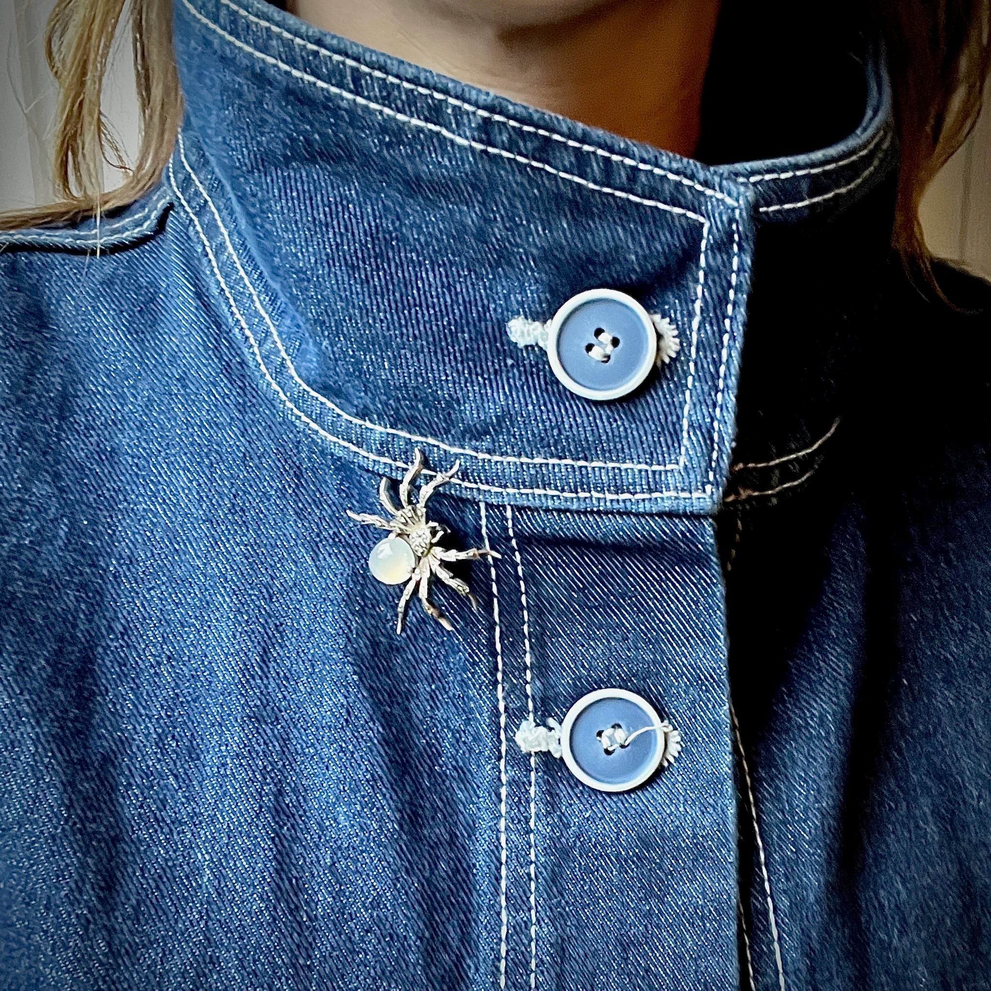 A German Art Deco spider brooch with a marcasite-studded thorax and glossy moonstone abdomen. The spider is sensitively sculpted in sterling silver; his anatomy is very detailed, with creepy little palps and long segmented legs. The oval moonstone cabochon is prong set. The underside of his legs is marked "Germany" and "Sterling." Beautiful, if slightly unnerving, just the way we like it. Circa 1920.