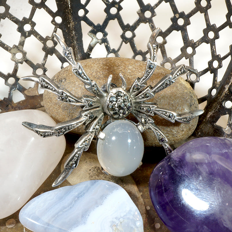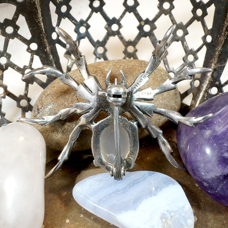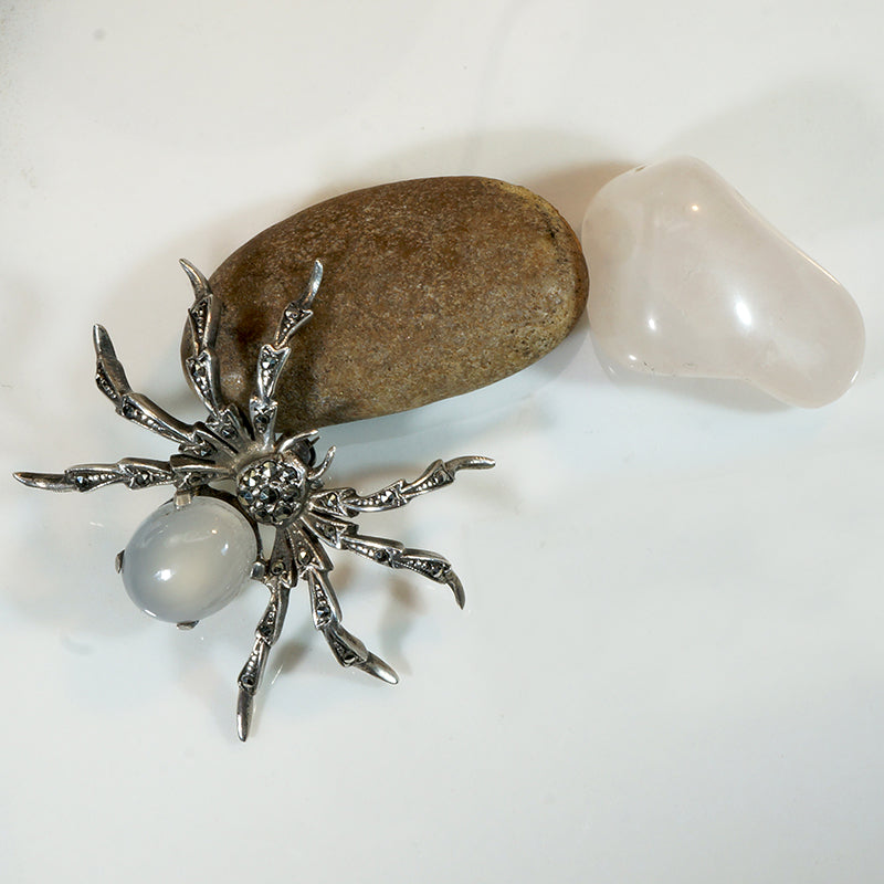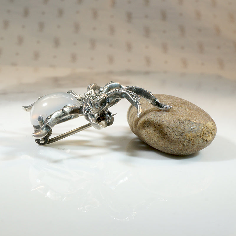 German Spider Brooch in Moonstone, Marcasite, & Sterling