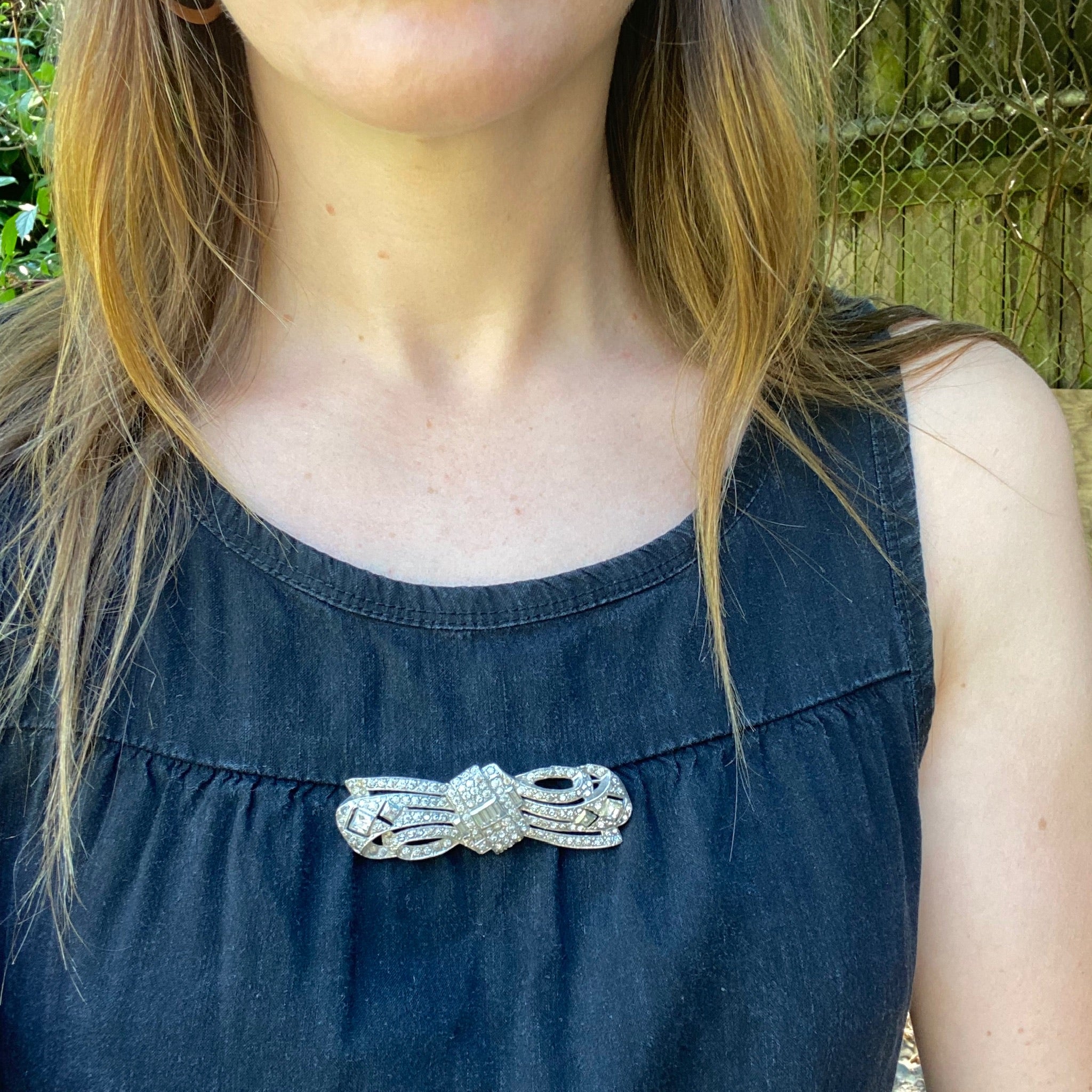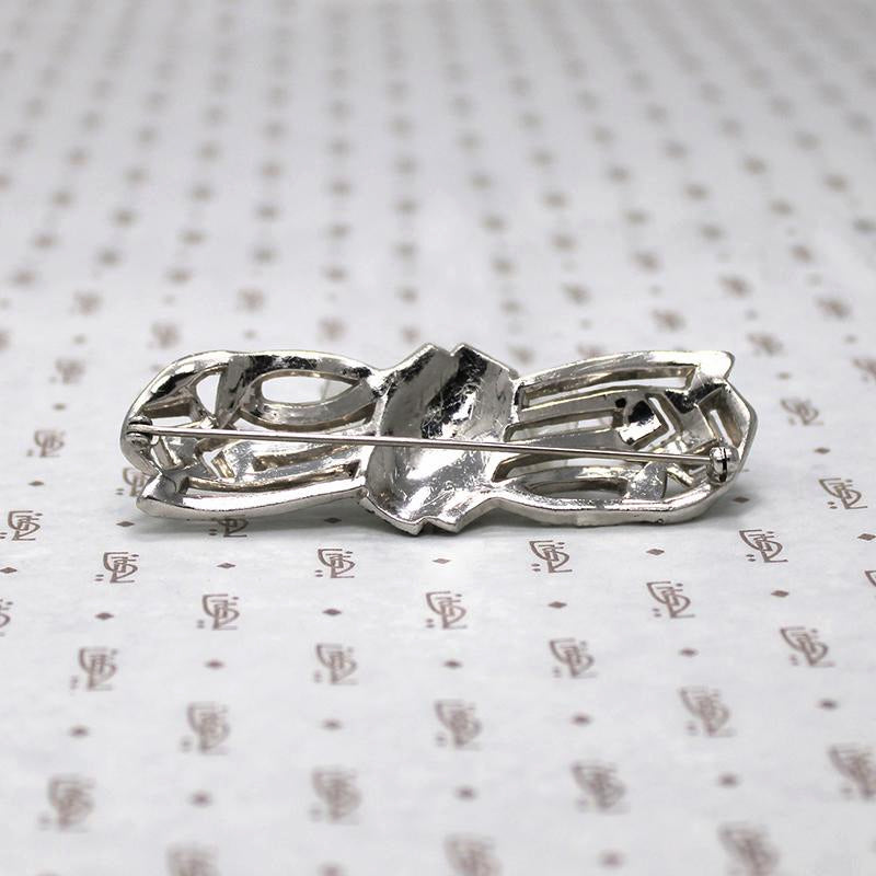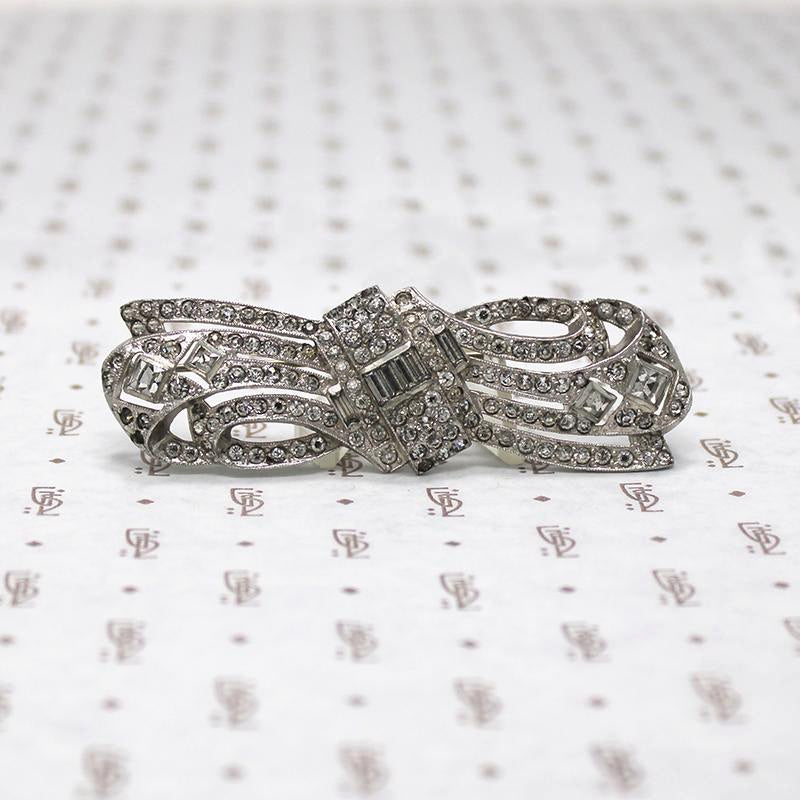 This beautiful Art Deco brooch features paste stones in the form of a elaborate stylized bow. The graceful pin is set with round, square and baguette stones and the costume metalwork is embellished with milgrain detail. This brooch is medium sized. It would add a fabulous accent note to your wedding dress, and a clever hair dresser could easily work this into your updo for some extra sparkle. Circa 1920.
