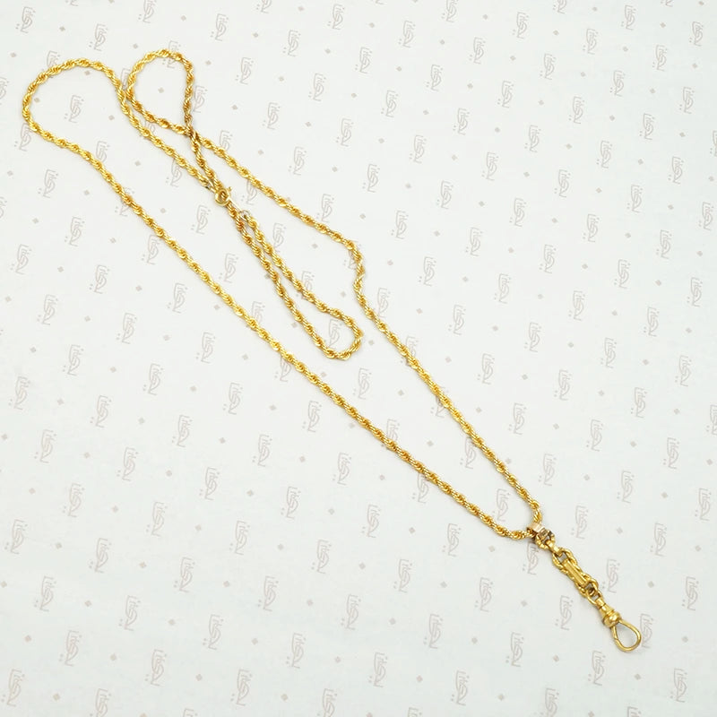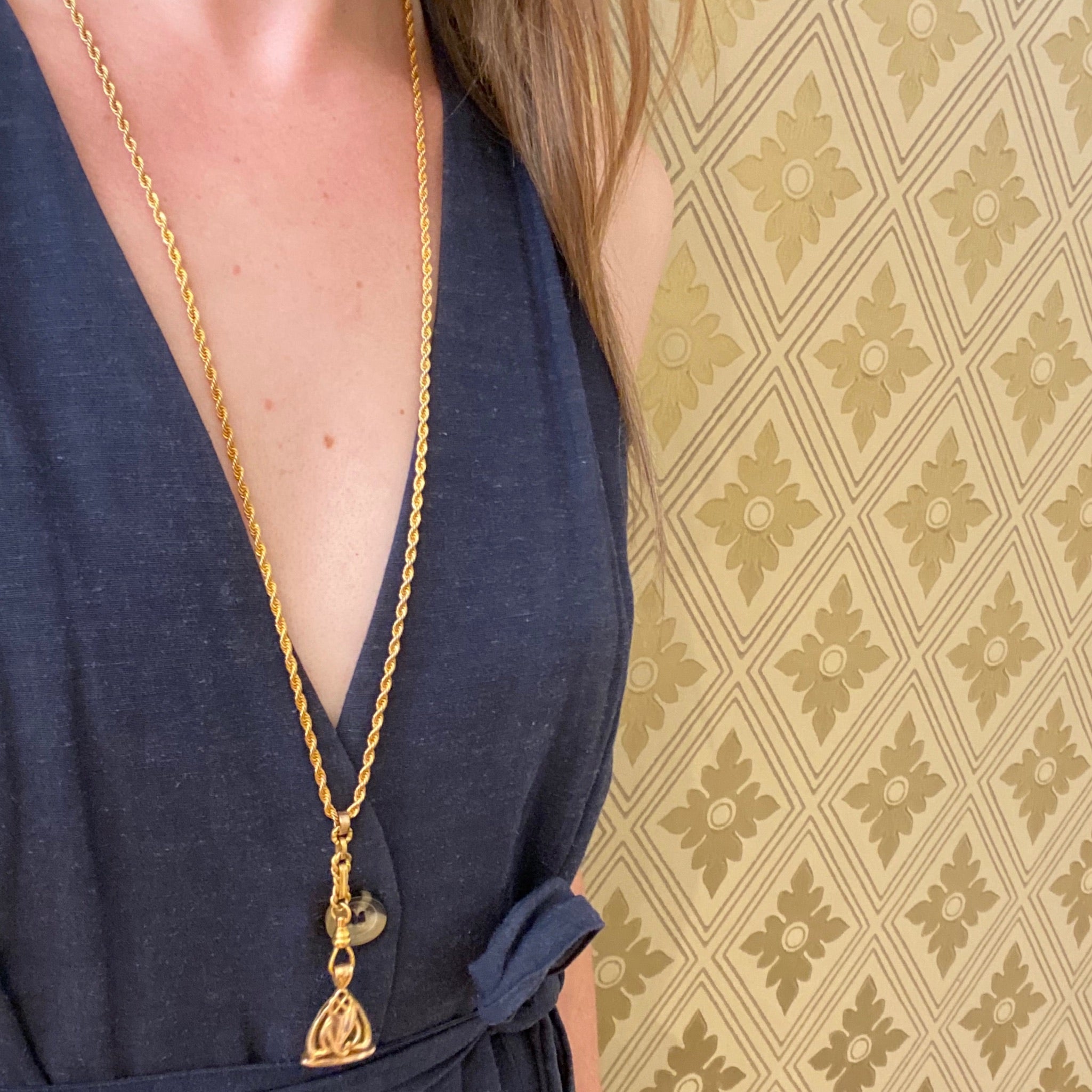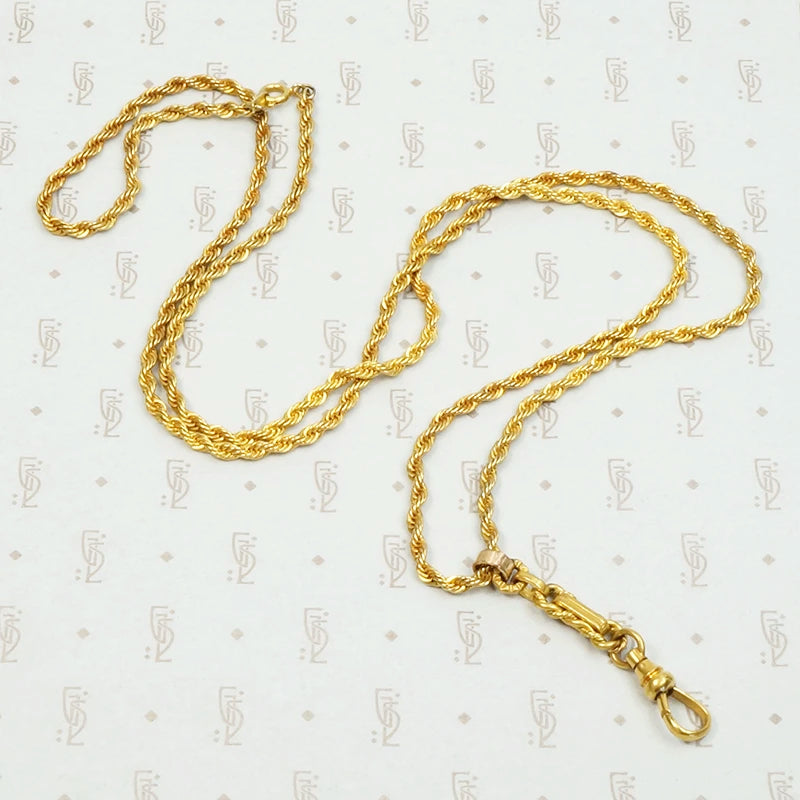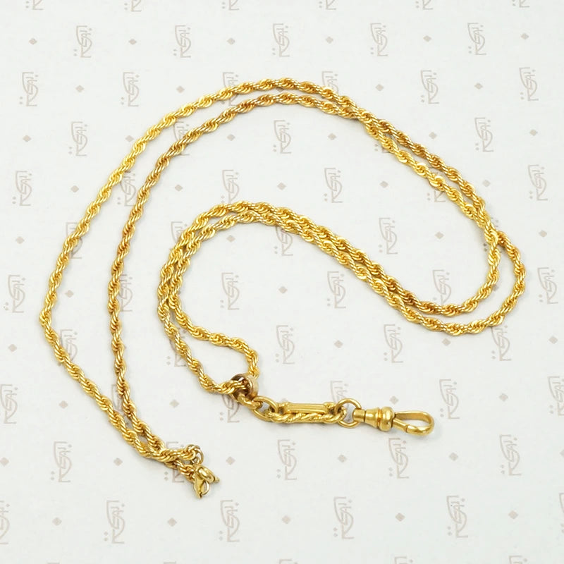 This bright yellow gold filled faceted rope chain looks so luxurious. The clasp allows you to wear the long chain doubled should you choose. The free-sliding charm holder has lovely rope work detail and a swivel watch hook that will accommodate all of your fobs and charms. Ingredients date from circa 1900-1940.