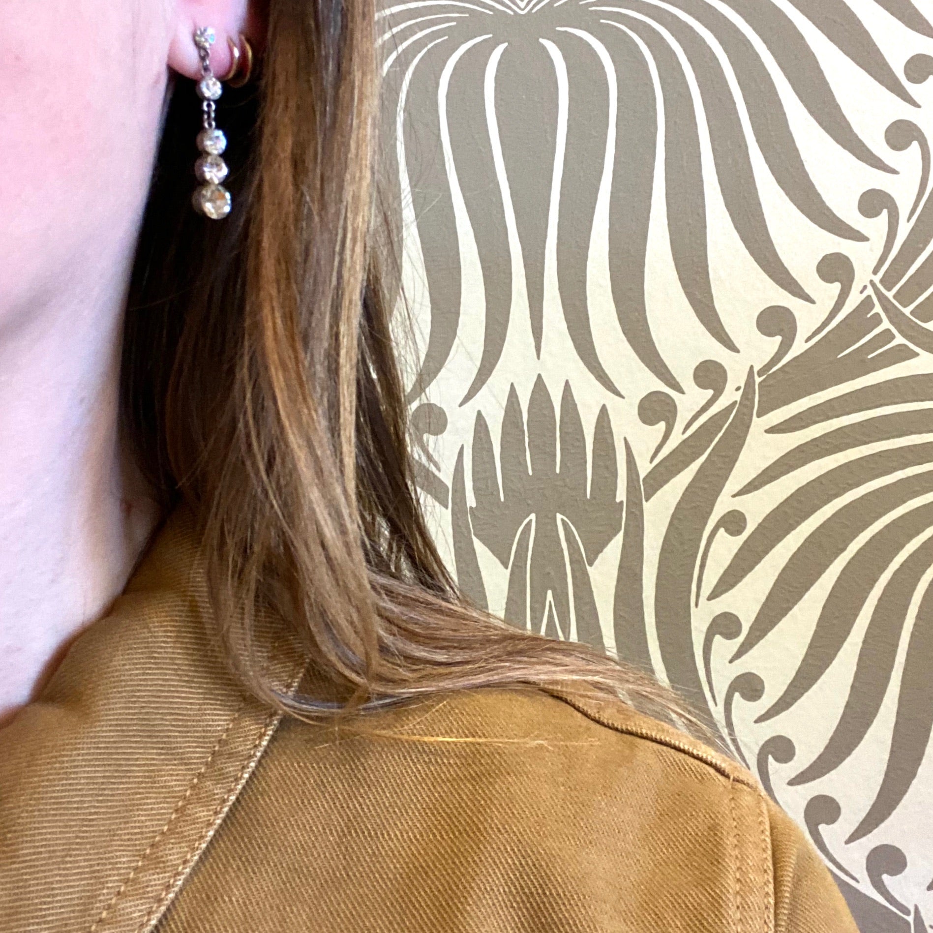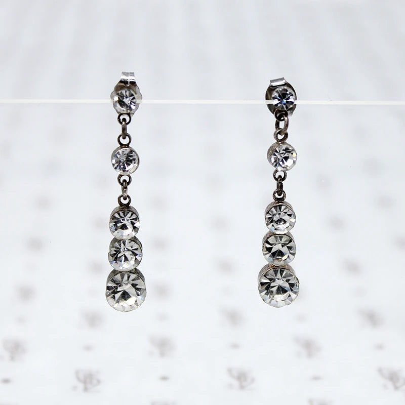 Pretty dangling earrings with bright white paste stones. Each earring has two points of articulation, giving them lovely movement. The paste glitters wonderfully. The stones are set in a base metal setting. They have posts for pierced ears. These beauties would make perfect bridal earrings, and they are versatile enough to be enjoyed after the big day. Circa 1930.