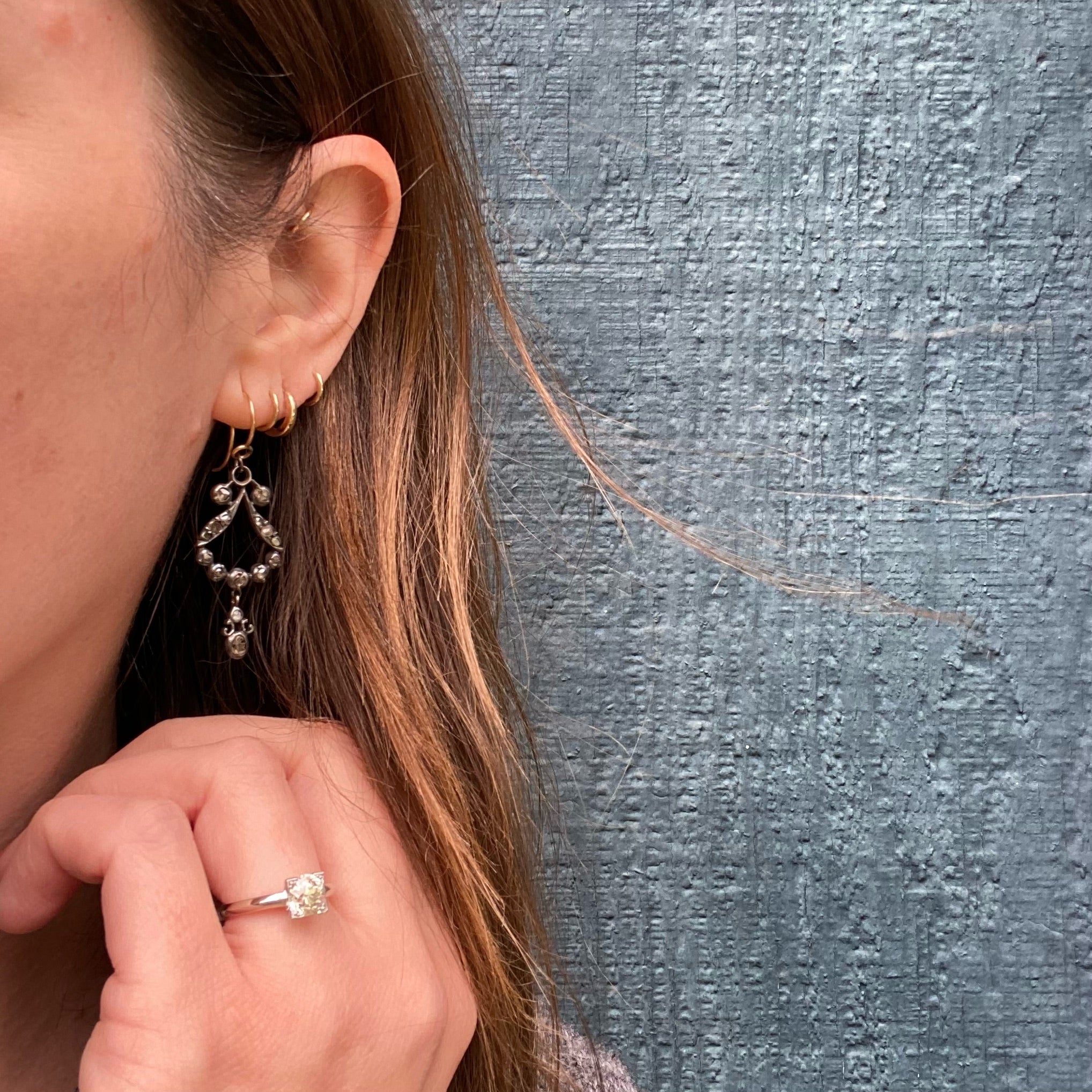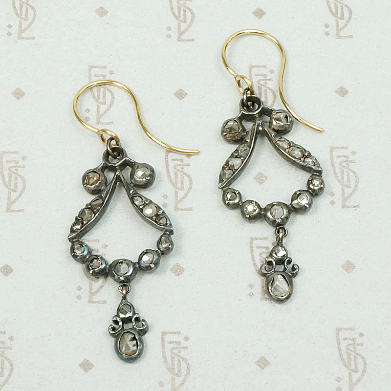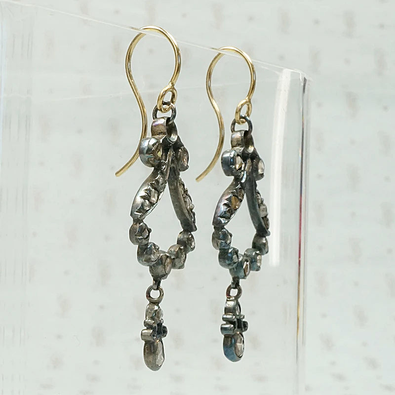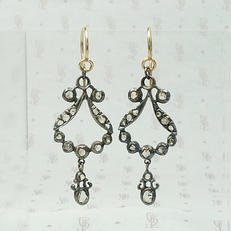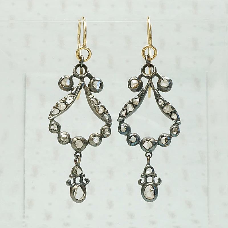 These glittering gossamer drop earrings marry Mid 19th Century romance with modern ingenuity. The body of the earrings feature a garland of rose cut diamonds set in delicately wrought silver, like precious dew drops. The silver retains the patina of ages, an effect that cannot be created through any process but time. Diamond set dangles twinkle sweetly from the base of the earrings. The original tops of these beauties have been lost, so we've had recycled 14k yellow gold ear wires hand drawn especially for them. The earrings move gracefully with two points of articulation, and their size is an ideal proportion for modern wear. What a joy to return such enchanting jewels to wearability.