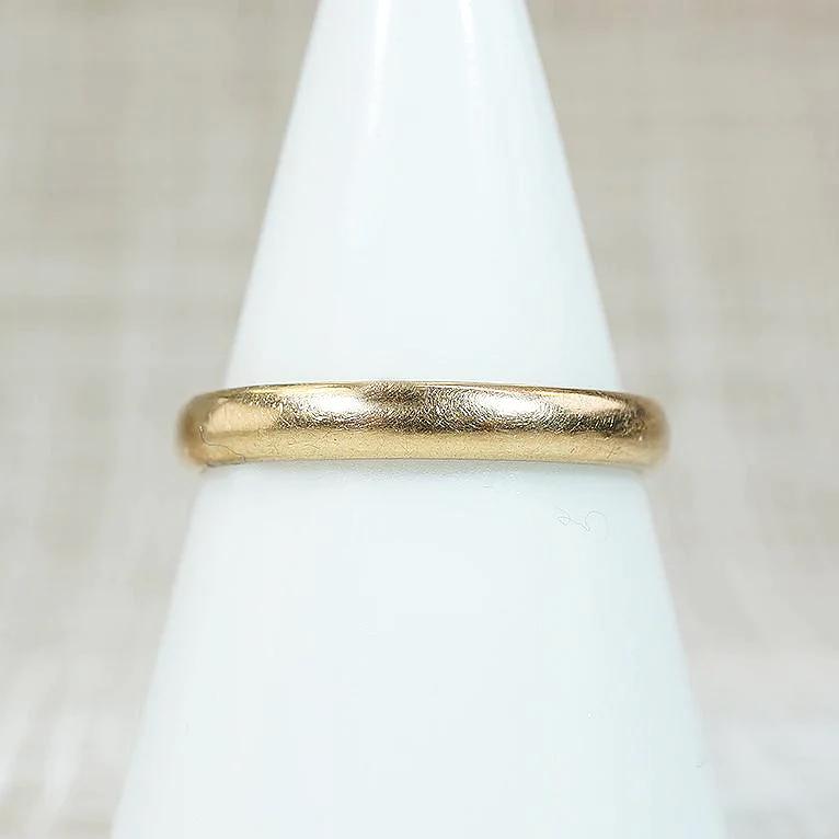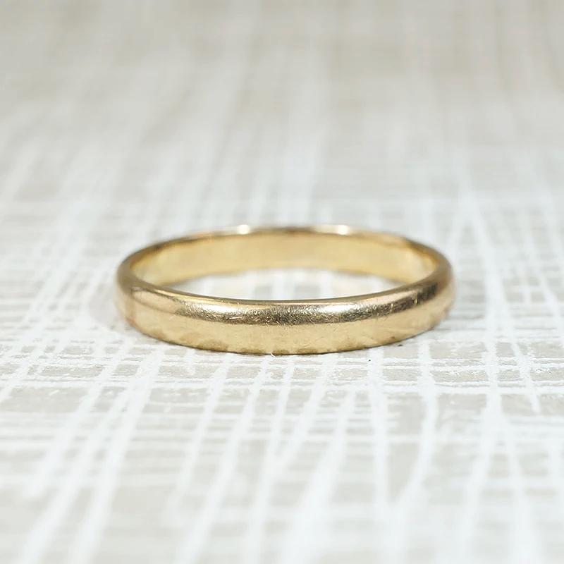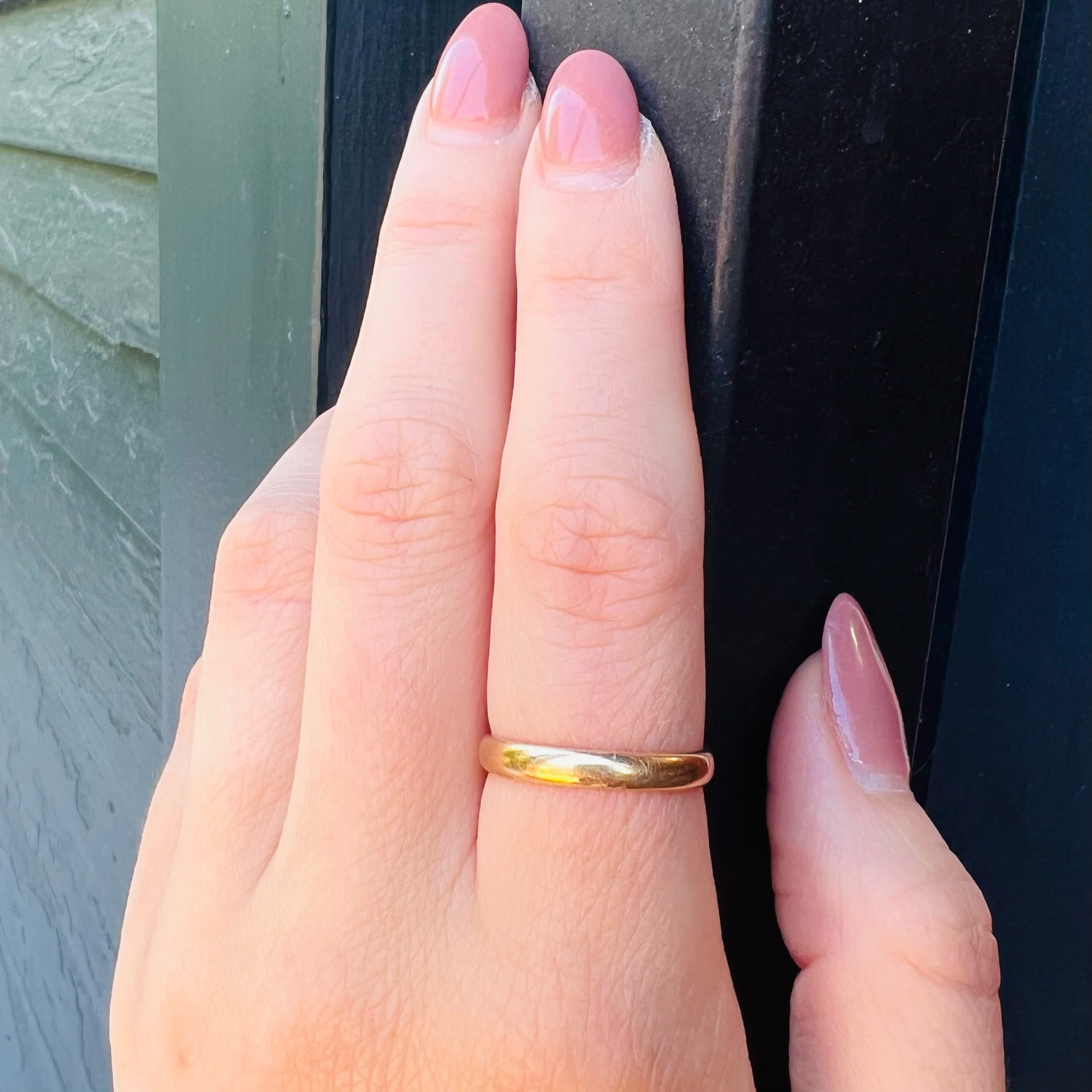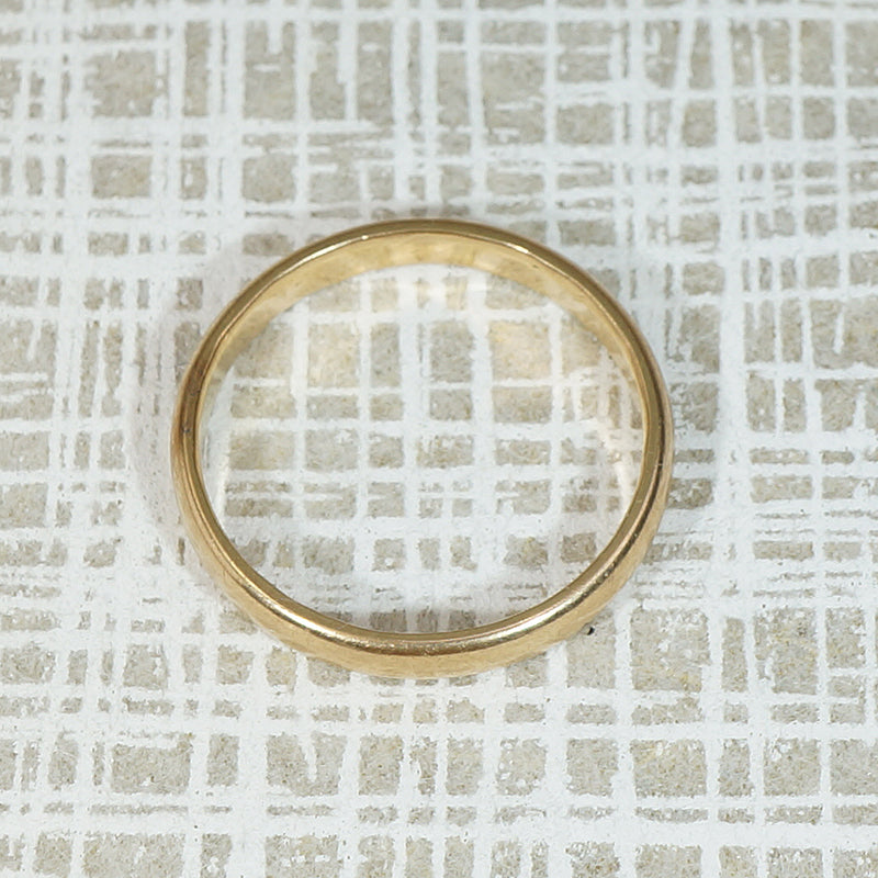 This English 9ct gold wedding band dates to World War II. A classic band with a slight exterior curve and a flat interior. Beautiful worn on its own or paired with your vintage engagement ring. The band is hallmarked for Birmingham, 9ct gold and the year 1944.