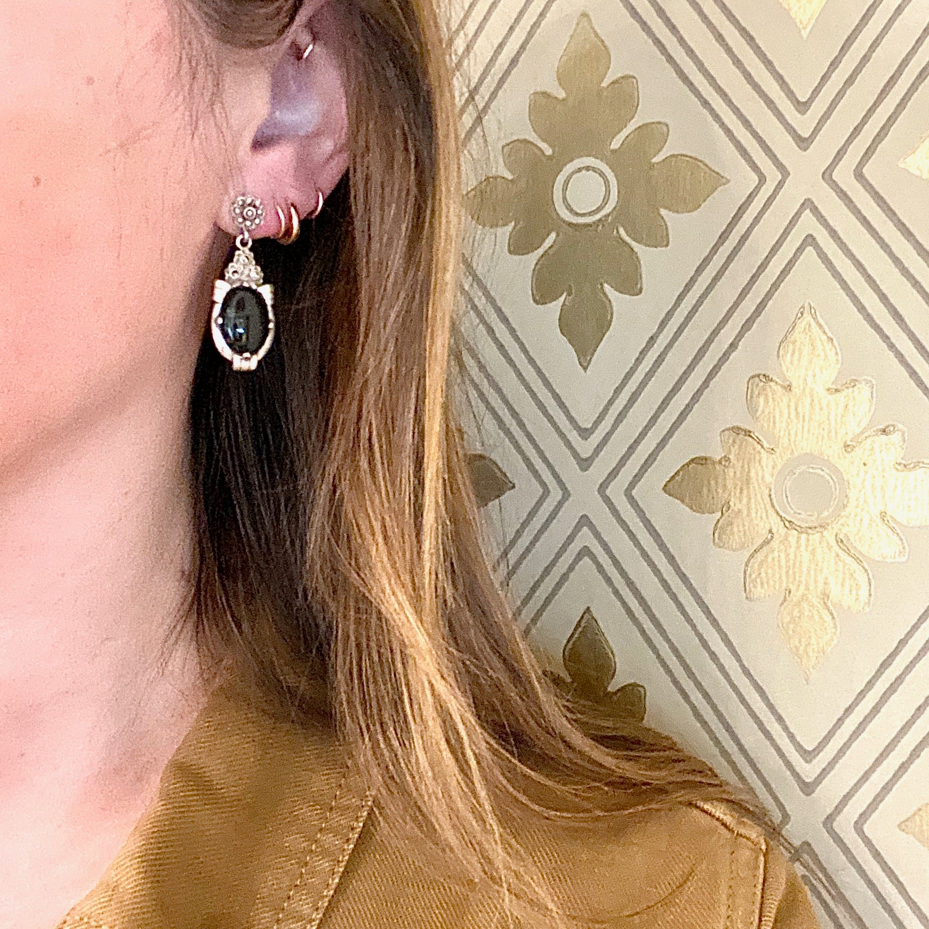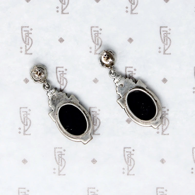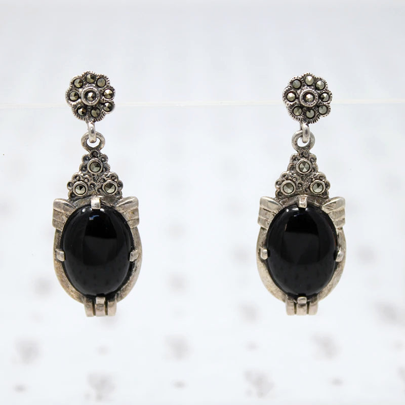 These glamorous modern earrings are inspired by the luxury of Art Deco jewels. Ovals of glossy black onyx are framed in architectural sterling silver settings. The silver is studded with the dark glitter of tiny marcasites. The floral earring tops are for pierced ears. While these darling dangle earrings borrow from Art Deco design, they have the smaller proportion appreciated by modern sensibilities.