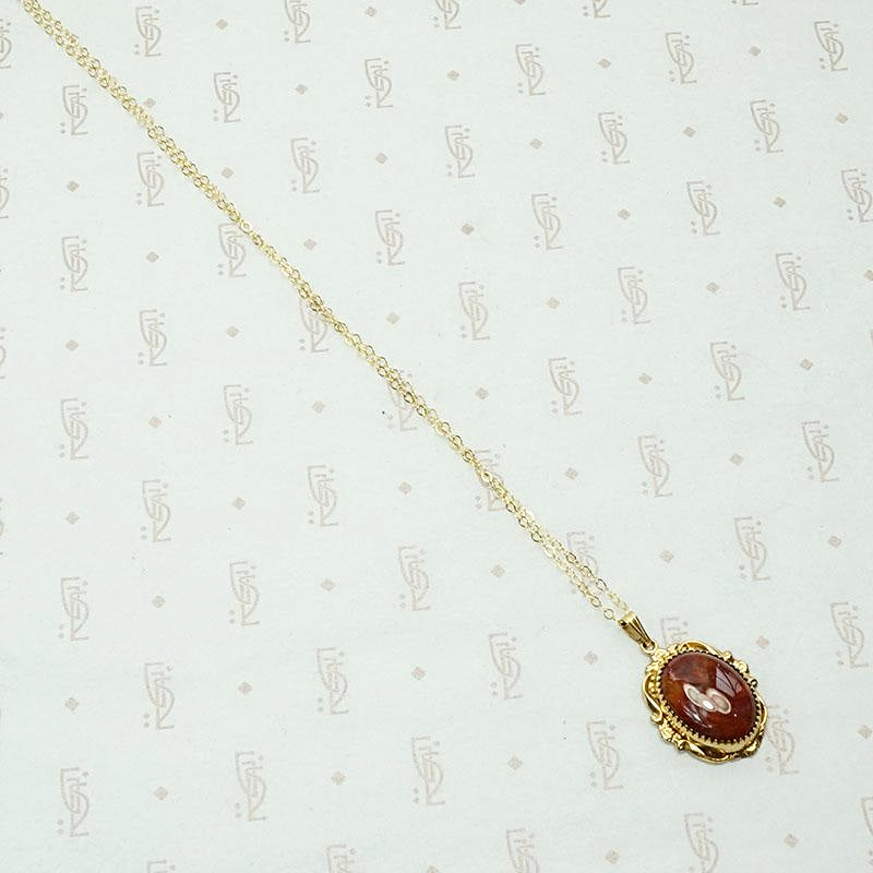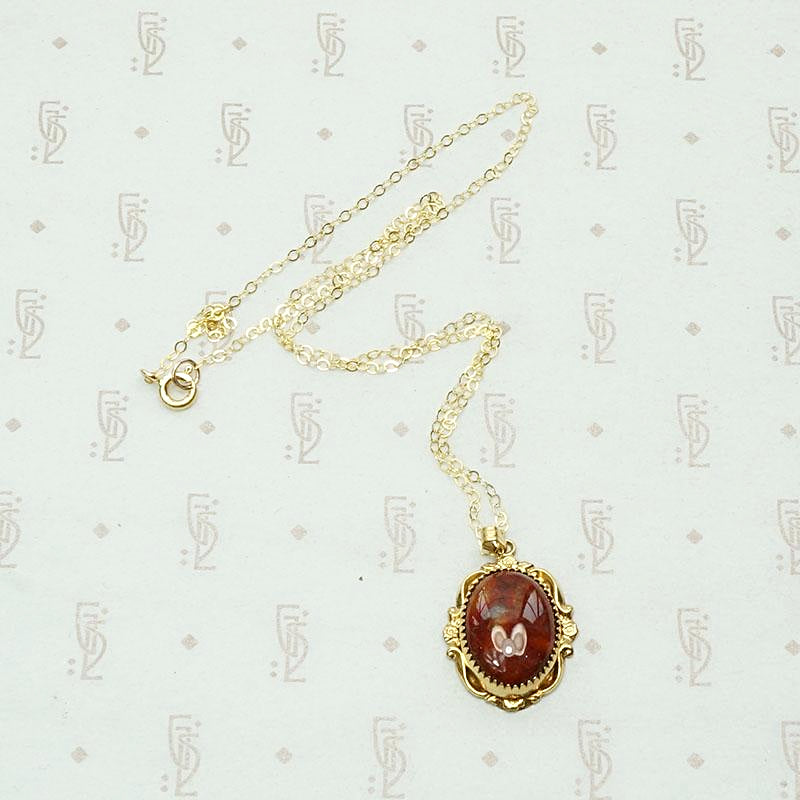 This beautiful Victorian Revival necklace showcases a glossy red natural jasper. The stone is sawtooth-bezel set in an ornate gold filled frame. The pendant depends from a decorative bale. The modern chain is gold filled as well. The delicate details of the stone and its setting create a dramatic necklace you will never tire of admiring. Circa 1960.