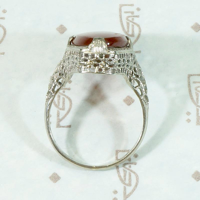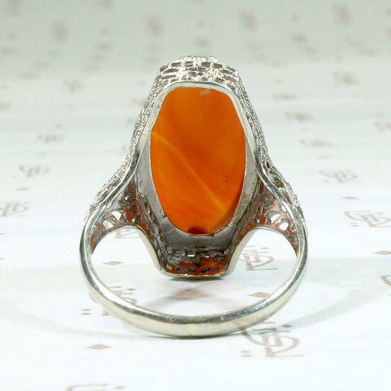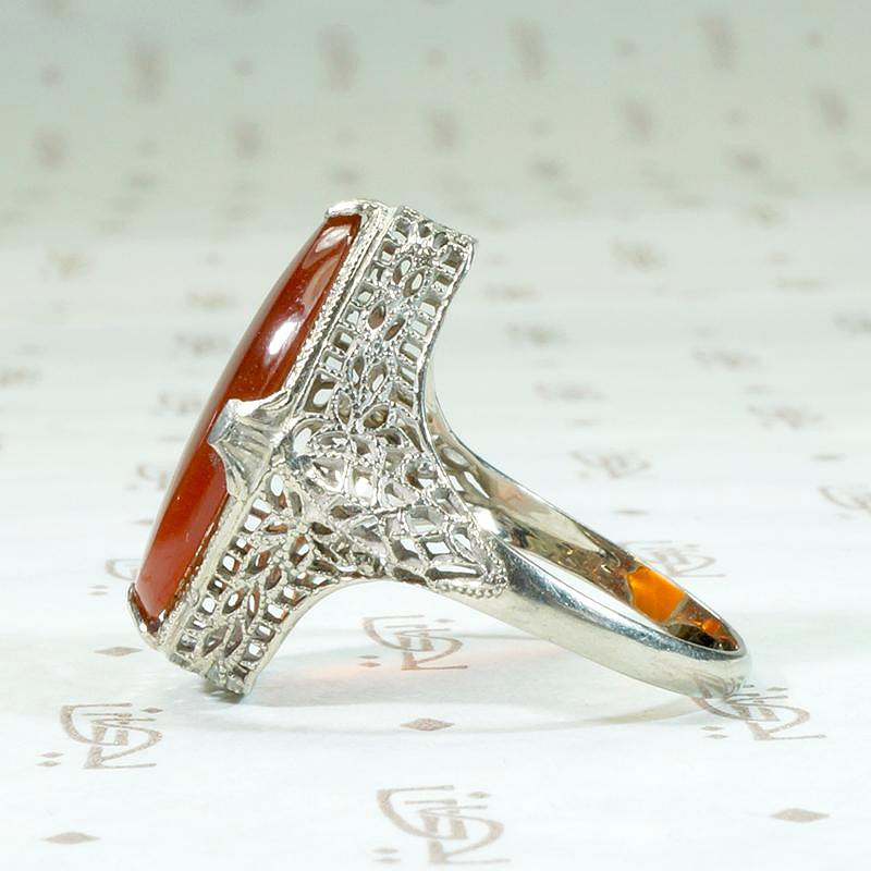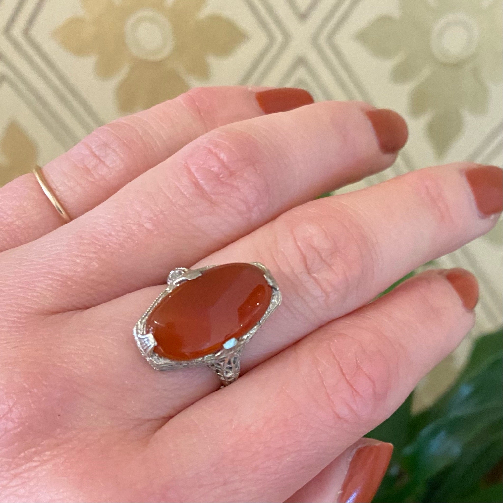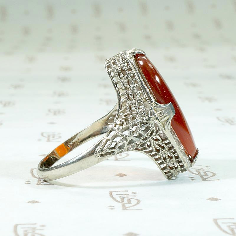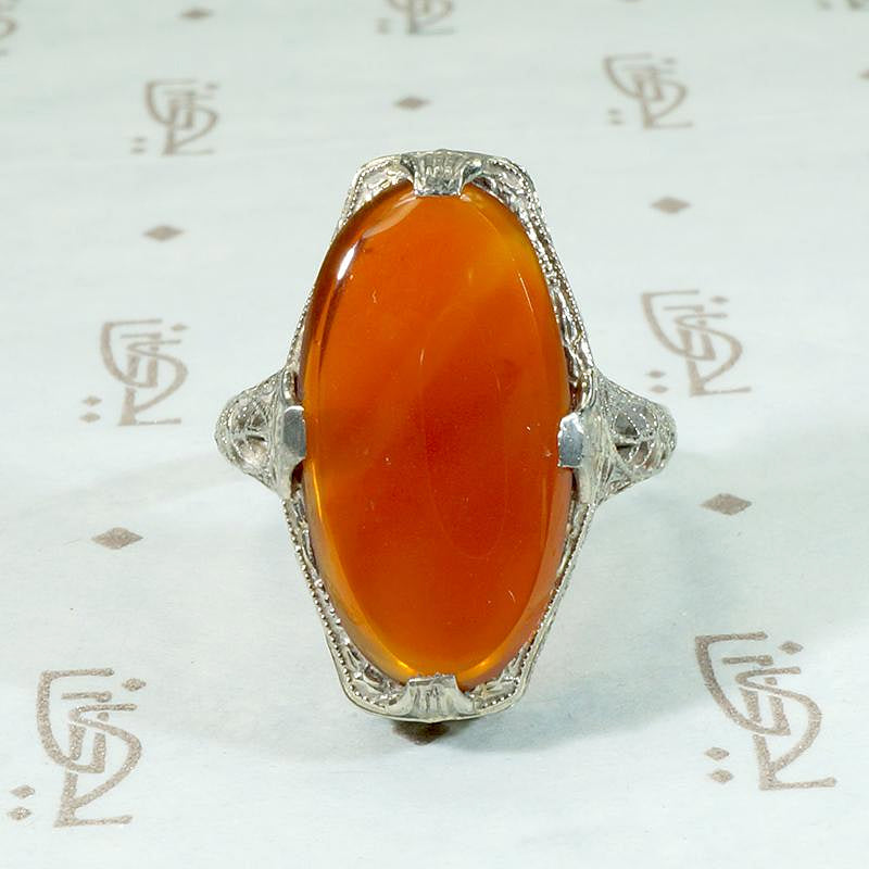 The glamour of Art Deco carnelian jewelry is irresistible. This ring features classic filigree set with a glowing carnelian gemstone. The rich orange gem is an oval slab with beveled edges, held in four engraved prongs. The 14k white gold ring is elaborately lacy, with filigreed shoulders and gallery like spun sugar. Imagine the fashionable woman who wore this ring one hundred years ago, and the glittering parties she wore it to. Circa 1920.