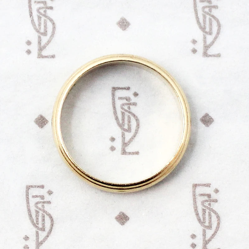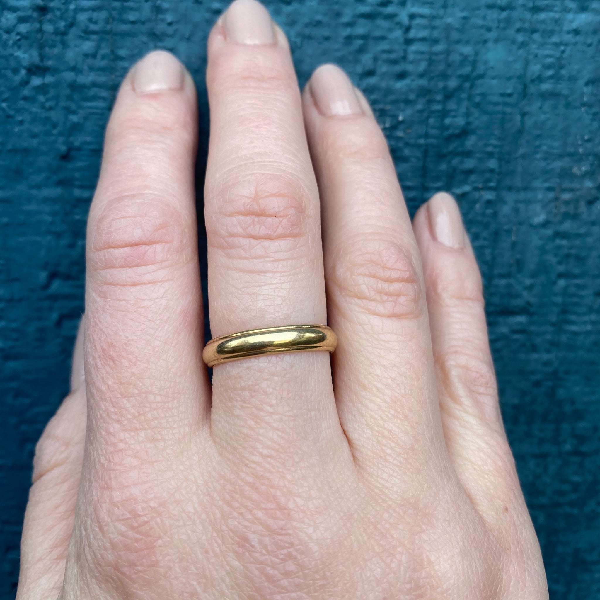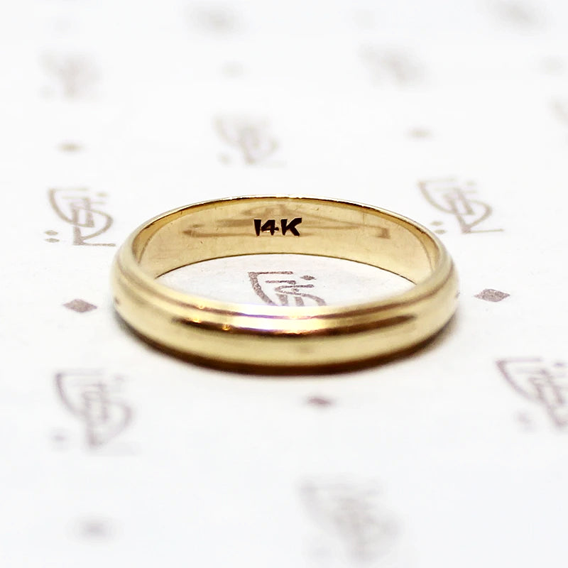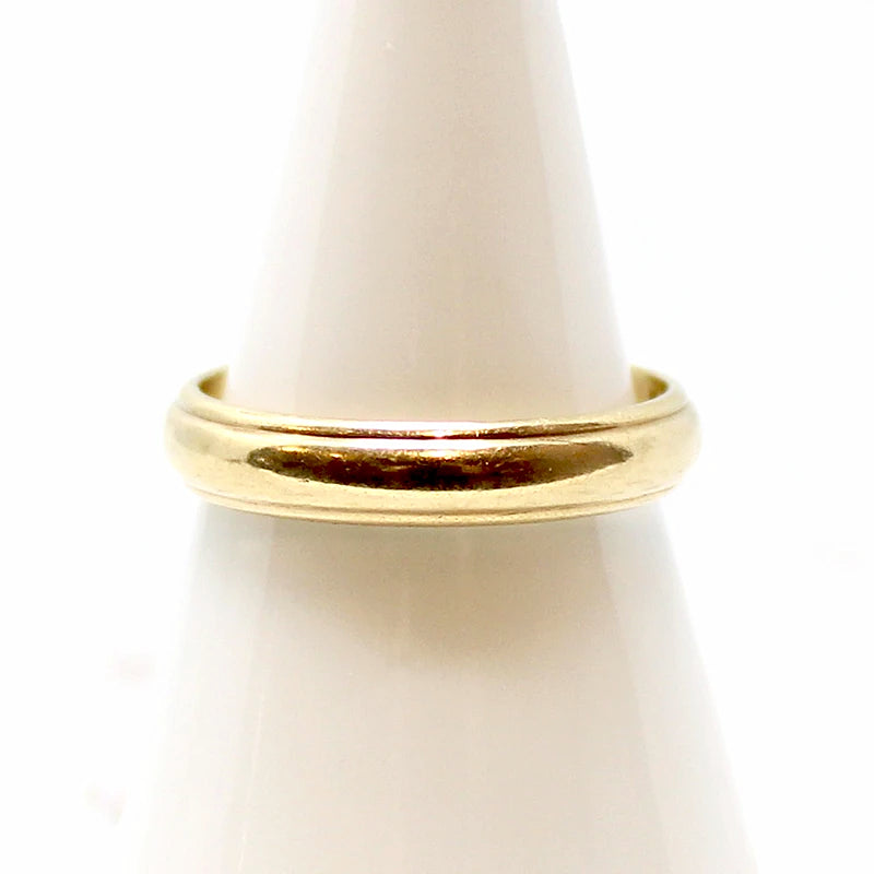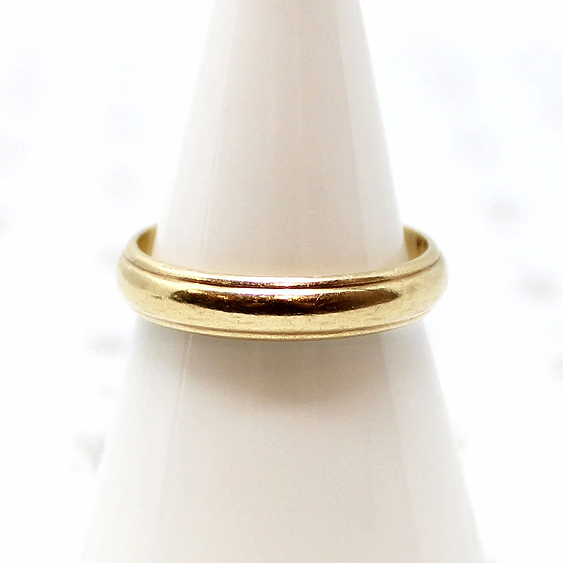 This 14k gold band is a half round with a stepped edge. Very handsome, it has that pleasing mellow glow found only in vintage gold. This one is a classic. Circa 1950.