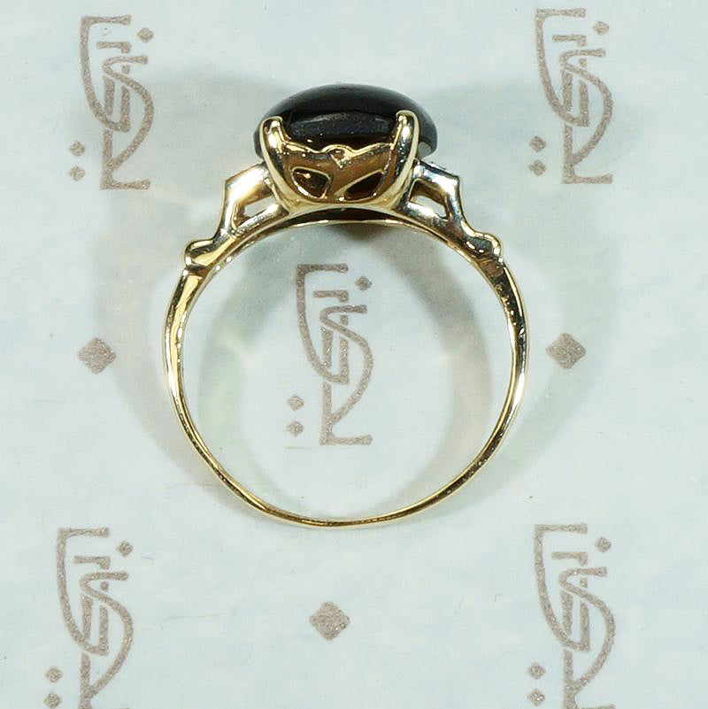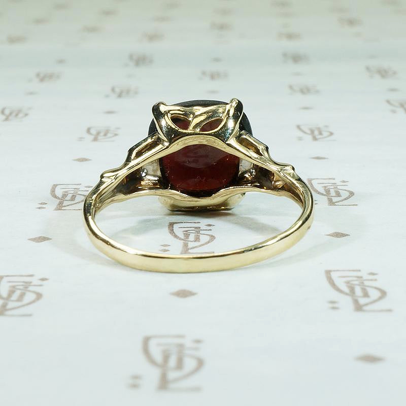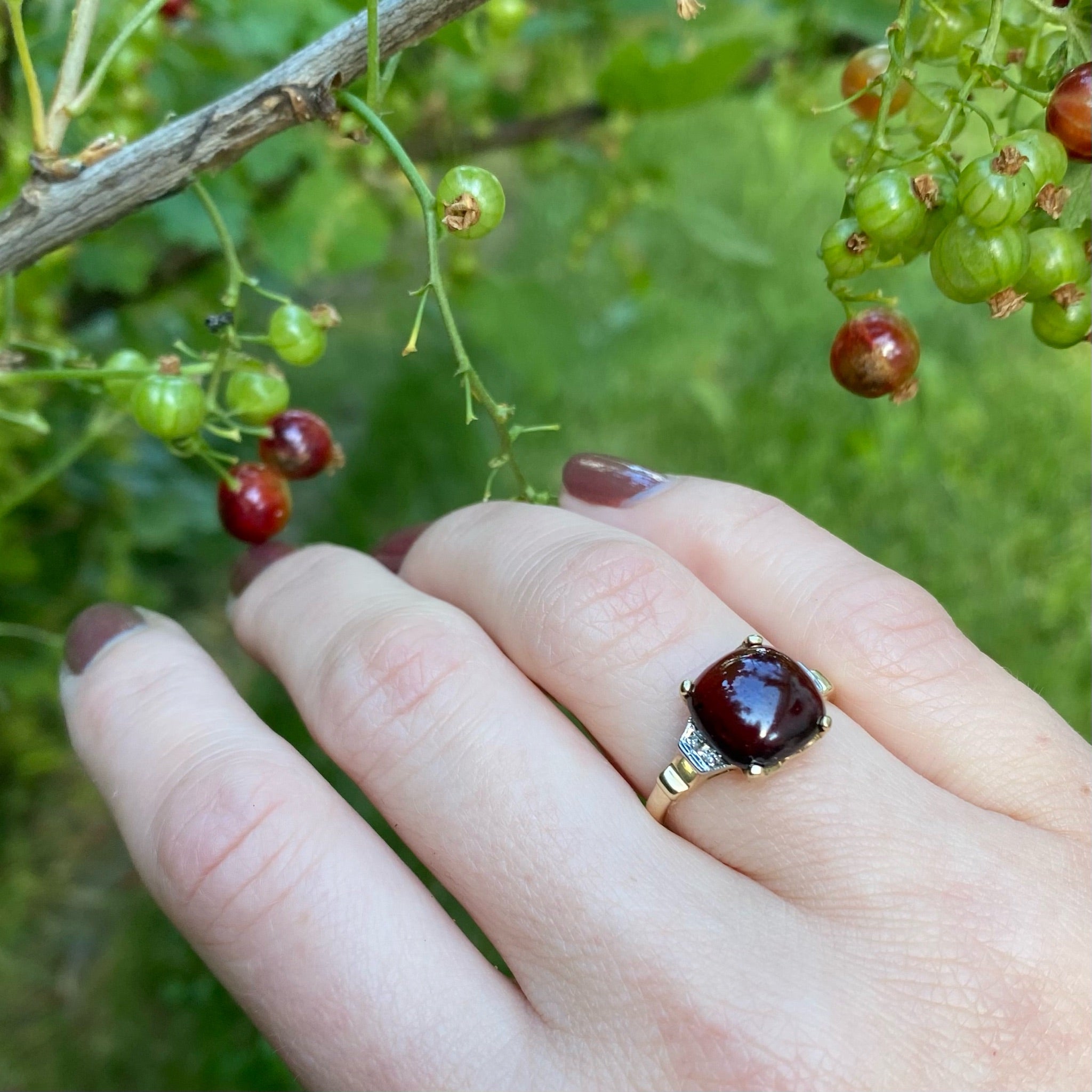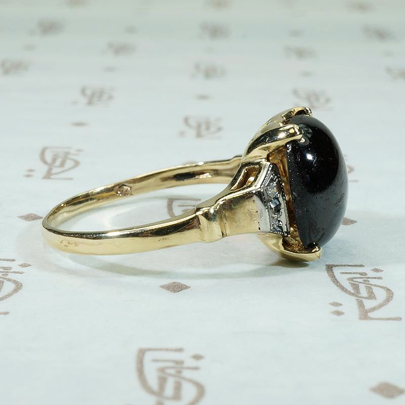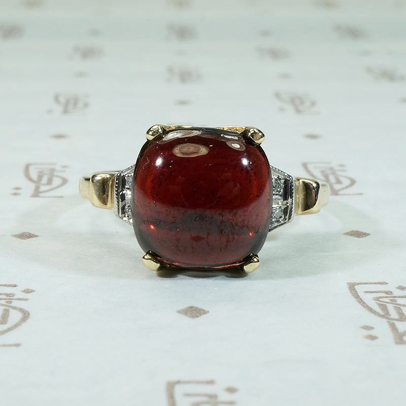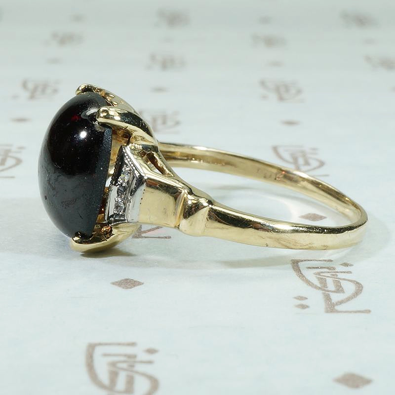 A glossy, glowing garnet cabochon with the juicy color of pomegranate seeds. The rich Retro 14k gold setting showcases the lush stone with shoulder accents of tiny   diamonds set in white gold. This will make a beautiful January birthstone ring or nontraditional engagement ring. Circa 1940.