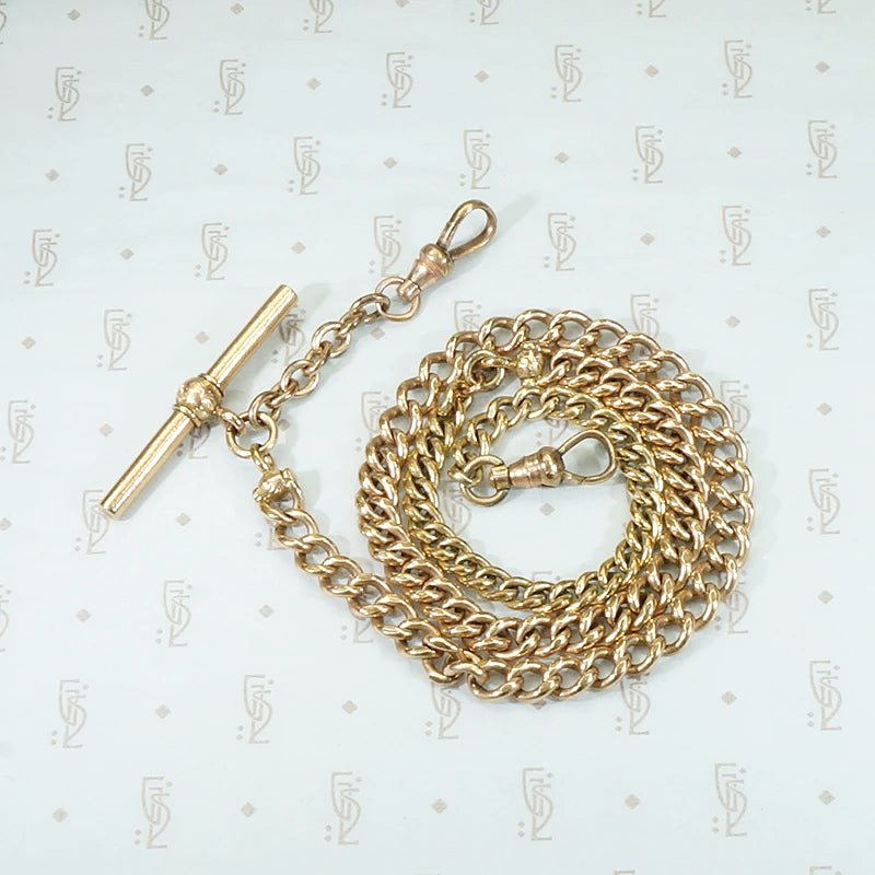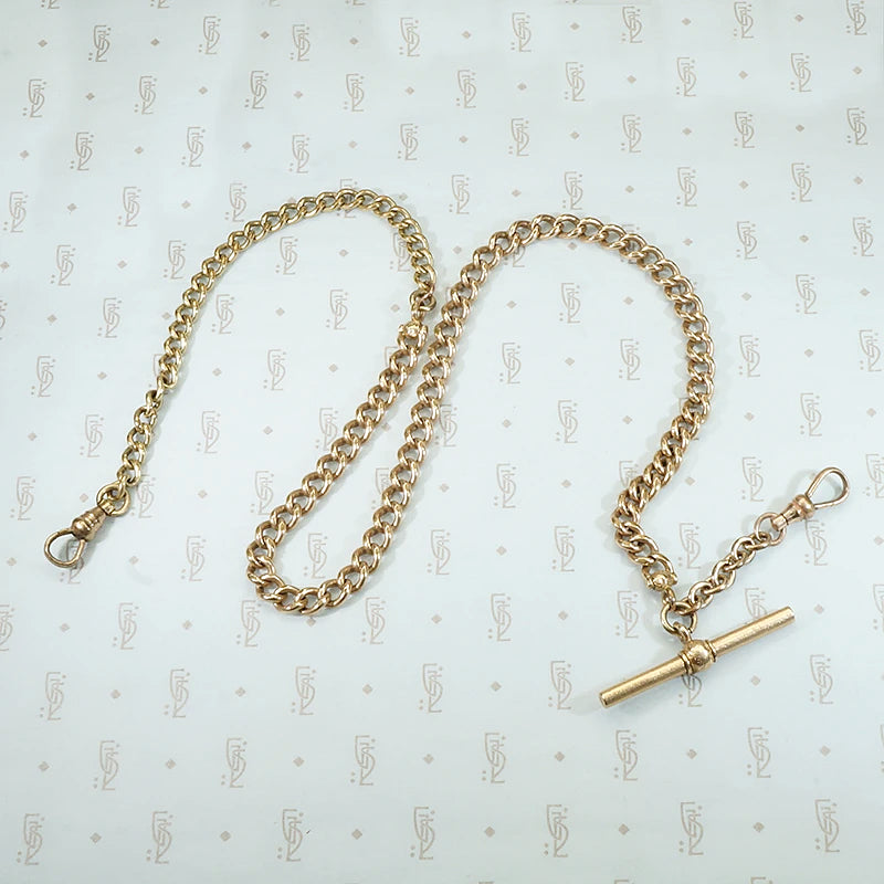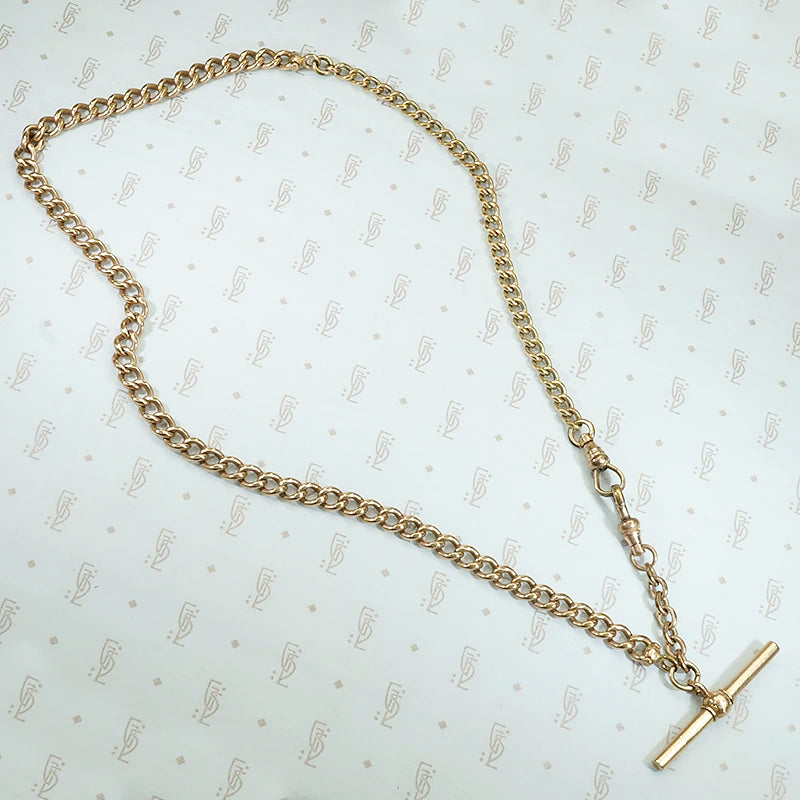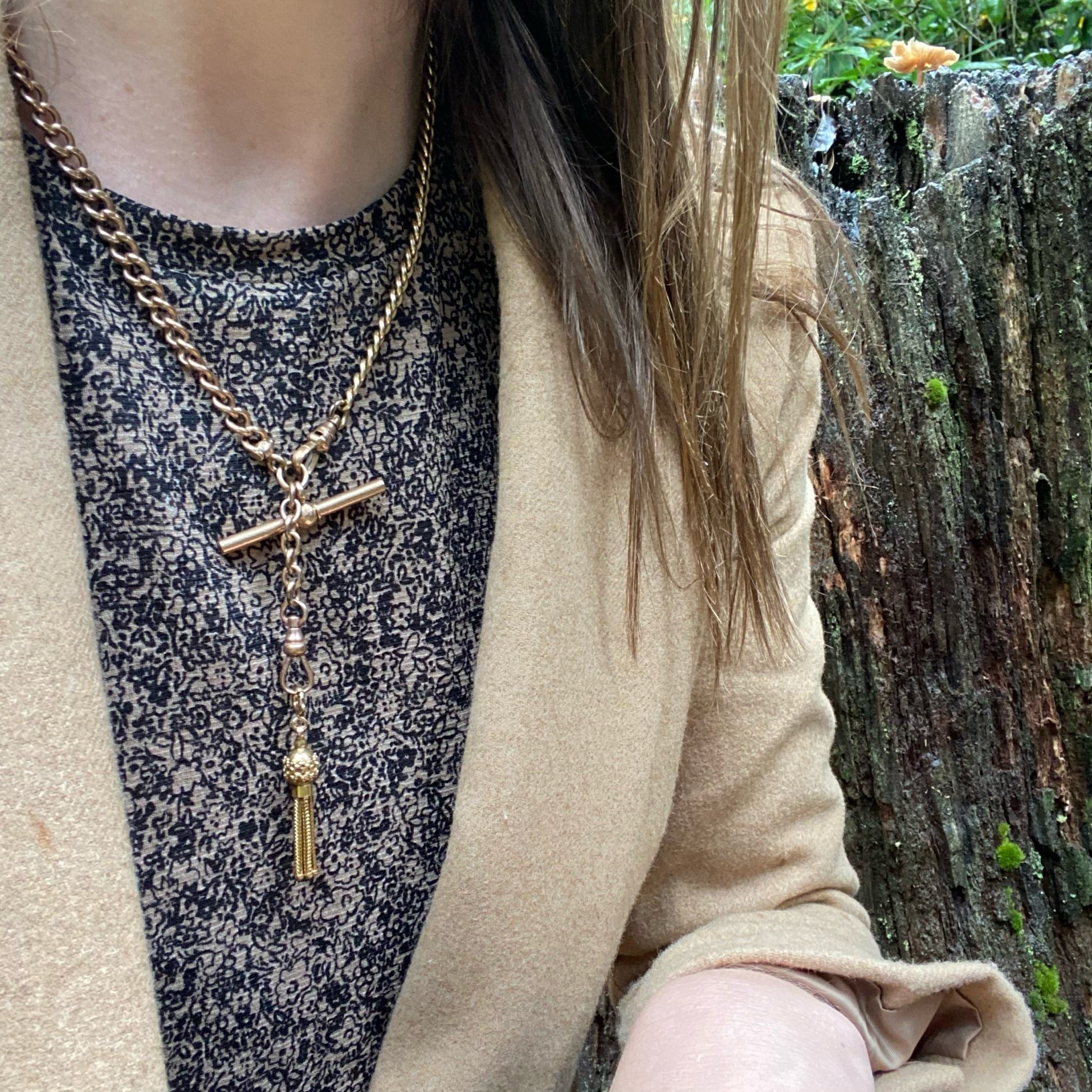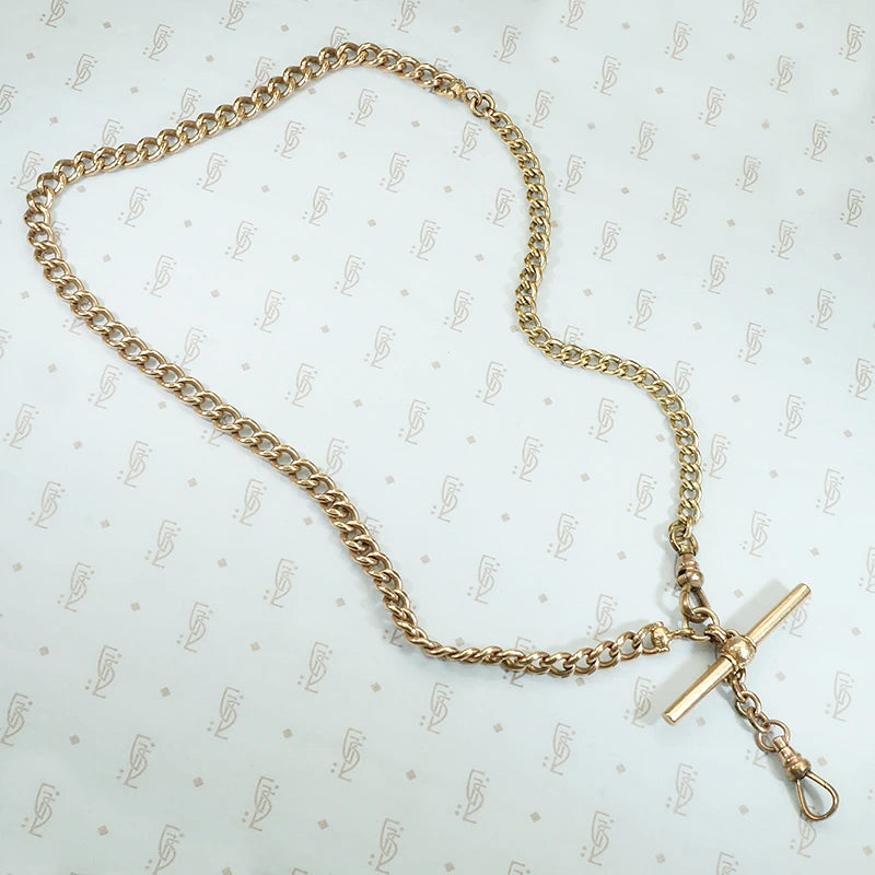 Antique gold filled ingredients create affordable glamour in this artisan necklace. Segments of curb chain are linked and clasp at the front with double watch hooks. A decorative engraved t-bar hang from the bottommost ring, and fancy engraved terminals complete the piece. Hang all your favorite bits and bobs from either or both hooks, double clasps make this piece extra versatile and fun. Raise your Chain Game.