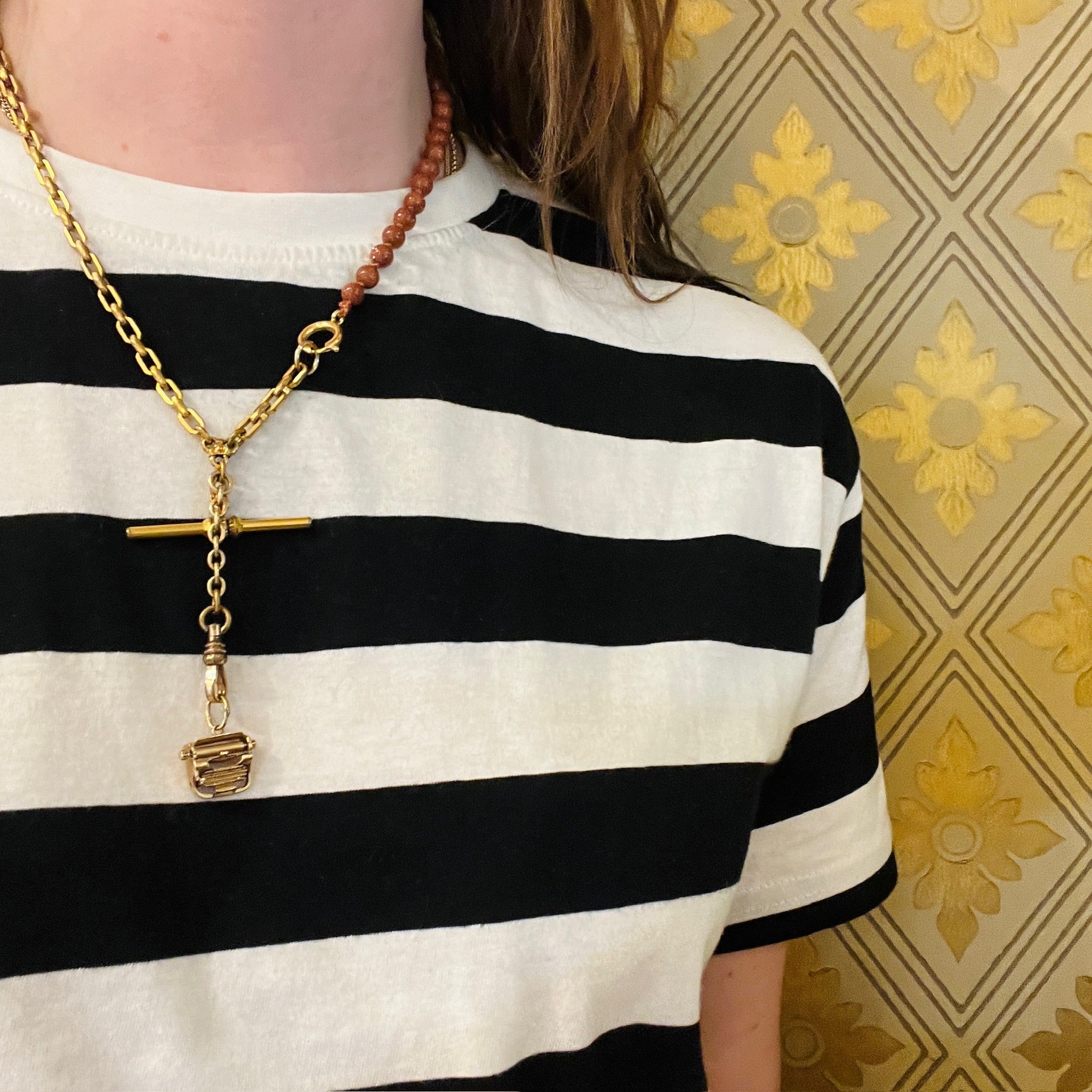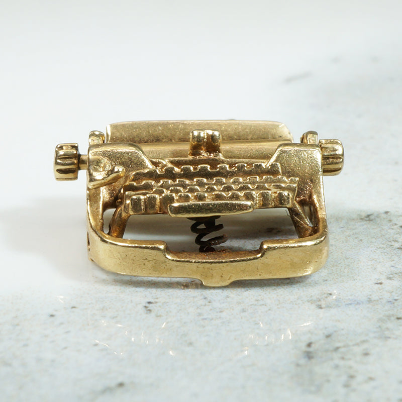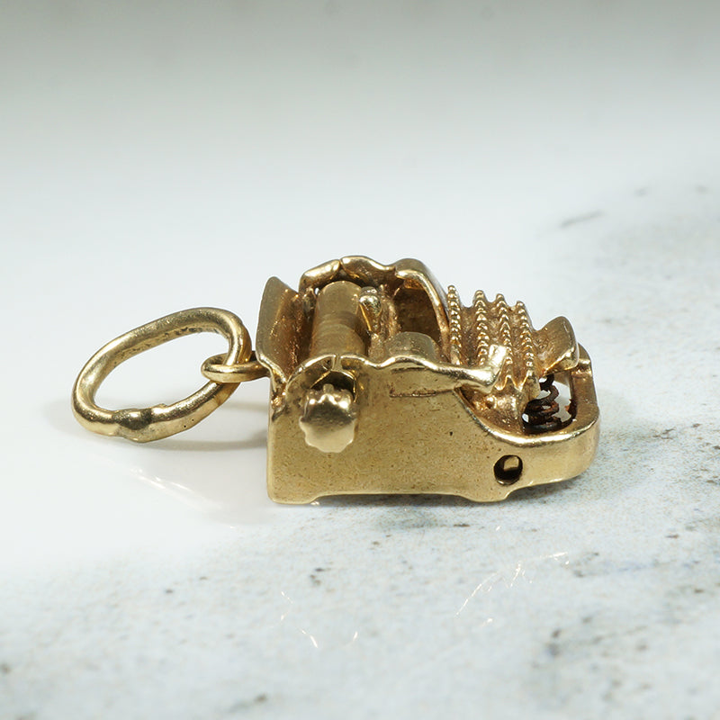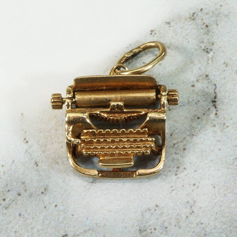 A mini manual typewriter charm in 14k gold. The charm is three-dimensional and highly detailed; the platen really rolls, and the keyboard is on a tiny spring, so you can pretend to type on it. A gold jump ring has been added to the charm's bale, making it easy to wear on a chain or charm bracelet. A thoughtful gift for the writer in your life. Circa 1950.