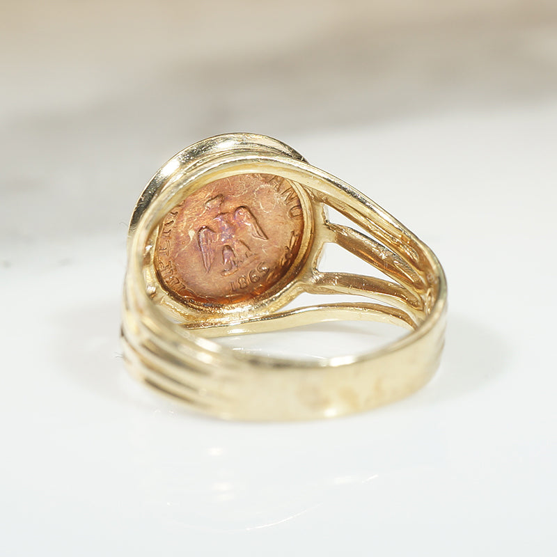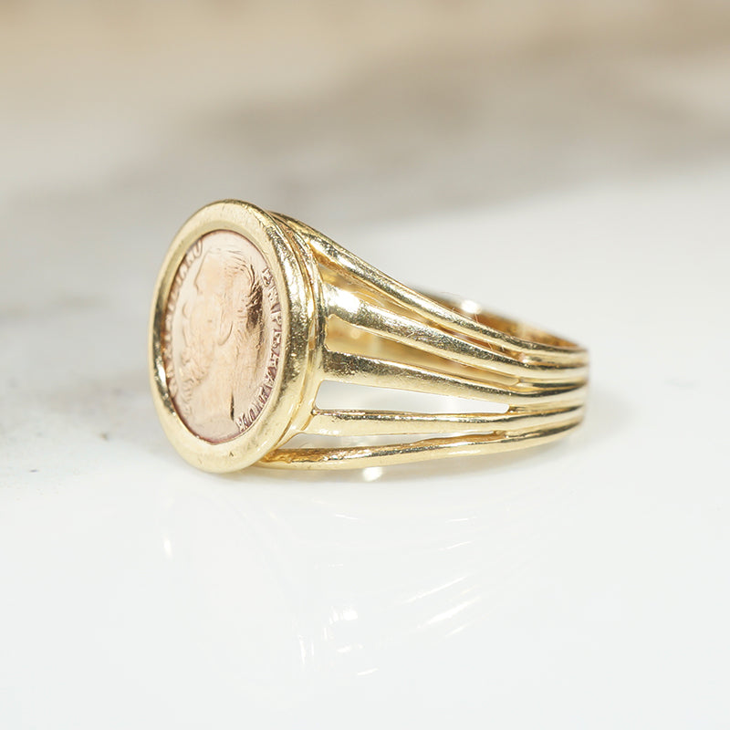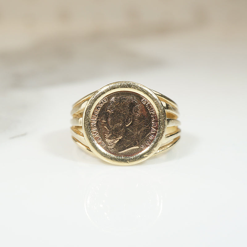 Here's the cool pinky ring you've been looking for. A tiny coin with the face of Emperor Maximilian from 1865 is set in a 14k yellow gold ring. The ring dates from the 1970's and snugs just right on your pinky finger.