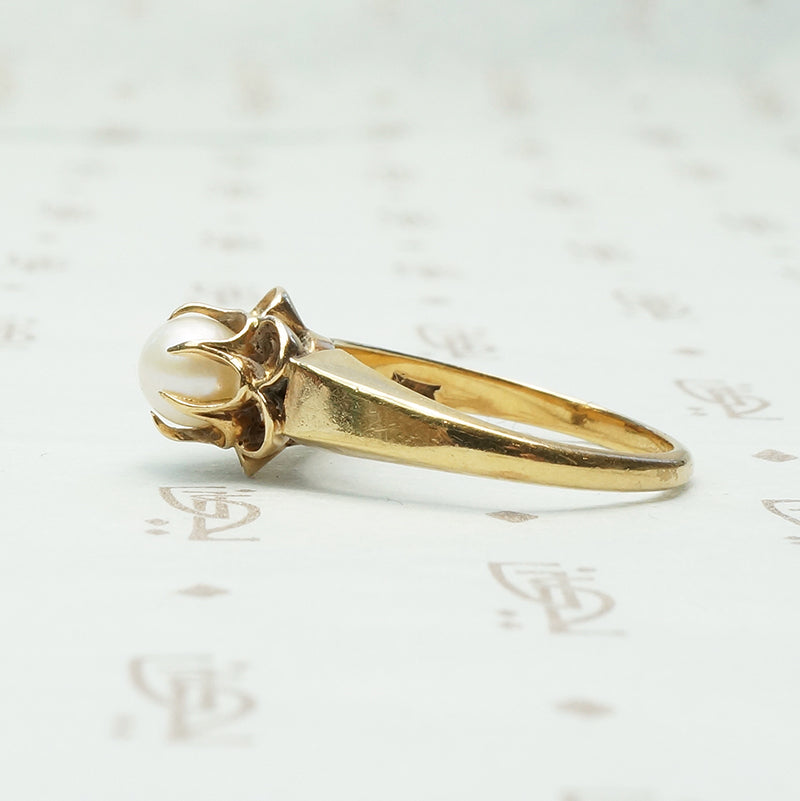 The creamy white 5mm pearl sits in a fluted edged setting, like a pearl at the center of a golden flower. The circa 1900 ring is beautifully crafted of 14k yellow gold with smooth tapered shoulders. The setting is both substantial and delicate, adding to its charm. This would make a nice alternative engagement ring.