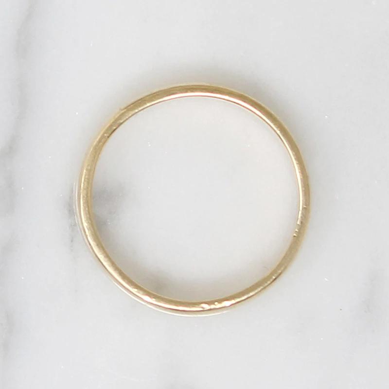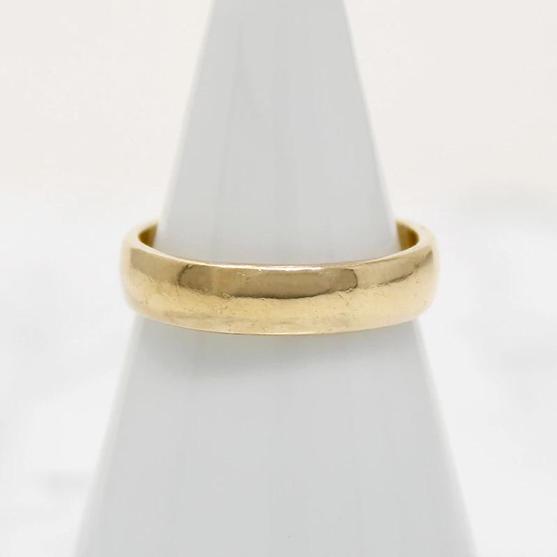 A classic 14k yellow gold vintage wedding band with a shallow exterior curve. The band has a flat interior and edges with a comfortable weight. This glowing, gold band is a nice, middle of the road size. Circa 1950.