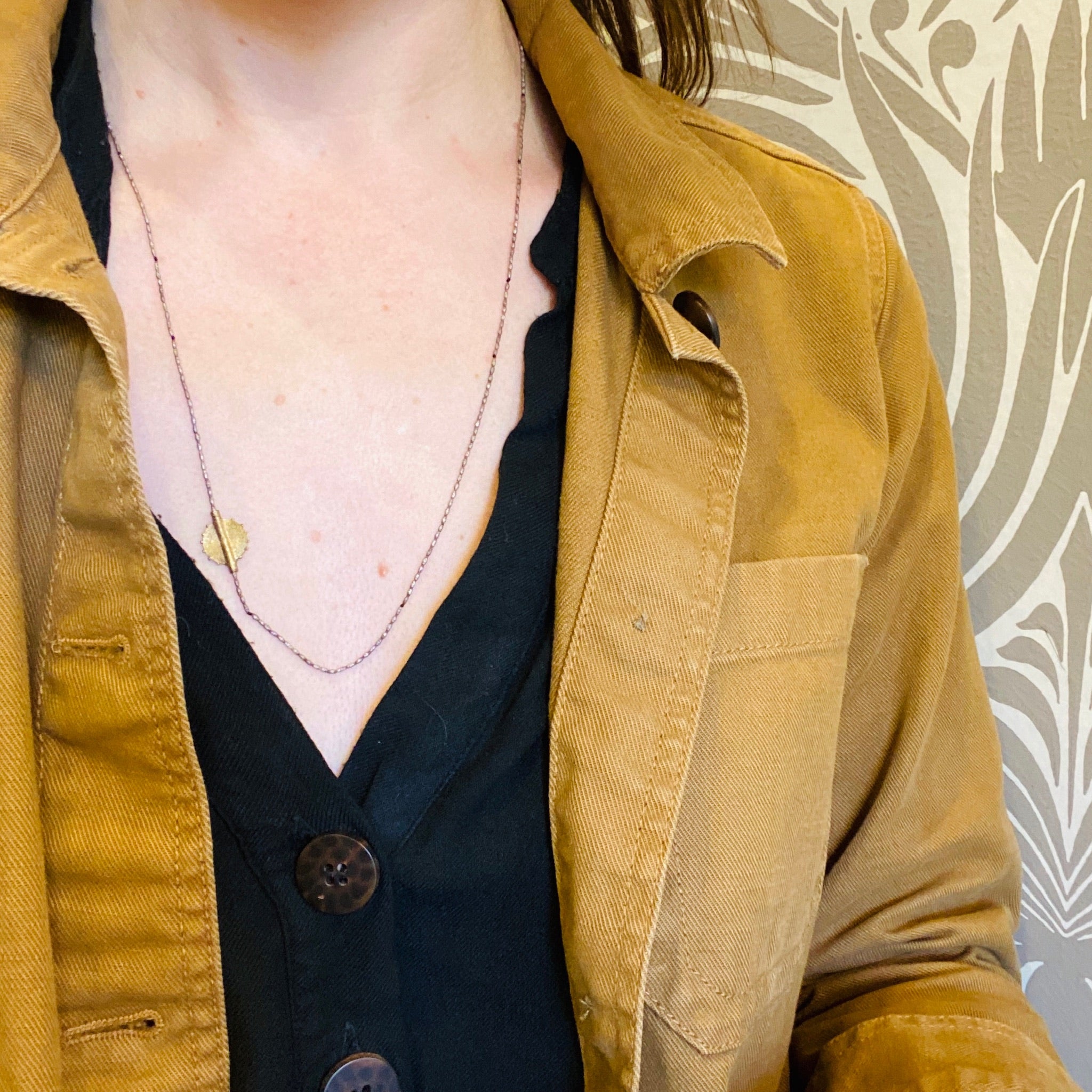 Details.....The necklace is 23" long. The gold detail measures 16.6mm by 12.2mm. The tiny antique silver beads are only 1mm wide.