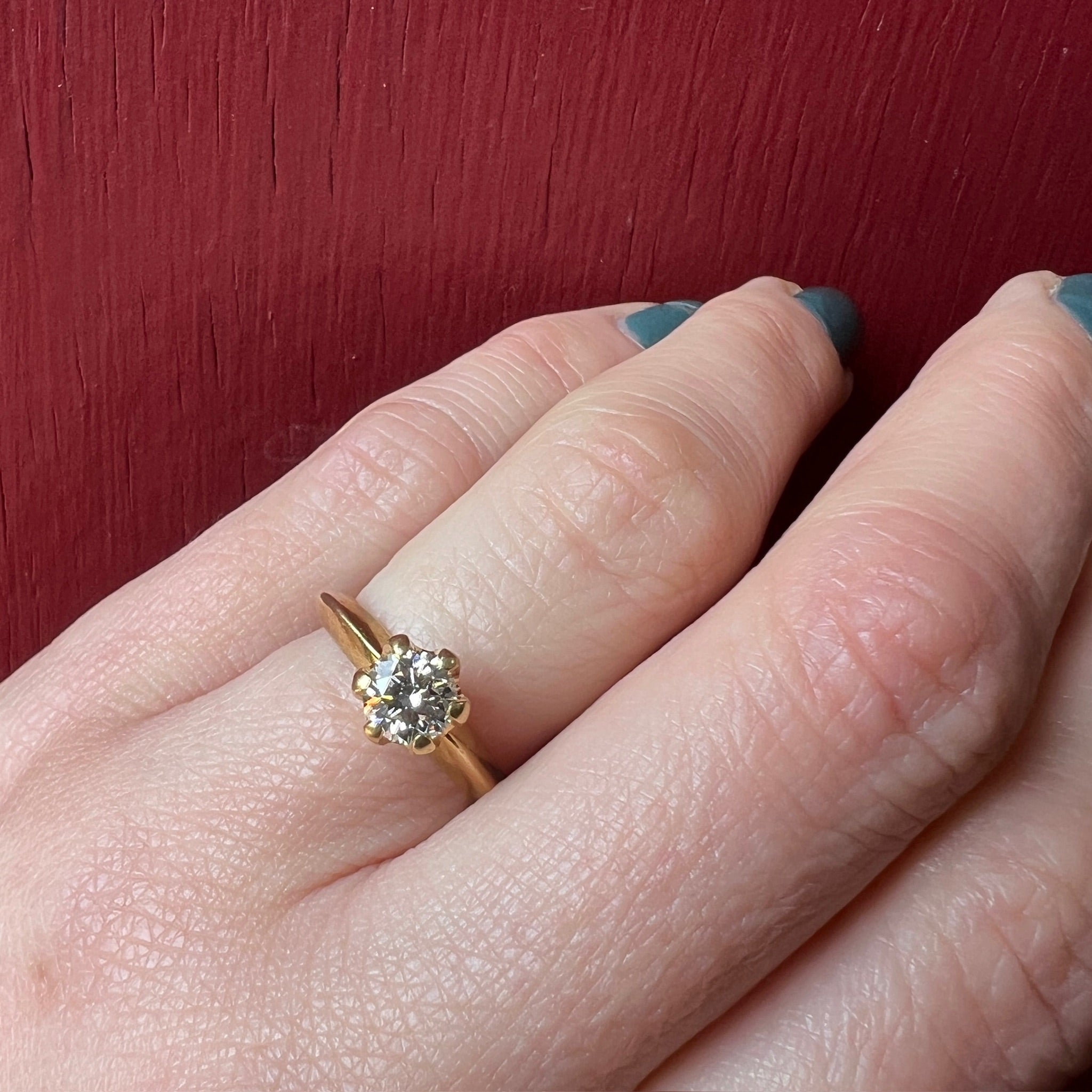 Details... Currently, size 5. One free sizing is included with the purchase. The engagement ring measures 7.1mm at the diamond, and the band measures 3mm. In Very Good Vintage Condition. You should always expect some wear on vintage and antique jewels; we consider it part of the charm.