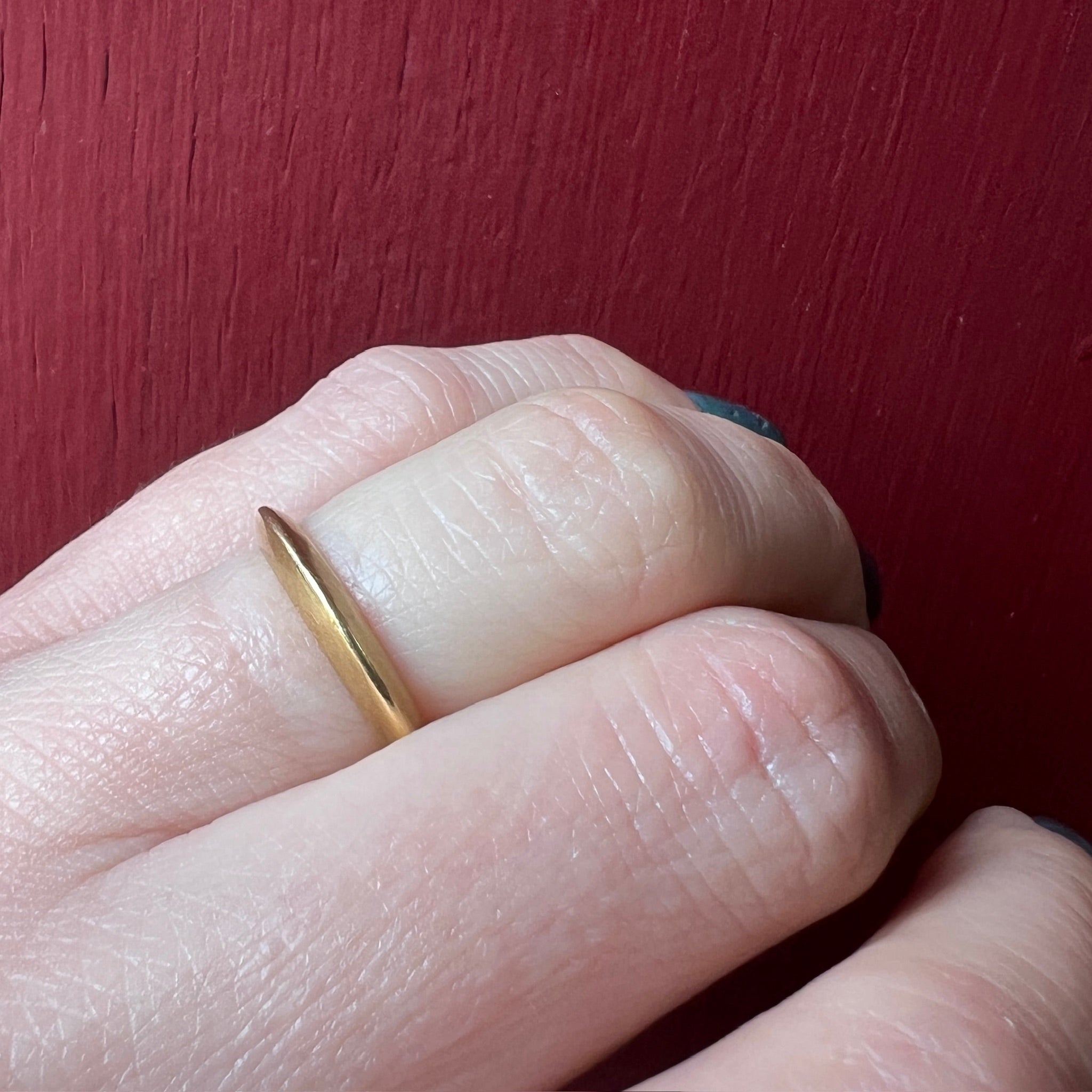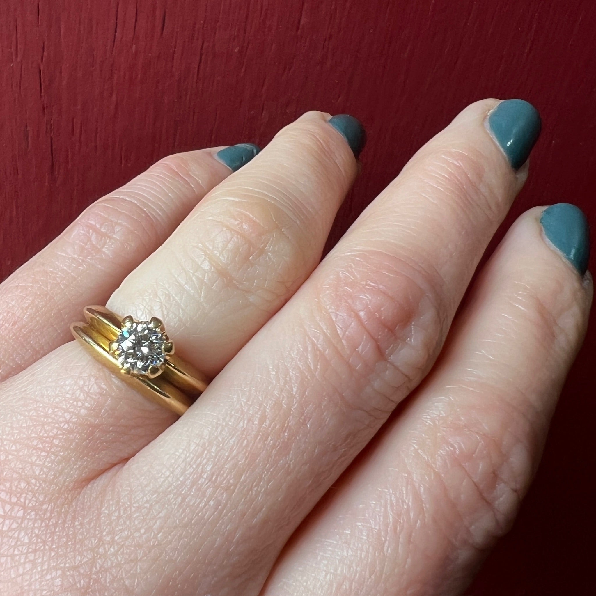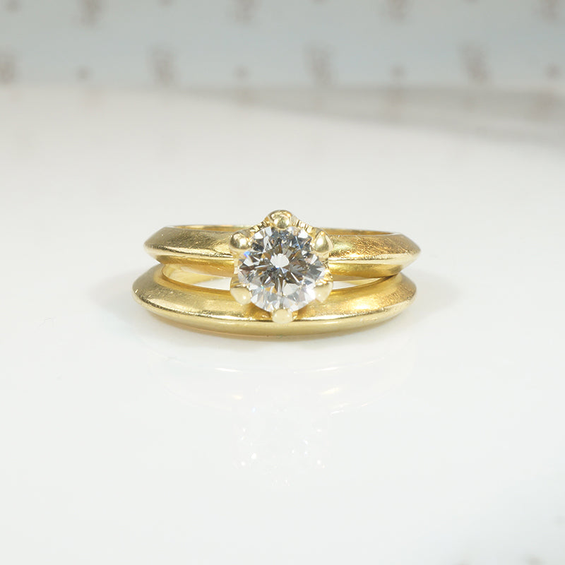 This set is a wonderful example of streamlined mid-century modern. The rich yellow 18k gold holds a bright white diamond in a very round 6-prong setting. The band is a sculptural crescent shape that comes together in an edge, and the wedding band matches this profile perfectly. This seemingly simple design is beautiful and elegant. Circa 1960.