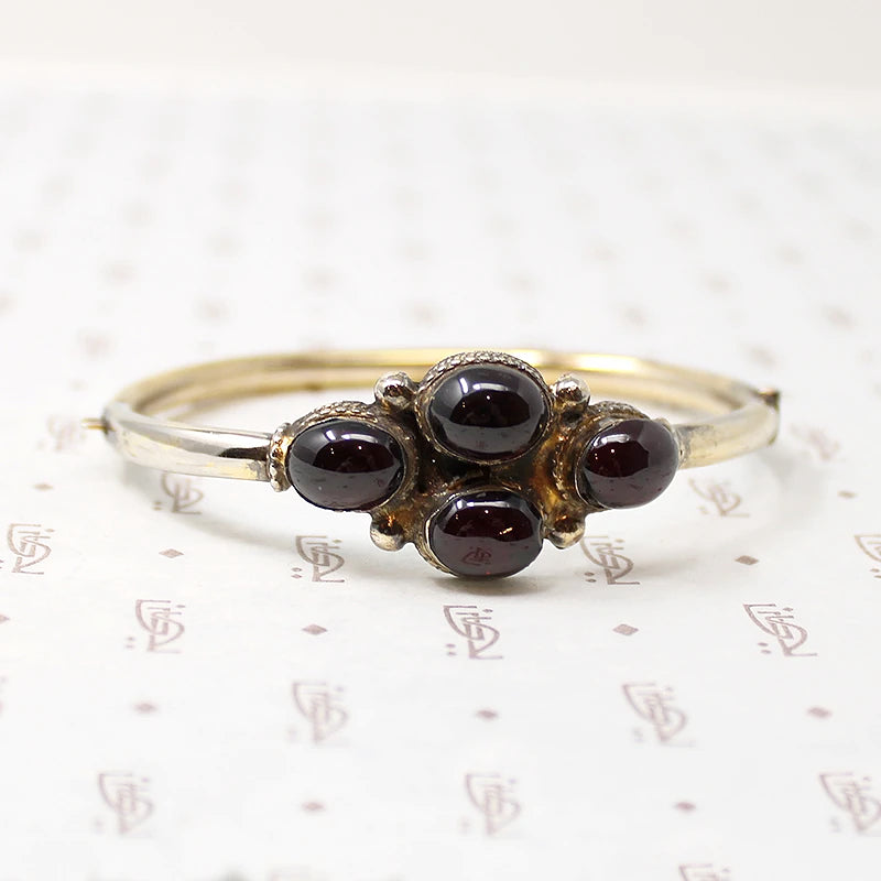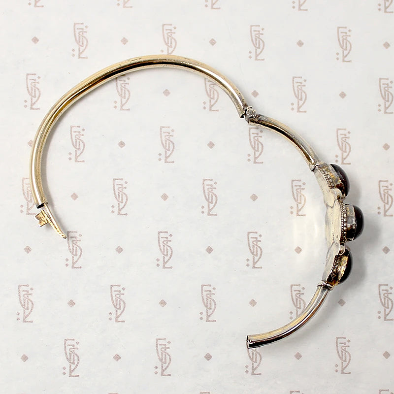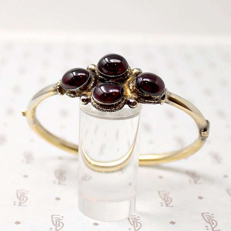 This gorgeous silver gilt bracelet is set with four lush cabochon garnets. The hinged bangle glows with a wash of gold over silver. The wine-dark garnets are bezel set over the back of the wrist in an elongated quatrefoil pattern. The decorative top of the bangle has lovely metal work details, and the bezels are engraved. This bracelet fits a medium sized wrist. Circa 1970.
