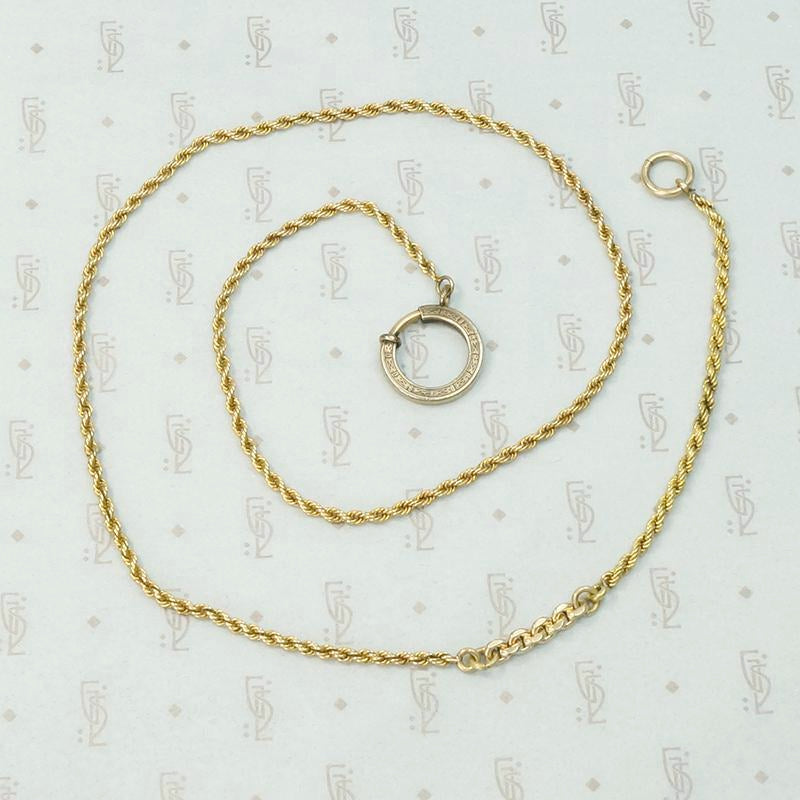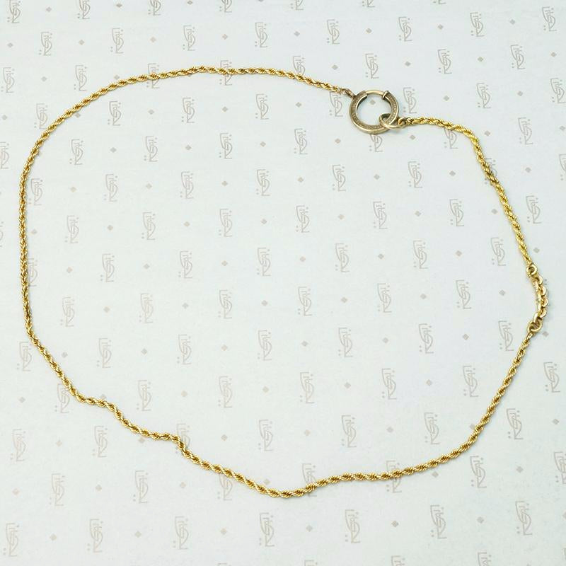 This simple and elegant necklace has a lot of subtle detail going on. 14k yellow gold twisted rope chain is accented by a short segment of gold filled fancy links and a rope chain bit. The chain is finished with a gorgeous oversized bolt ring. The engraved bolt ring is a lovely decorative element on its own, and it is perfect for attaching all of your favorite charms and pendants. The ingredients of this necklace date from circa 1880-1920.