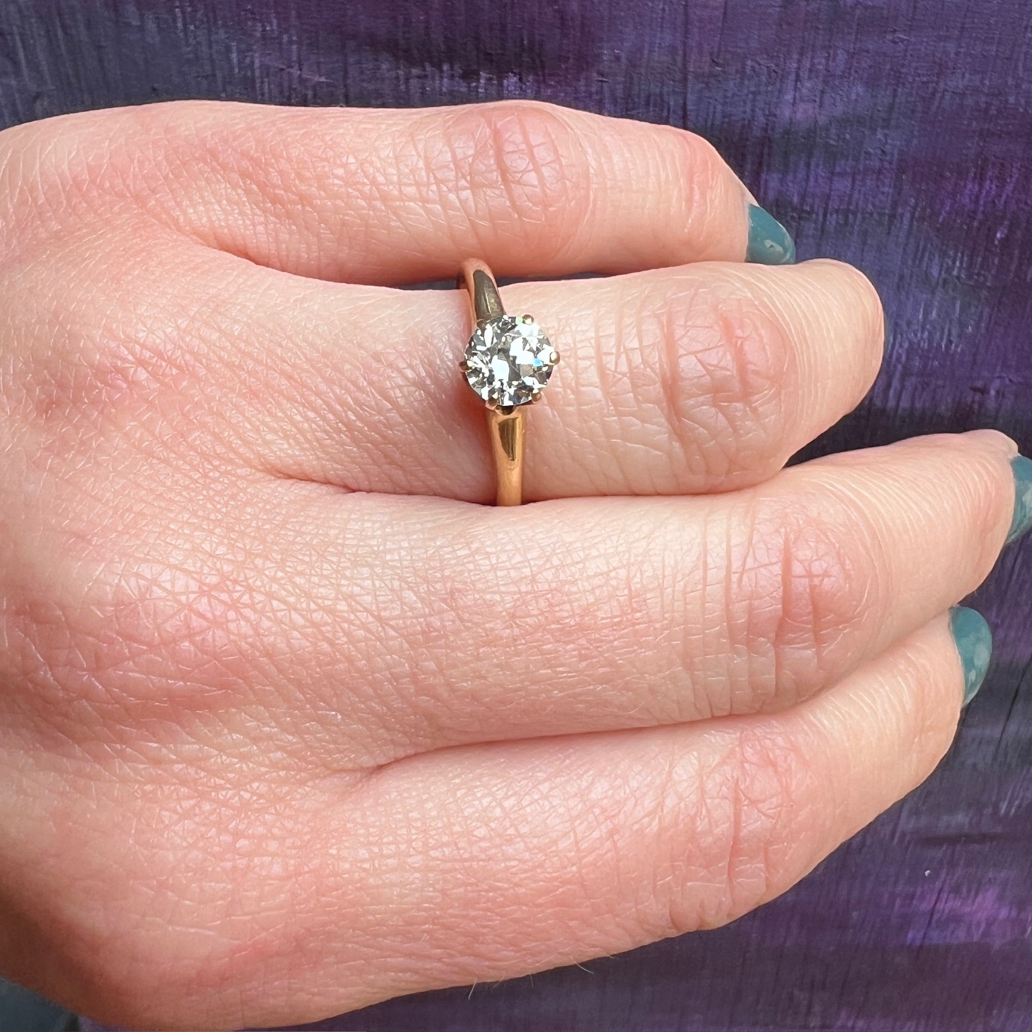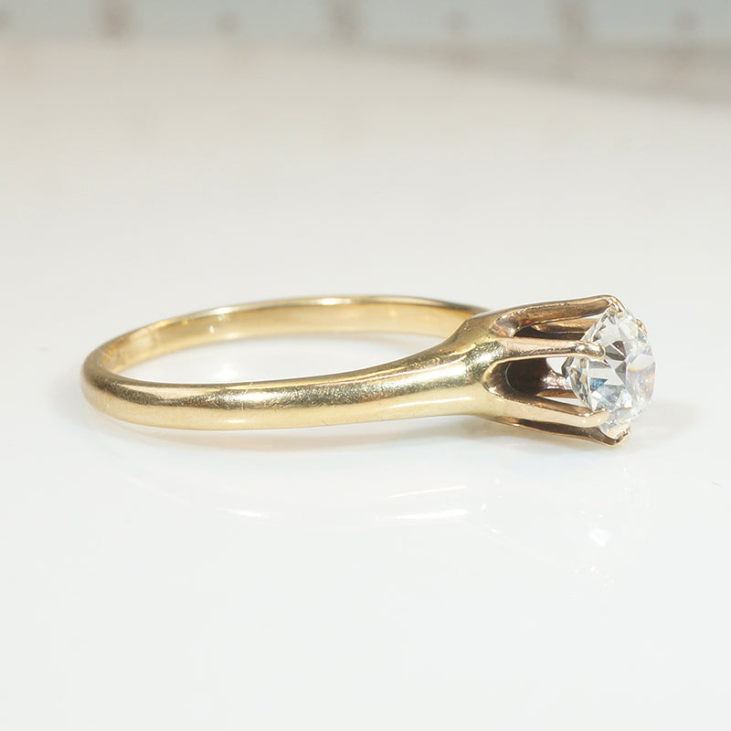 The old euro diamond in this late 1800s solitaire is beautiful and sparkles brightly. The 14k yellow gold solitaire sits high, and the diamond is held by six prongs. Circa 1890.