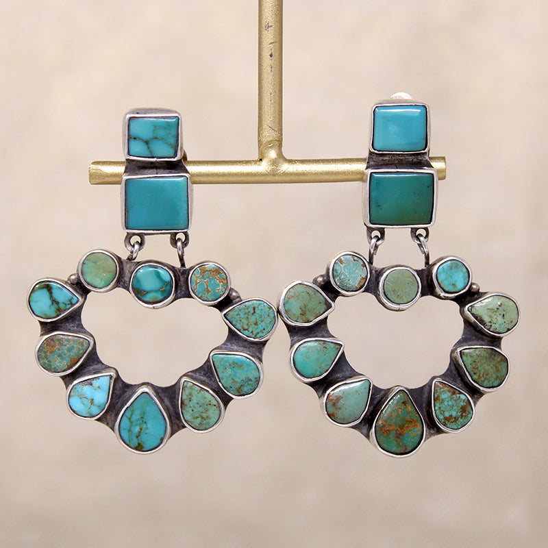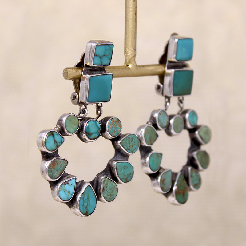 It's summer dress season, and these gorgeous earrings are the perfect accessory for long walks on a sunny beach. Round and teardrop-cut turquoise set in silver bezels applied to flat silver hoops; the hoops are subtly heart-shaped. The fabulous natural turquoise displays an array of delightful blue and green hues. Silver jump rings suspend the hoops from the clip-on earring tops. Each top consists of two rectangular turquoise stones inlaid in silver. These signed earrings are surprisingly lightweight and comfortable to wear. Circa 1980.