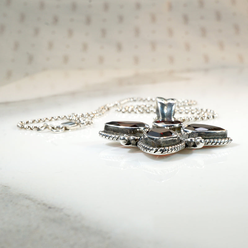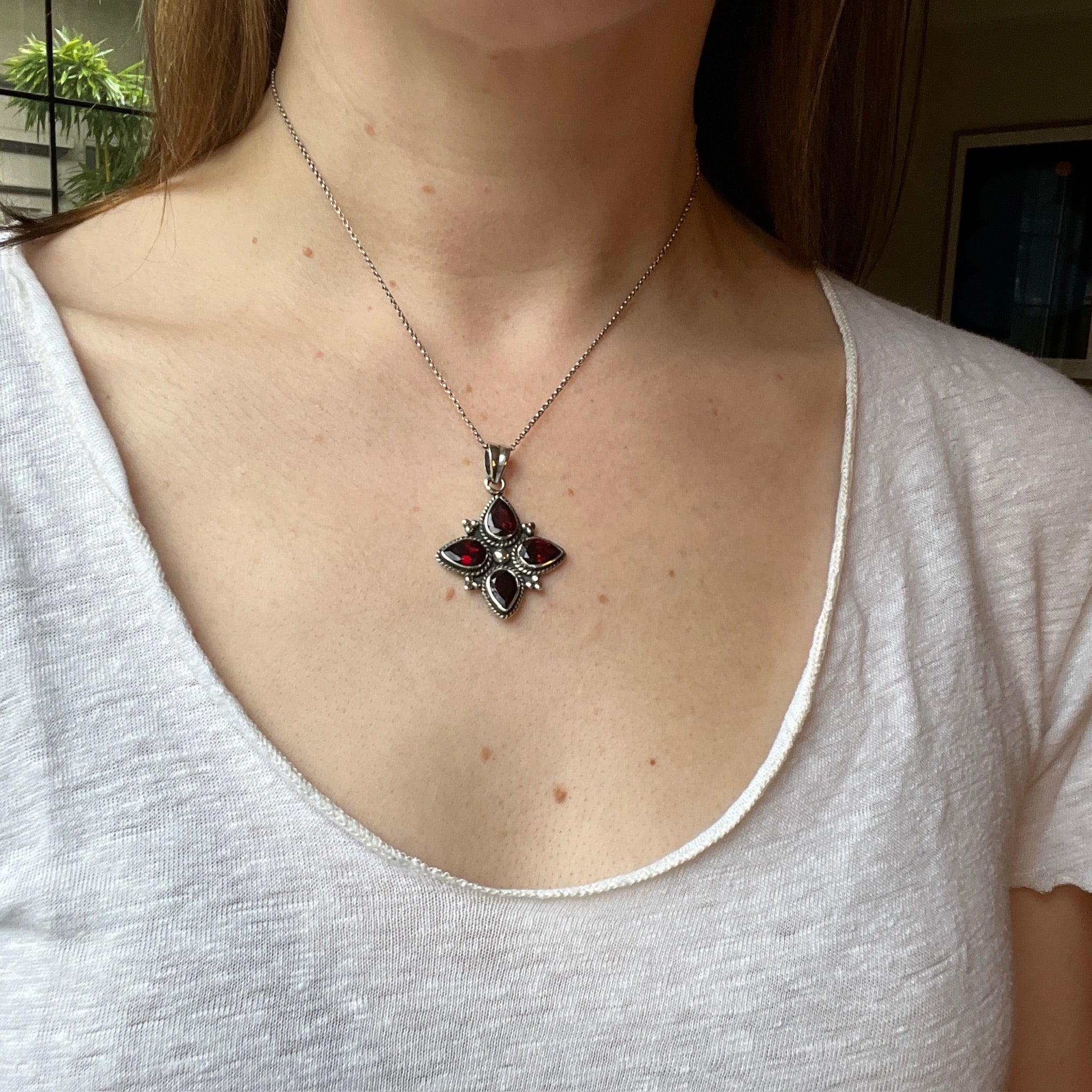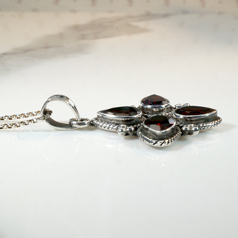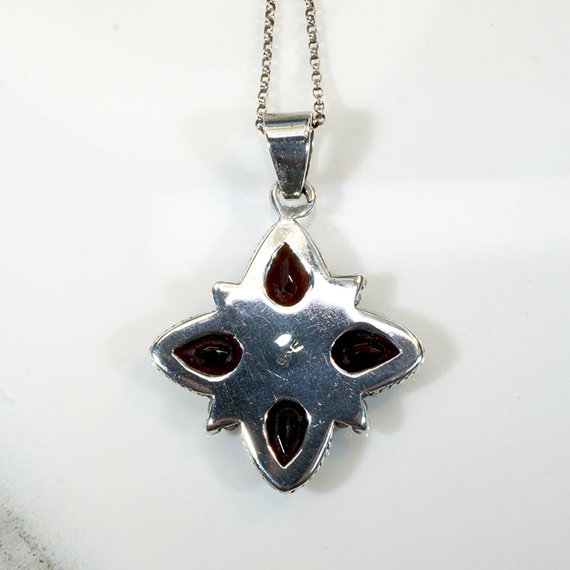 This sterling silver and garnet cruciform pendant has a dark Gothic glamour. Four pear-cut garnets are set at cardinal points in a silver setting. An "X" of twisted silver wire and beading marks the heart of the piece. Silver twist frames each sanguine stone. The pendant has a large decorative bale and hangs from a sterling silver cable chain. Circa 1960.