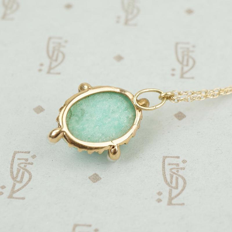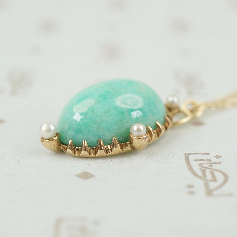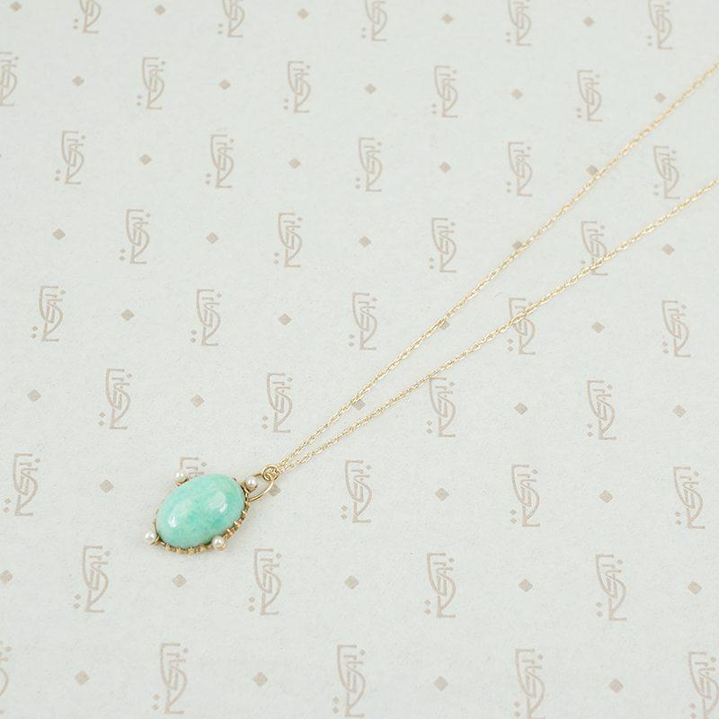 This pretty amazonite and pearl pendant is so classically lovely. The details, in 14k yellow gold, so timeless they allow the gems to take center stage. Amazonite is a favourite gem of mine, its color unique and pleasing, the gem was treasured in many early civilizations as well. Amazonite is a great stone to wear in the modern world too: it is believed to absorb microwaves and cell phone emanations, and defend against electromagnetic pollution. Circa 1900.
