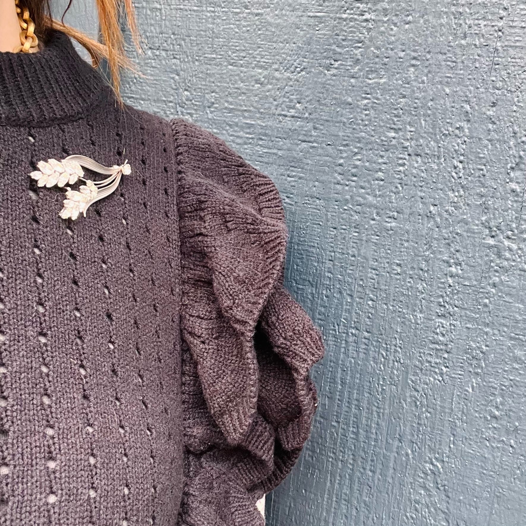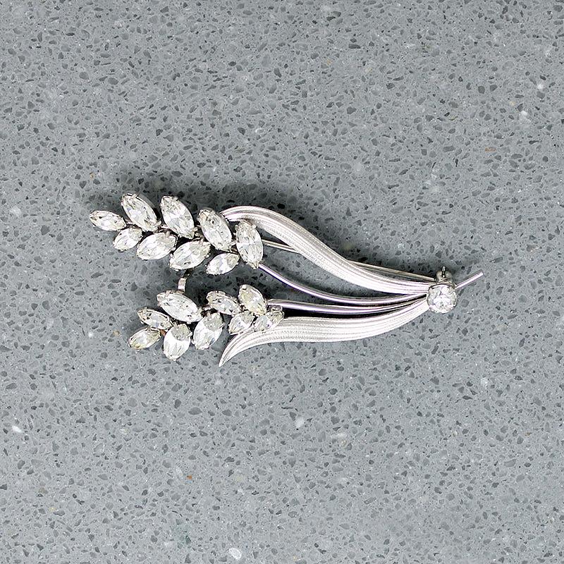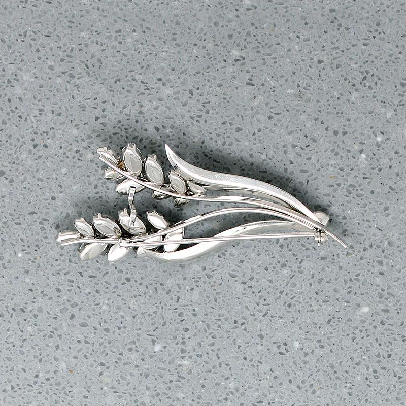 A charming costume nosegay brooch from Krementz. Graceful silver tone leaves and glittering round and marquis-shaped rhinestones create a cool and elegant effect. A nice, long security clasp makes this piece easy to wear on a variety of apparel. This brooch will add a delightful spark of glamour to the lapel of your favorite coat or blazer. Circa 1950.
