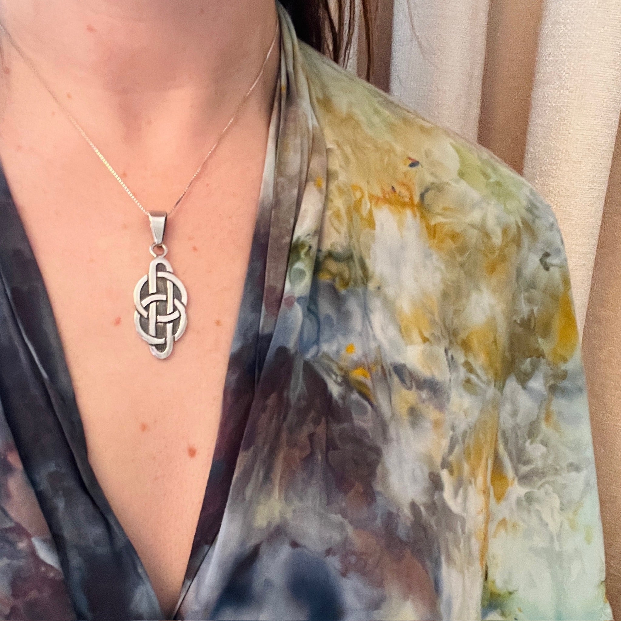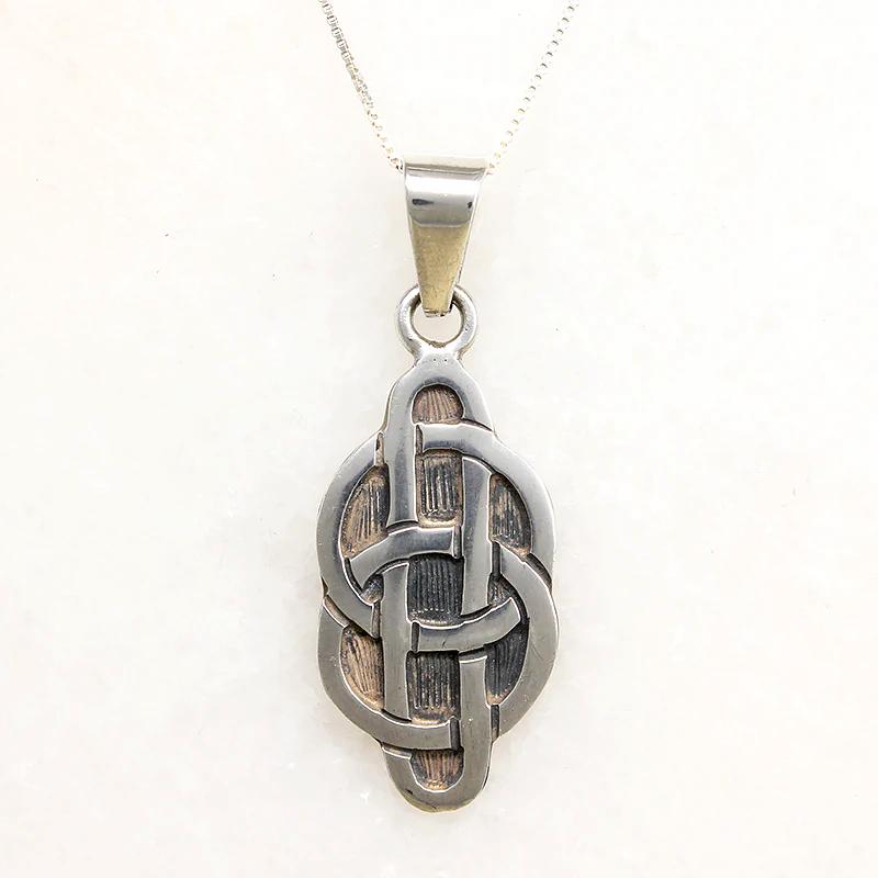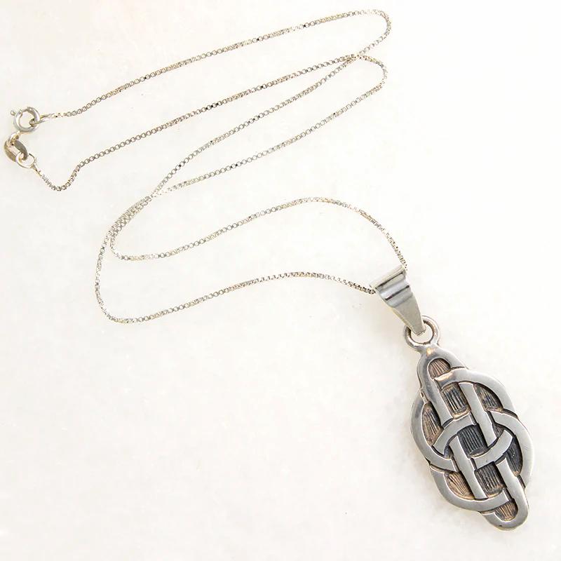 This Mexican sterling silver knotwork pendant is bold and graphic. Bright high points and oxidized, engraved low points give the piece an interesting three-dimensional quality. The pendant hangs from a large bale on a modern sterling silver box chain. This piece is New Old Stock, true vintage that has never been worn. Marked on the back "TM-253 Mexico 925." Circa 1980.