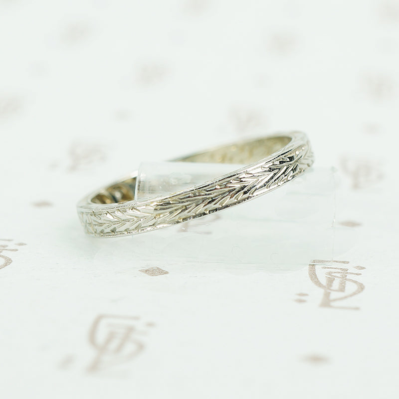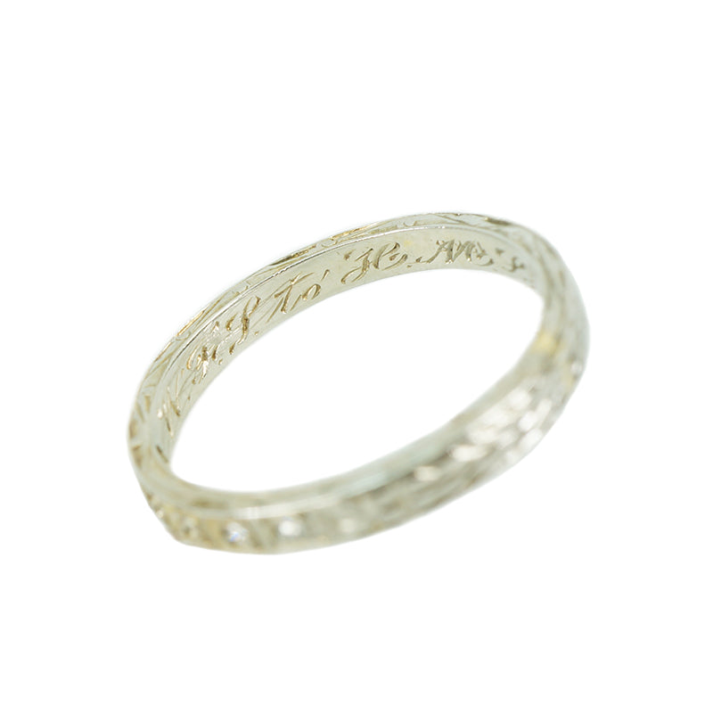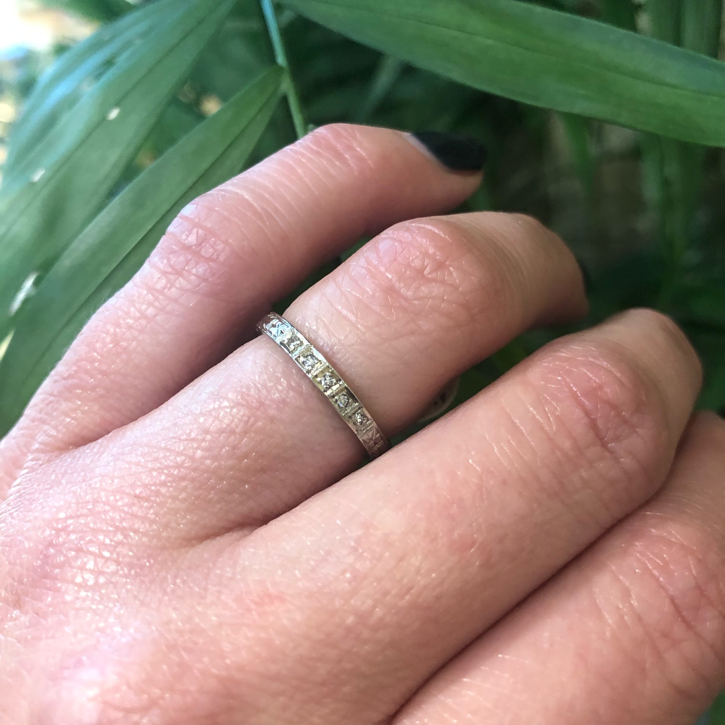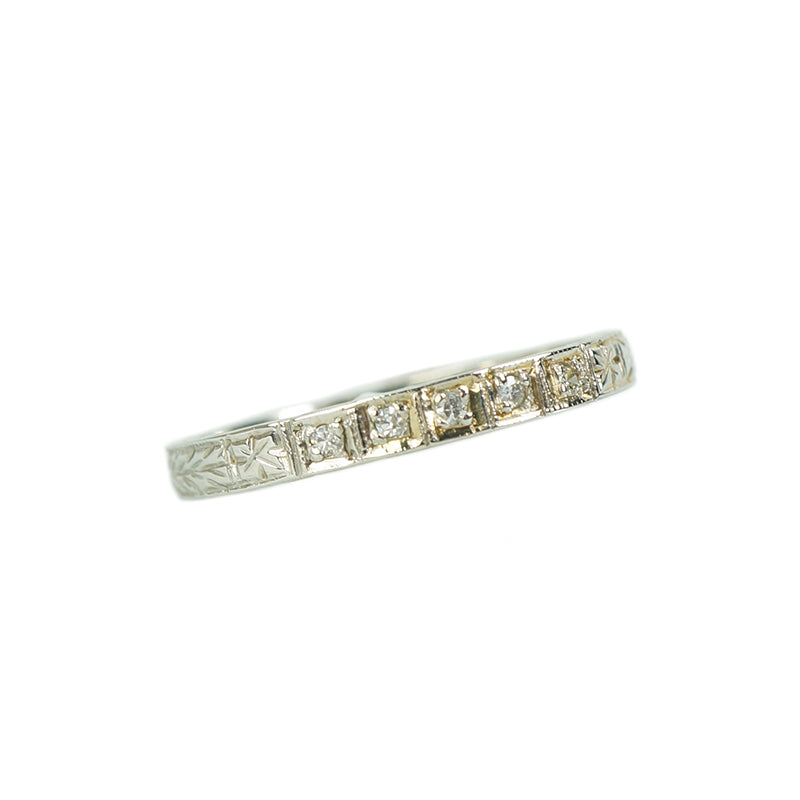 Five tiny diamonds grace the front of this 1920's engraved 14k white gold band. The sides are covered in engraved details and the design is perfect to stack or wear with your engagement ring.