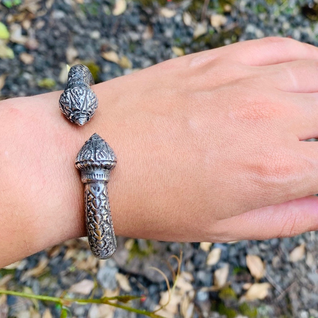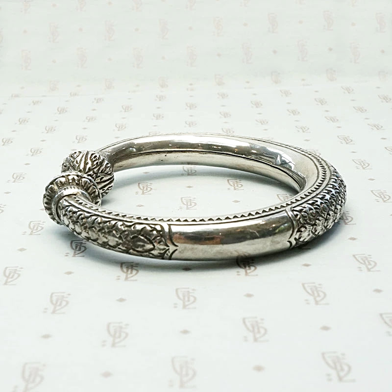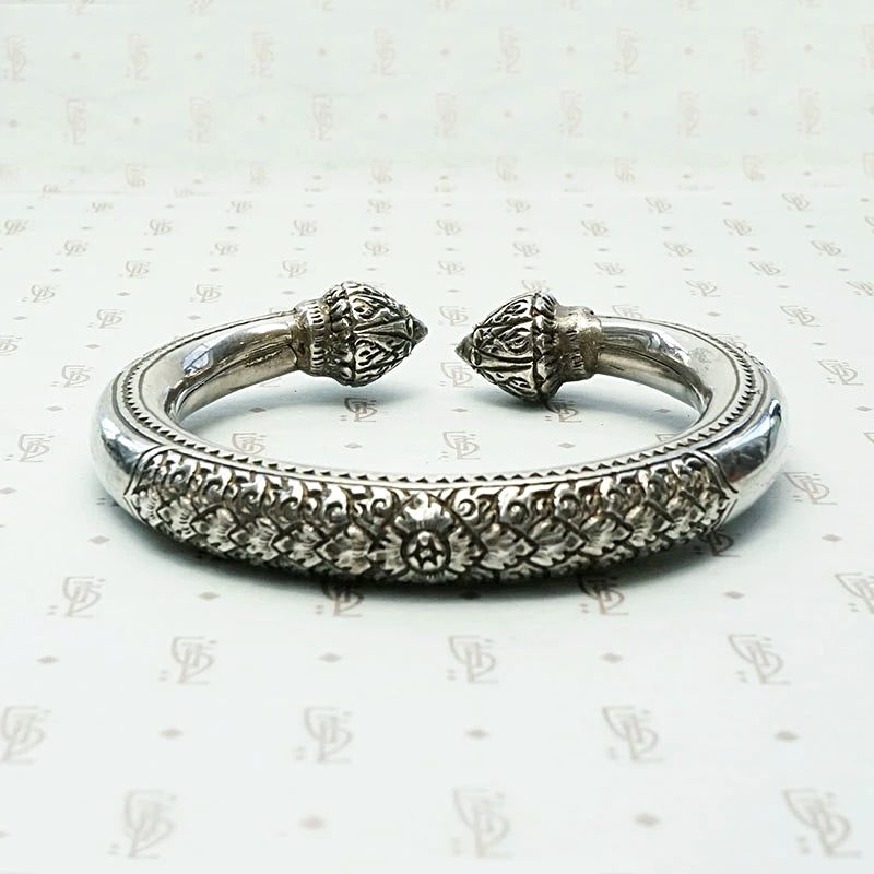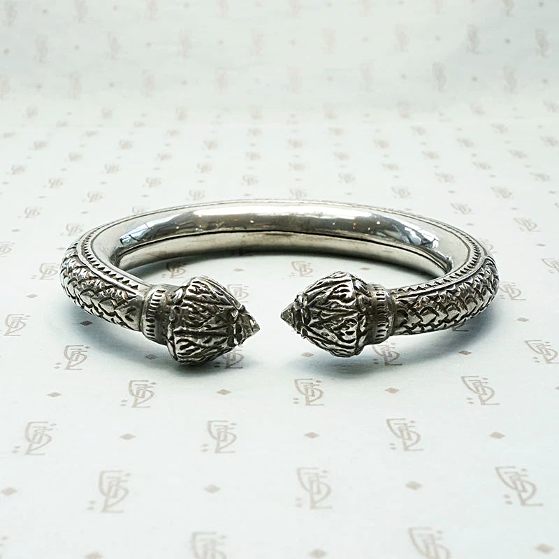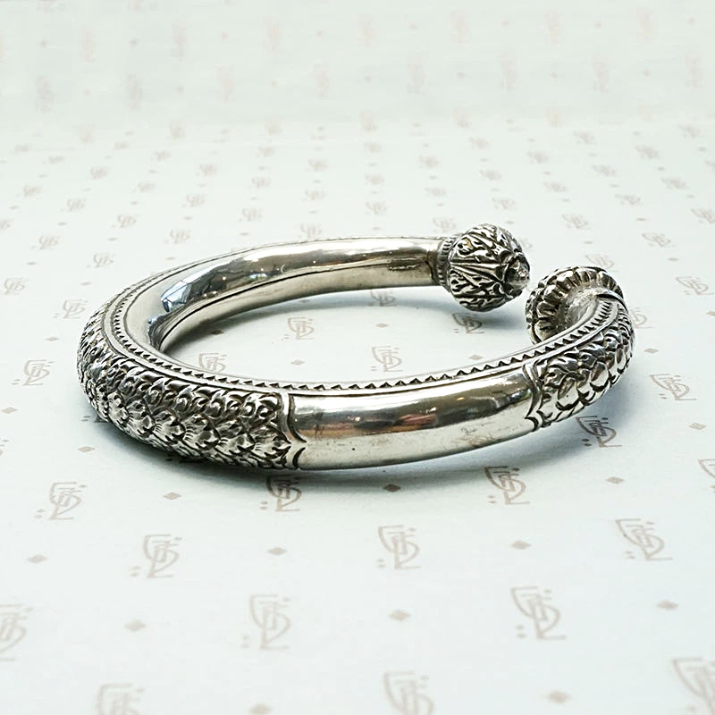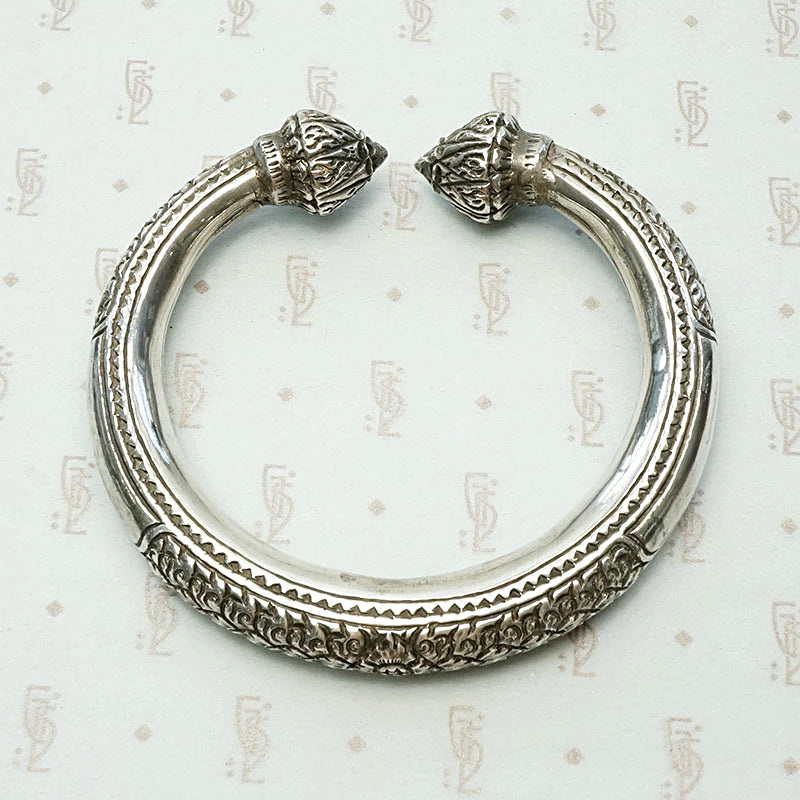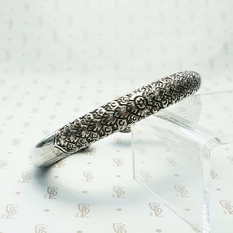 This fabulous Indian bracelet is so beautifully hand engraved. The 800 grade silver bracelet is decorated with an elaborate floral paisley design. The cuff tapers down to terminals that resemble flames. The interior of the cuff shows a seam. Delightfully dramatic, this bangle makes a statement. Circa 1920.