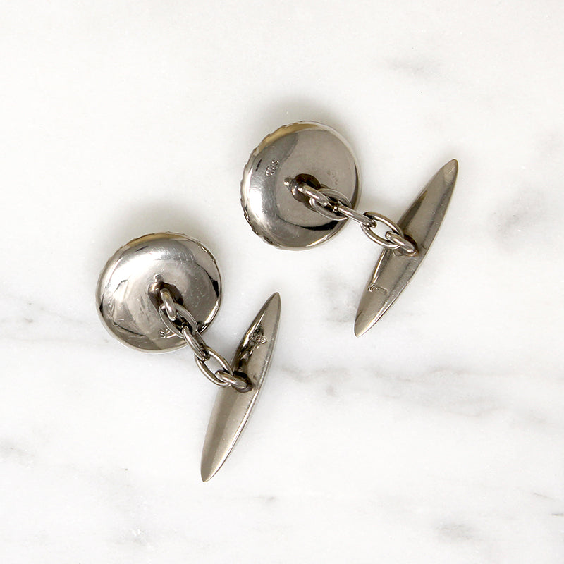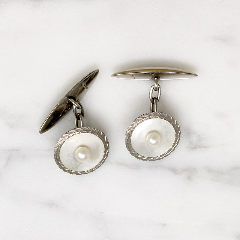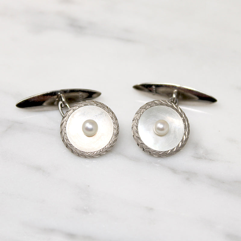 These handsome cufflinks have round faces of pearl-studded mother of pearl, framed in engraved silver tone costume metal. The chain link cufflinks are lightweight and easy to wear. Each foot is marked "SPM." The perfect accessory for the groom's wedding suit. Circa 1960.