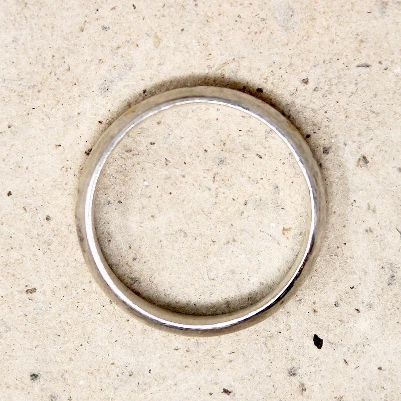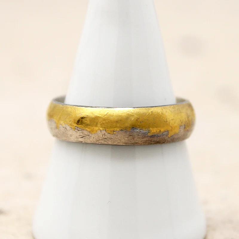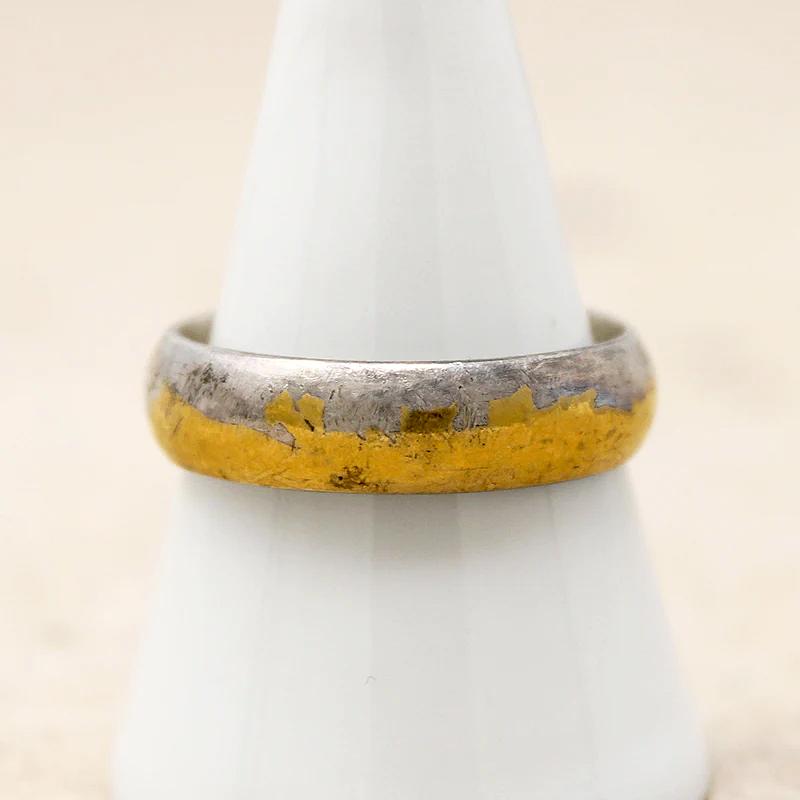A handsome sterling silver band with applied 24k gold leaf from The Acanthus Collection. This silver band has a classic half round exterior with a flat interior. Decadent gold leaf is applied to half of the band in an uneven, irregular way. Gold leafing is a surface applications, this ring should be worn gently to preserve the look.