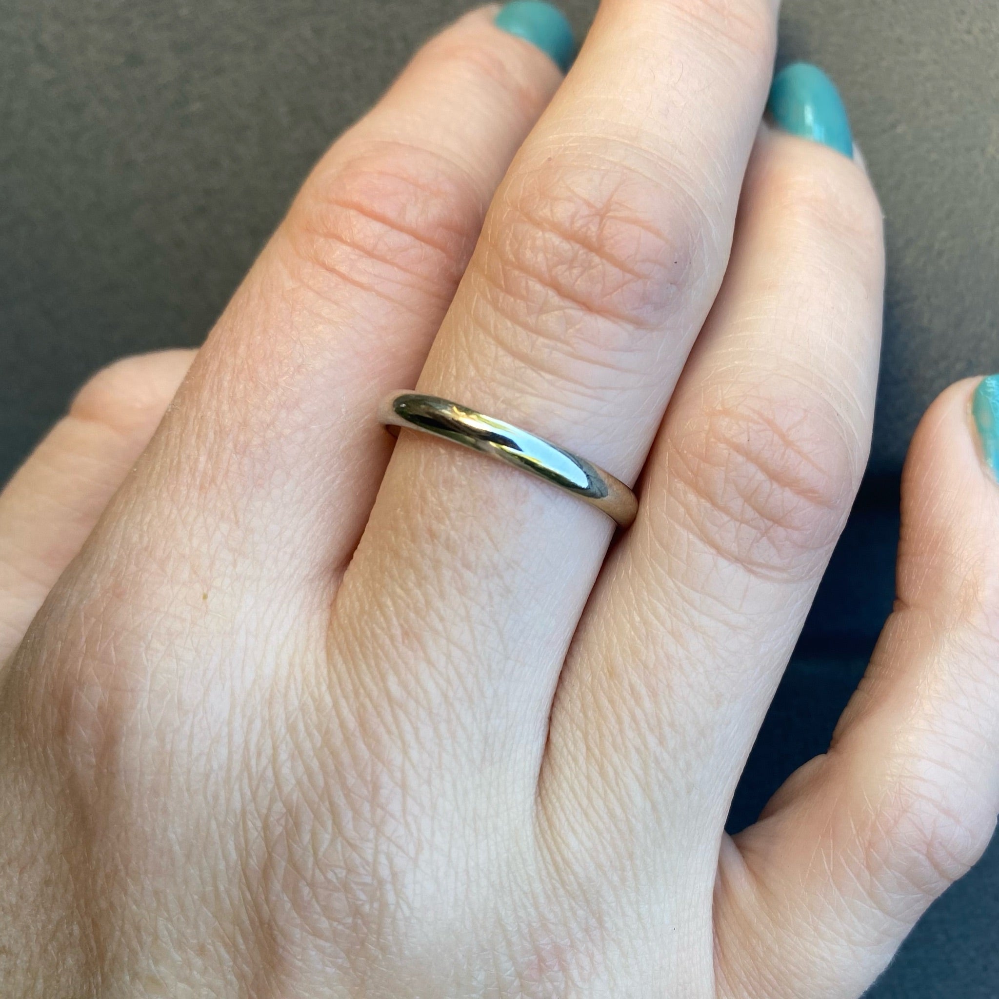 This classic European 18k wedding band is lovely, the white gold pleasingly warm-toned. The narrow band has a flat interior and a half round exterior. A European hallmark is located on the exterior of the shank. A handsome band in a hard to find larger size. Circa 1940.