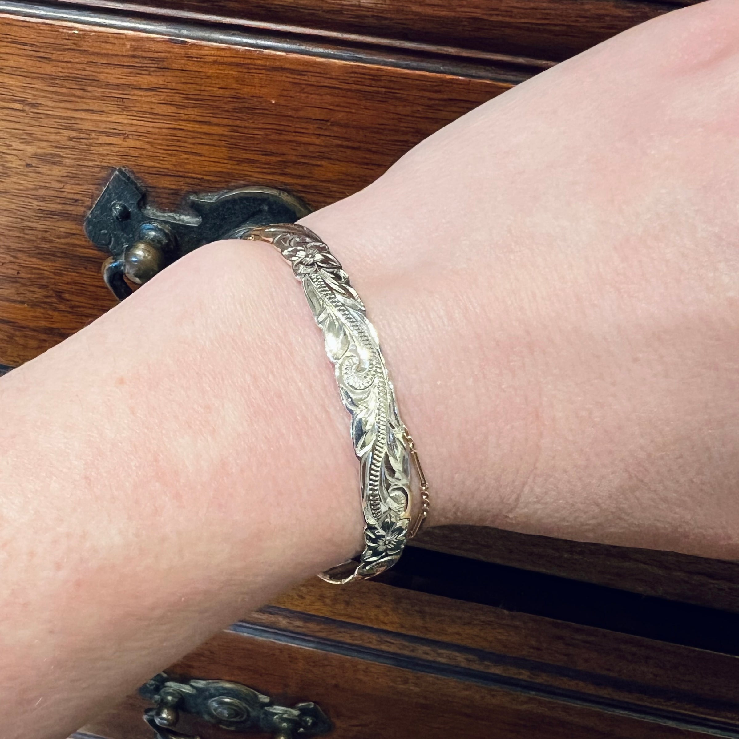 Hawaiian Pua Kala flowers embellish this sterling silver bangle bracelet. Luxuriant tropical foliage is engraved around the shiny silver bracelet. This piece is New Old Stock, true vintage that has never been worn. Add a touch of island romance to your favorite beachy summer dress. Circa 1980.
