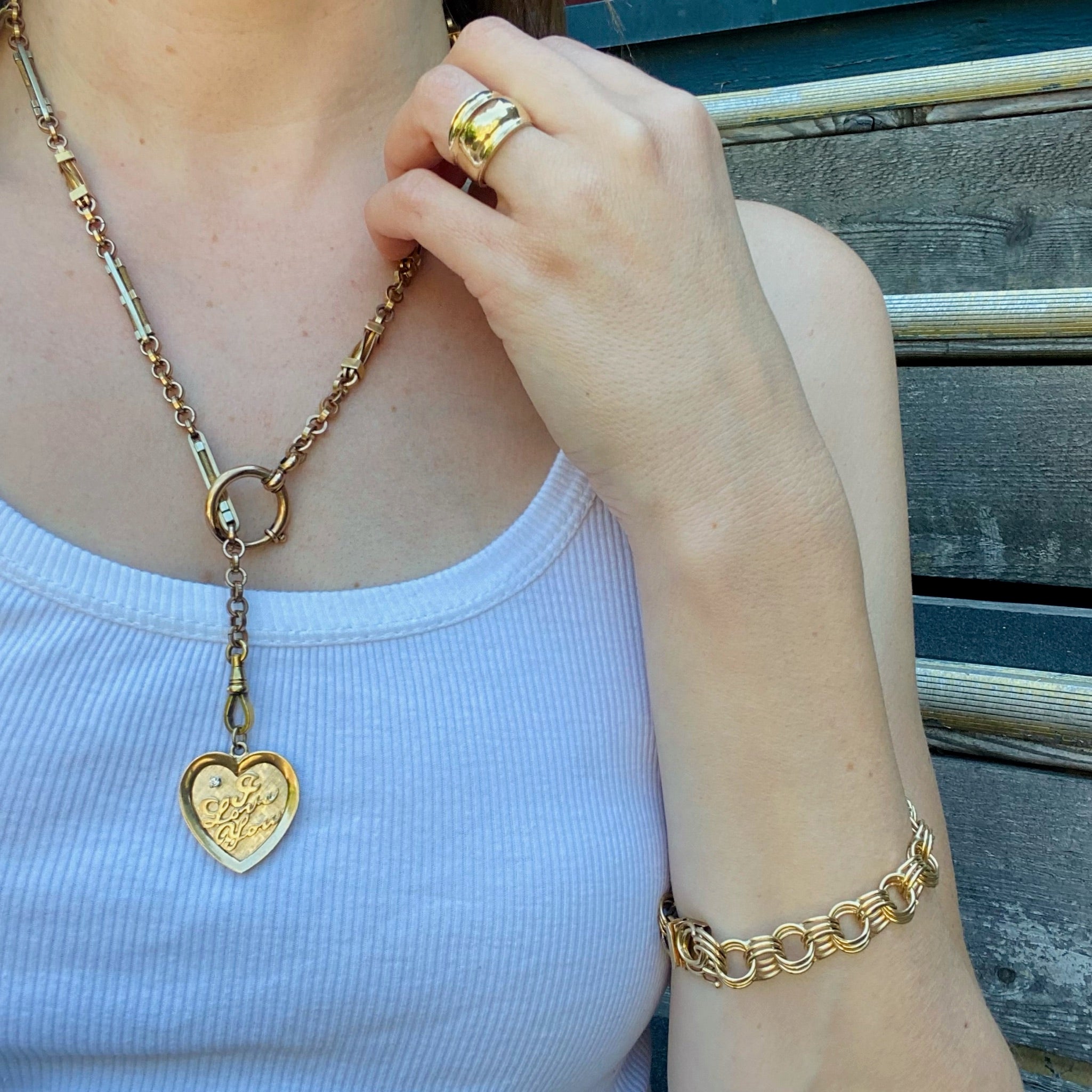 A sweet little love token engraved with a personal message of Christmas romance. The front of the heart-shaped 14k gold charm is decorated with the words "I Love You," carved in relief on a field textured with Florentine engraving. A wee diamond sparkles in the top corner. The back of the charm is hand engraved with the inscription "Christmas '76 Love Alan." The pendant has an integrated bale with a 14k jump ring attached. This is a fun, sweet piece with that sassy flair the 1970s were known for.