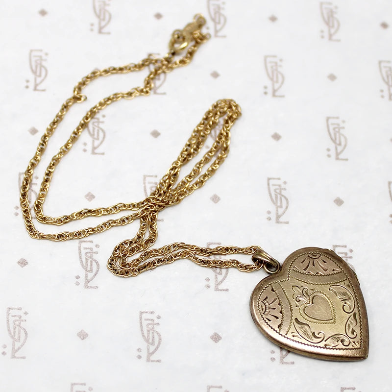 The front of this heart-shaped gold filled locket is engraved with leaves, flowers and a crowned heart. The back is pinstriped. The interior is in good condition with no frames. This locket has a decorative bale and hangs from a vintage gold filled rope chain. Circa 1920.