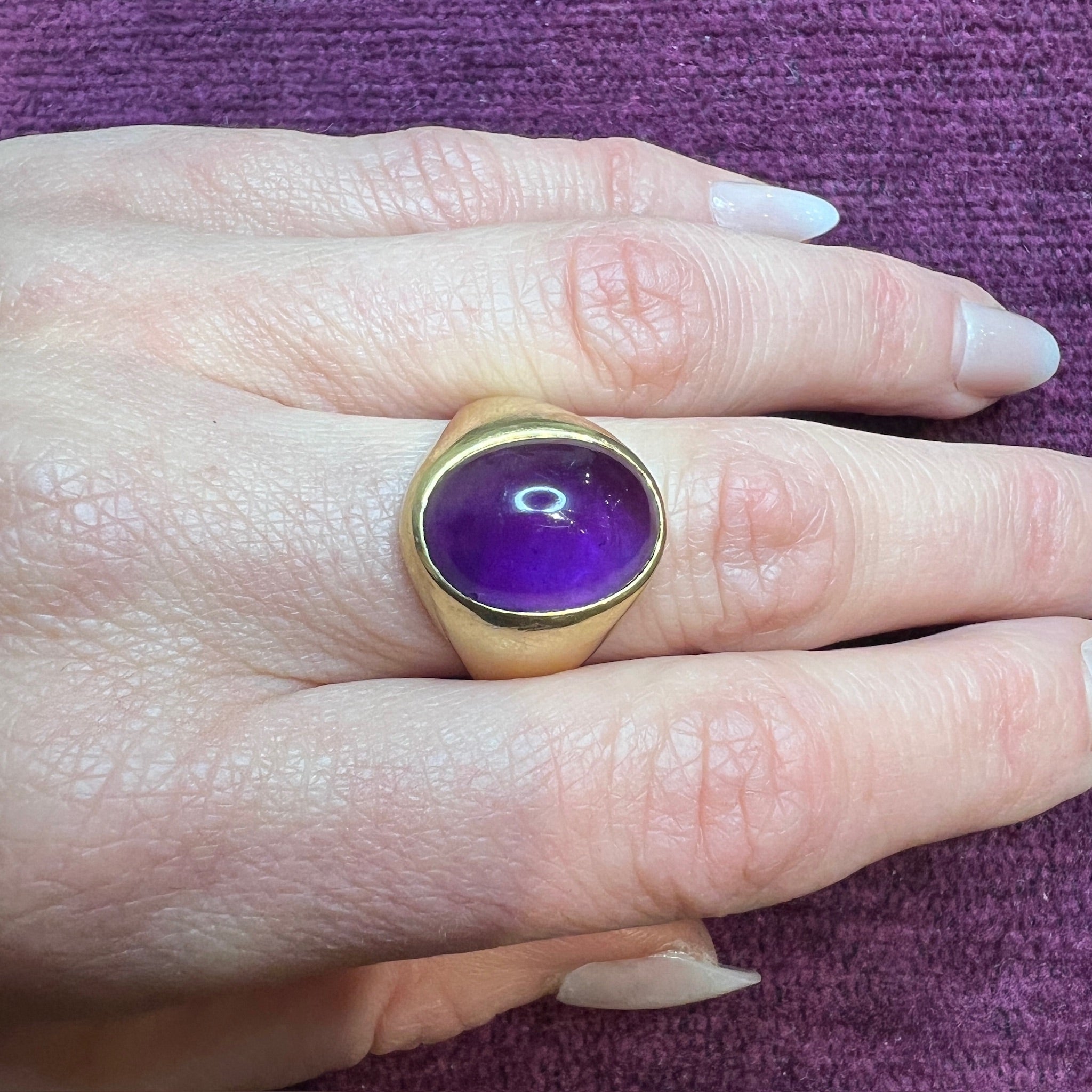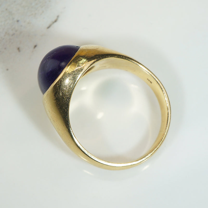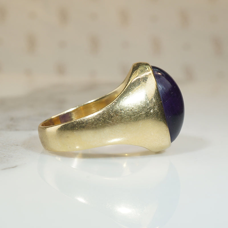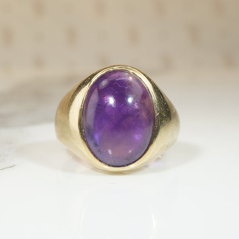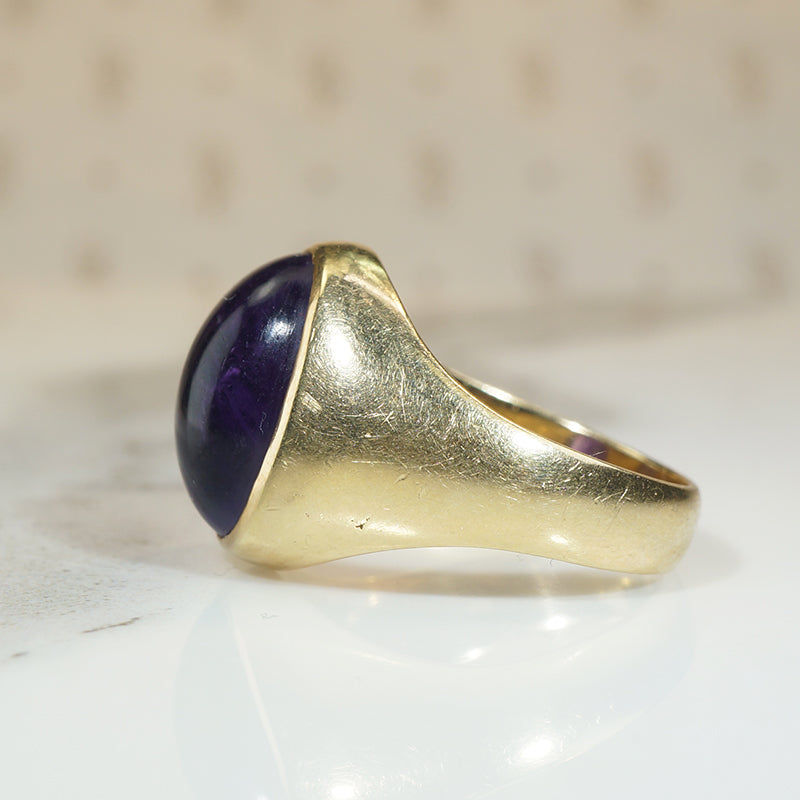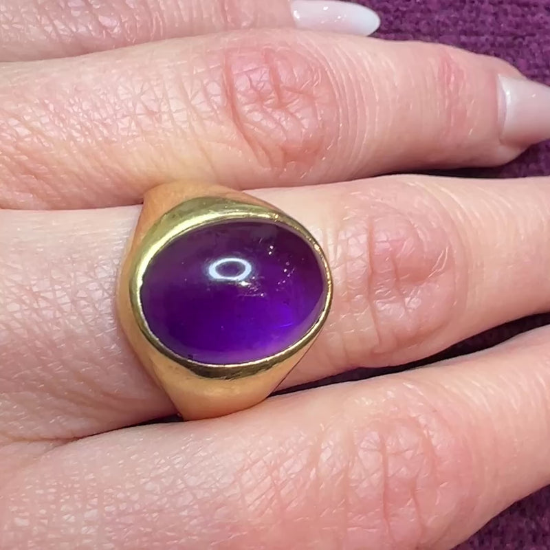 This chunky 14k yellow gold signet style ring is set with a saturated purple amethyst cabochon. The curves of the gold hold the amethyst following the curves of the gem itself. I love vintage rings that are obviously created especially to hold their gem. This ring feels wonderful to wear and dates from the 1950s.
