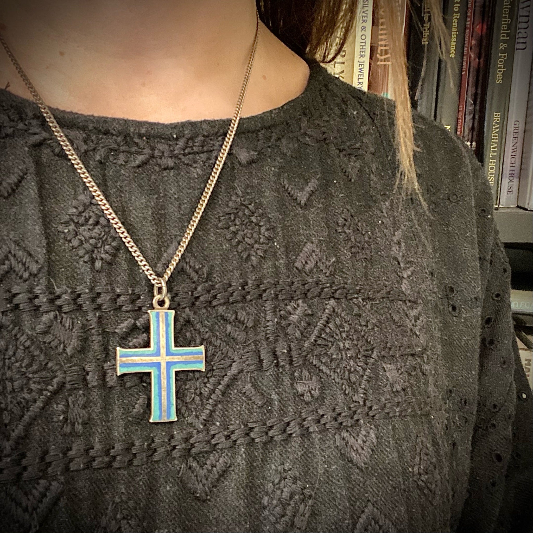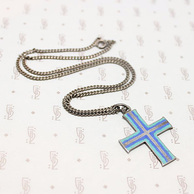 This colorful vintage cross is unusual. The high grade 935 silver cross is enameled in blue and teal. It hangs on a substantial vintage sterling curb chain. The integrated bale and added jump ring allows the piece to be worn on a different chain or a ribbon should you choose. The back is marked with an interesting makers mark that appears to be an A and J inside a shield.