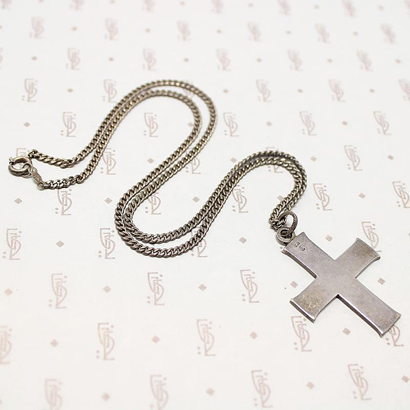 Details.....The cross measures 1.2" wide and 1.43" long, 1.85" with bale. The sterling silver chain is 19" long. In Very Good Vintage condition. You should always expect some wear on your vintage and antique jewels, we consider it part of their charm.
