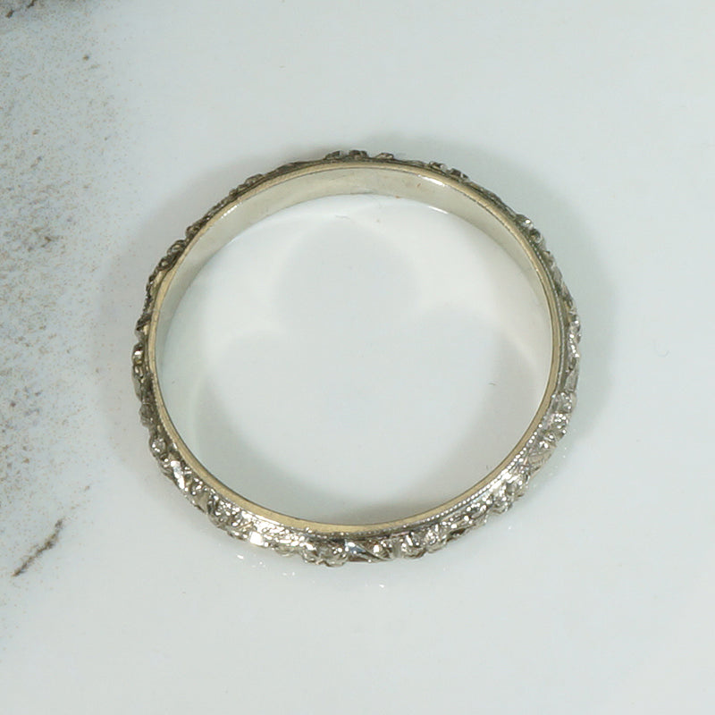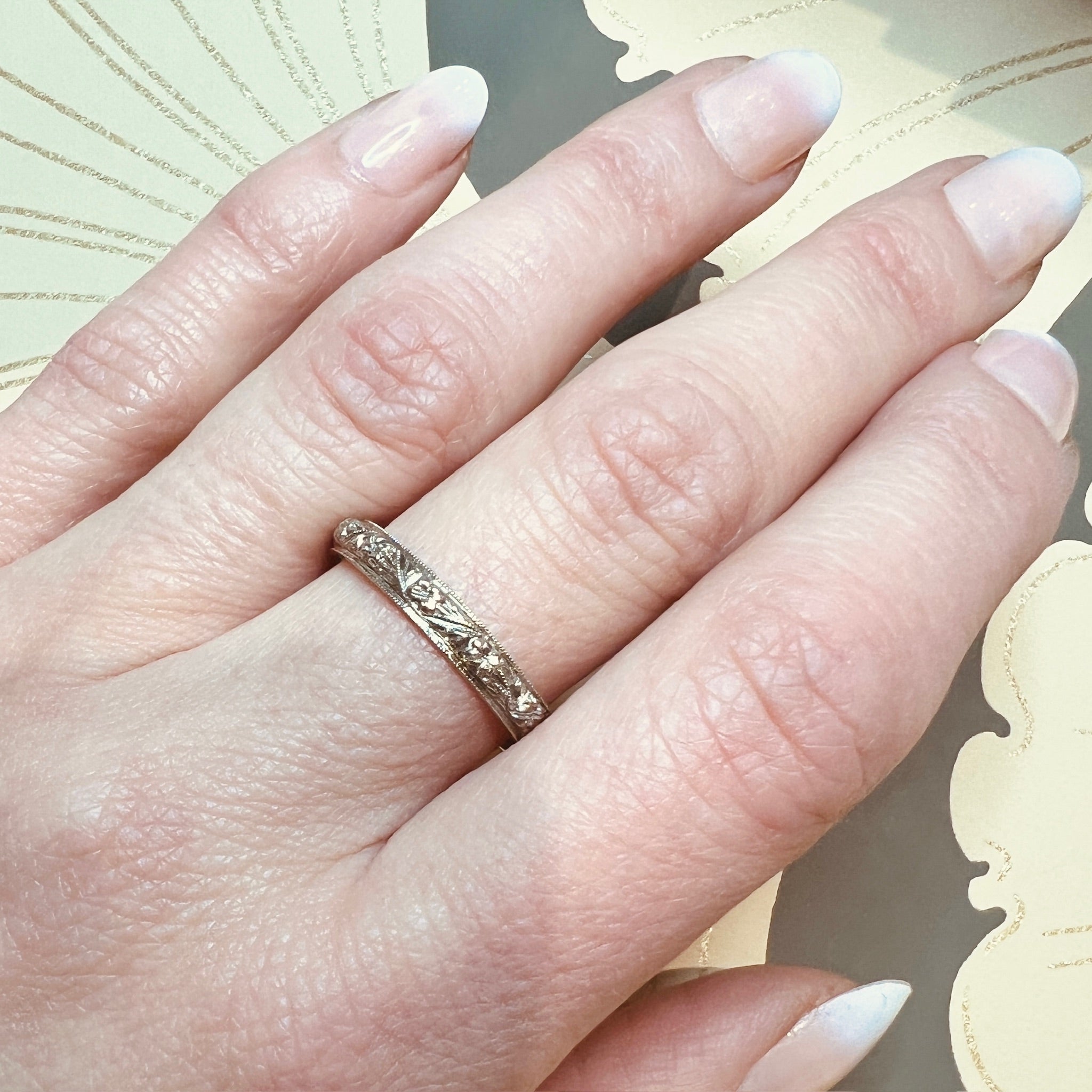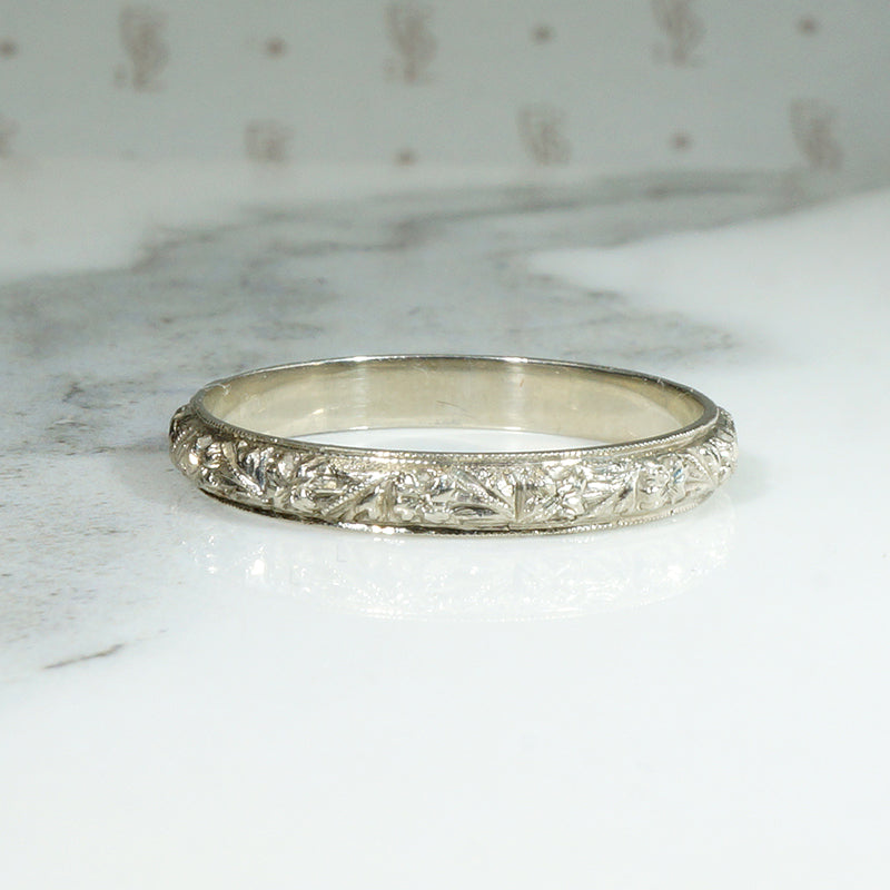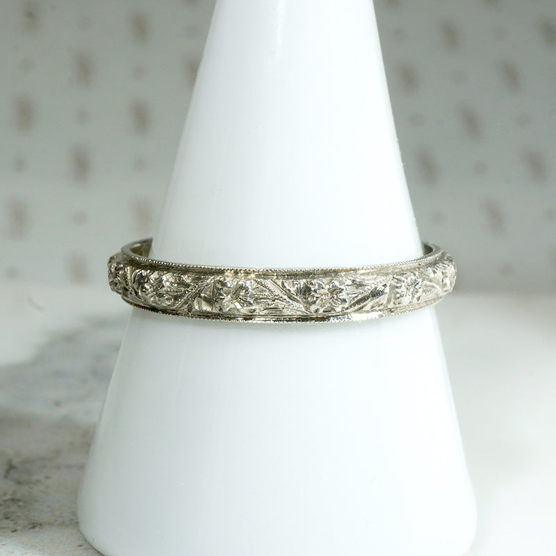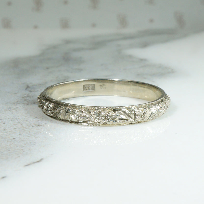 Twisting garlands of flowers and laurel leaves decorate the gently curved surface of this excellent men's wedding band. The highly detailed 14k white gold band has a half-round exterior covered in a crisp engraving with a milgrain edge. The interior is marked "UR14K." Very rare to find a patterned wedding band like this in a large size. Circa 1920.