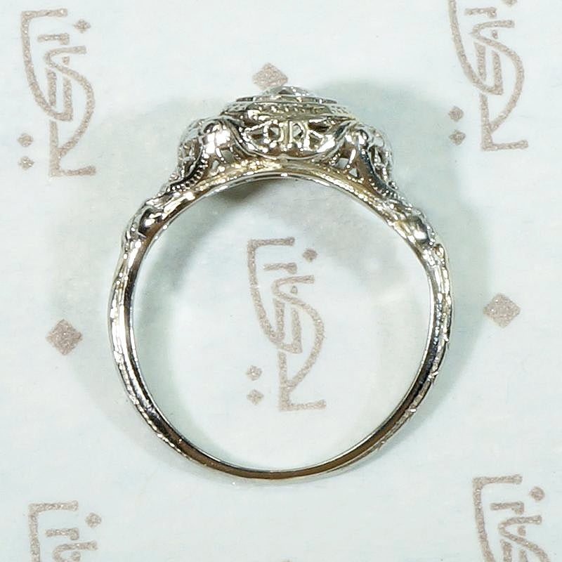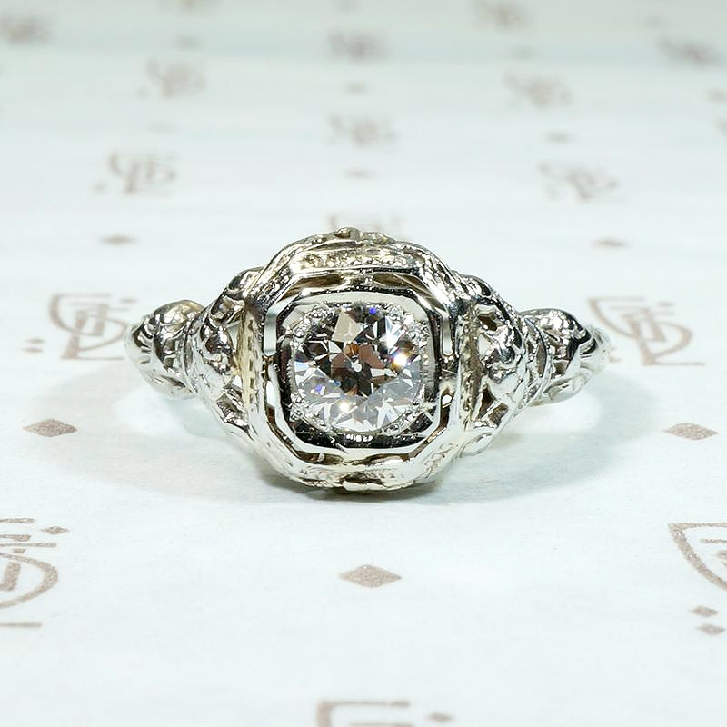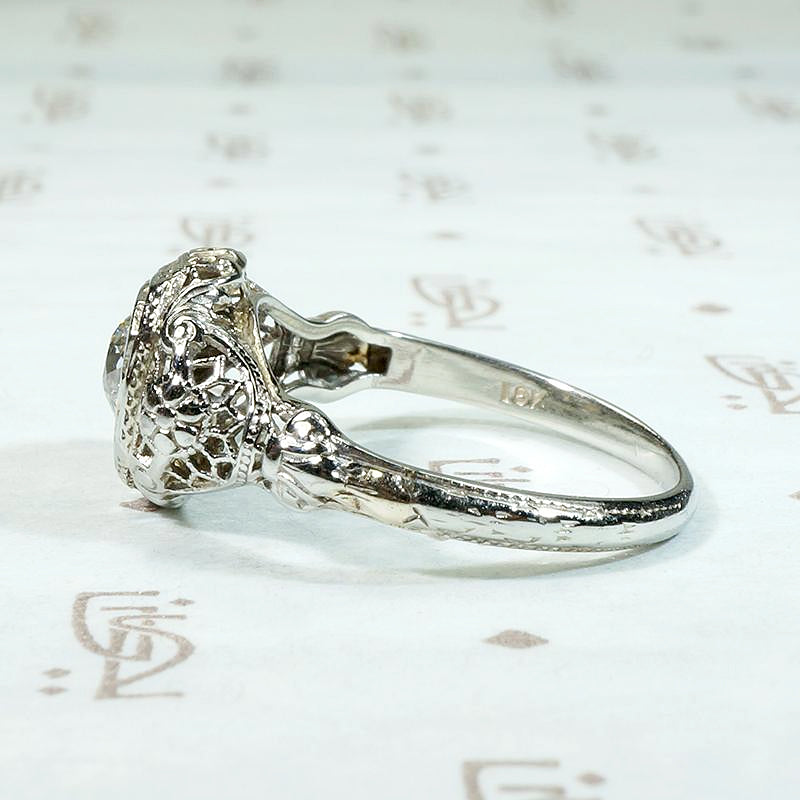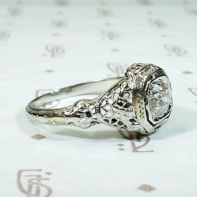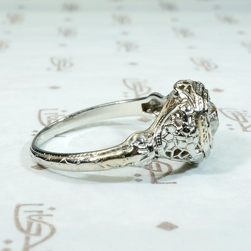 Lacy filigree and fine details elevate this 18k white gold engagement ring. A very pretty approximately 0.40ct old European cut diamond sits in an engraved head. The shoulders have a filigreed lattice work structure with an engraved daisy at their centers. The elegantly arched gallery is rich with wonderful filigree detail and the engraved band tapers back to a slim shank. Puffy filigreed engagement rings like this one pair beautifully with our Recycled Revival curved wedding bands. Circa 1920.