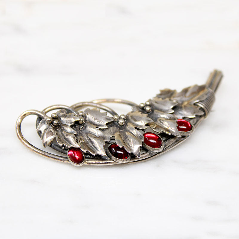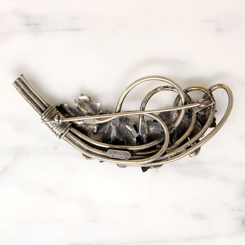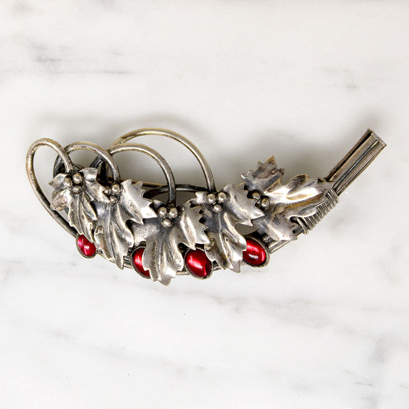 A festive nosegay brooch featuring a spray of holly leaves and berries modeled in sterling silver. Red glass cabochons nestle amidst the naturalistically sculpted foliage. The brooch fastens with a nice long pin that works well on heavier fabrics. This wonderful piece is signed on its back, "Joseff Hollywood." The perfect accessory for the rapidly approaching holiday season. Circa 1940.
